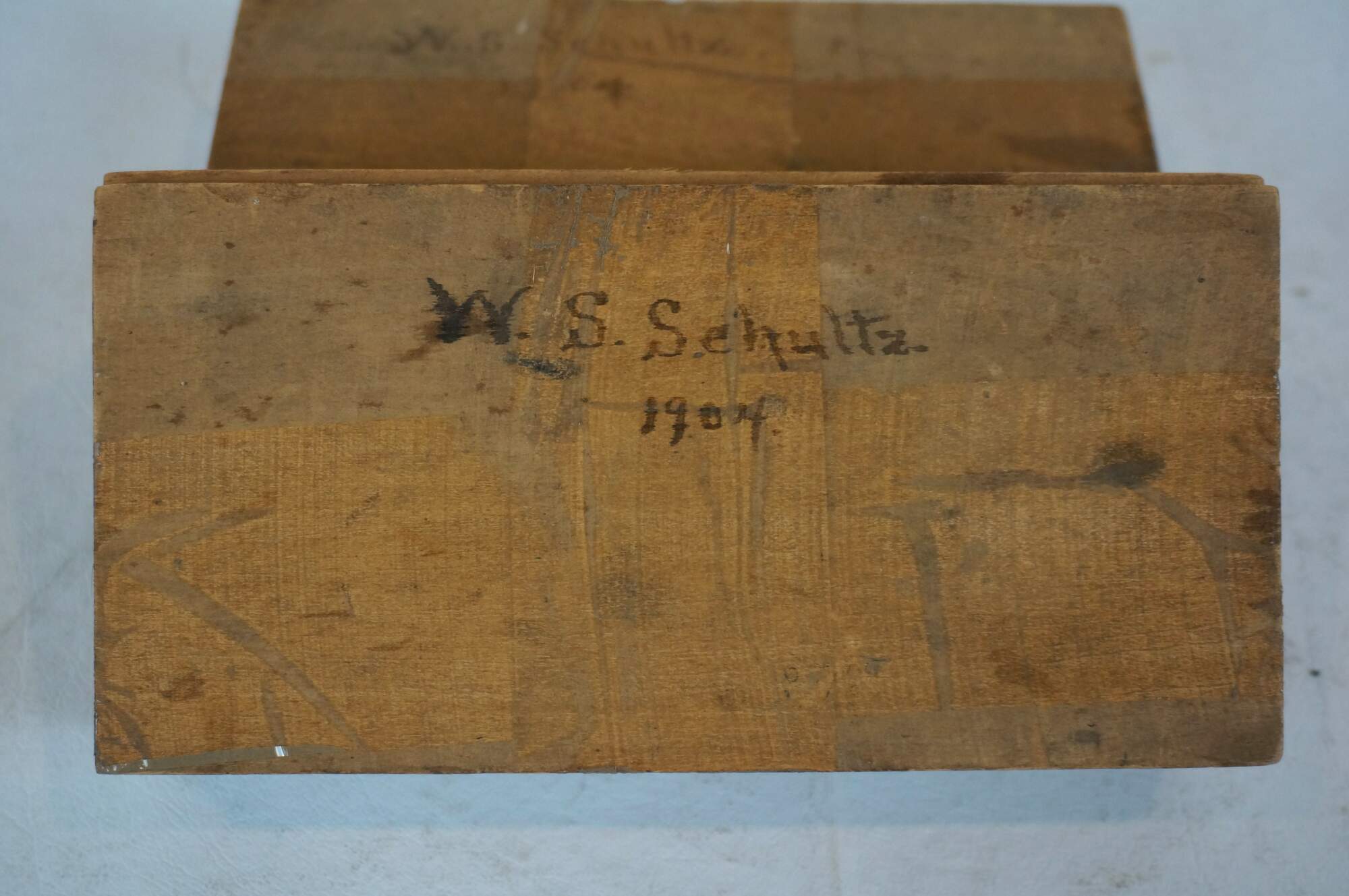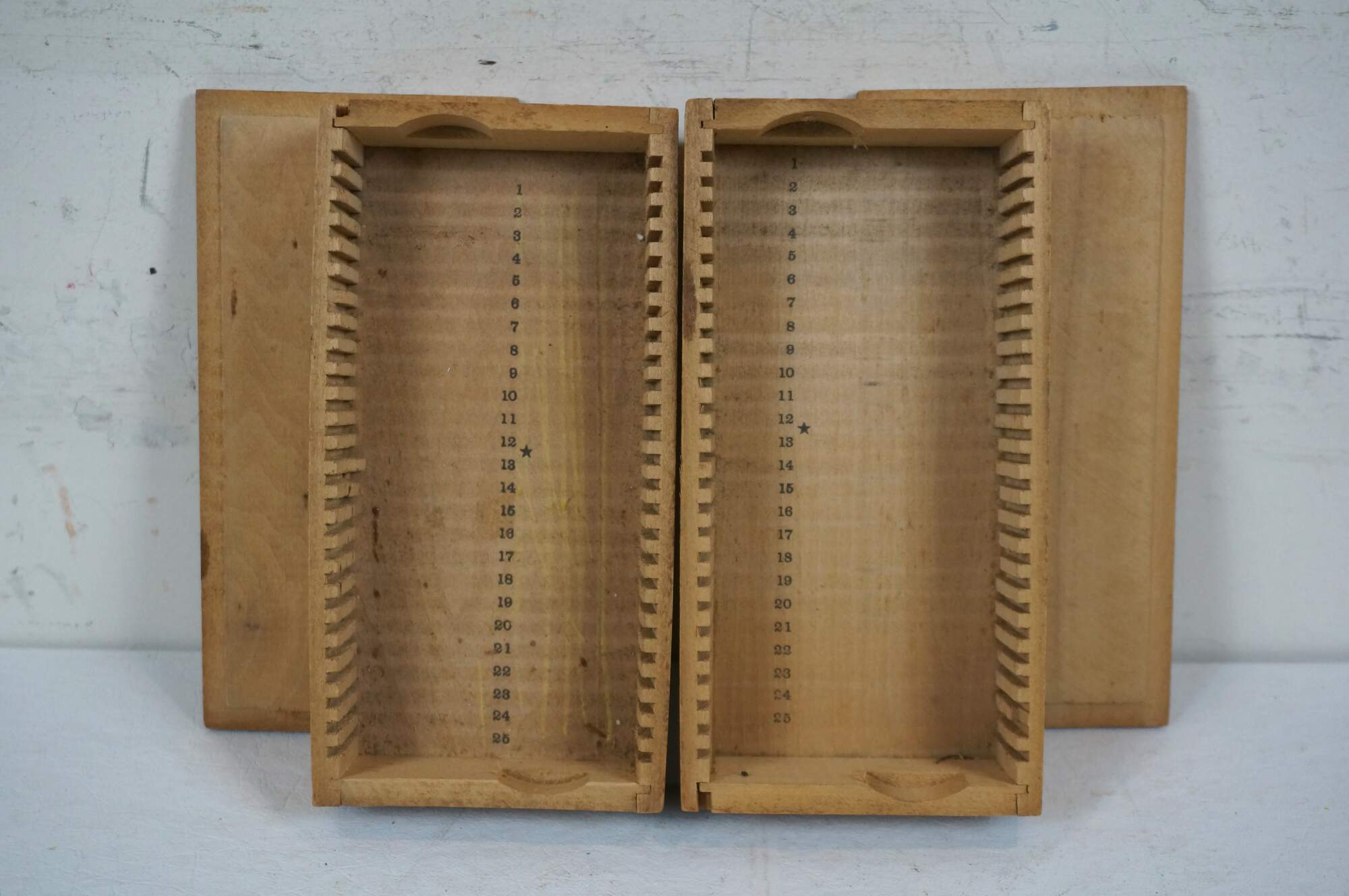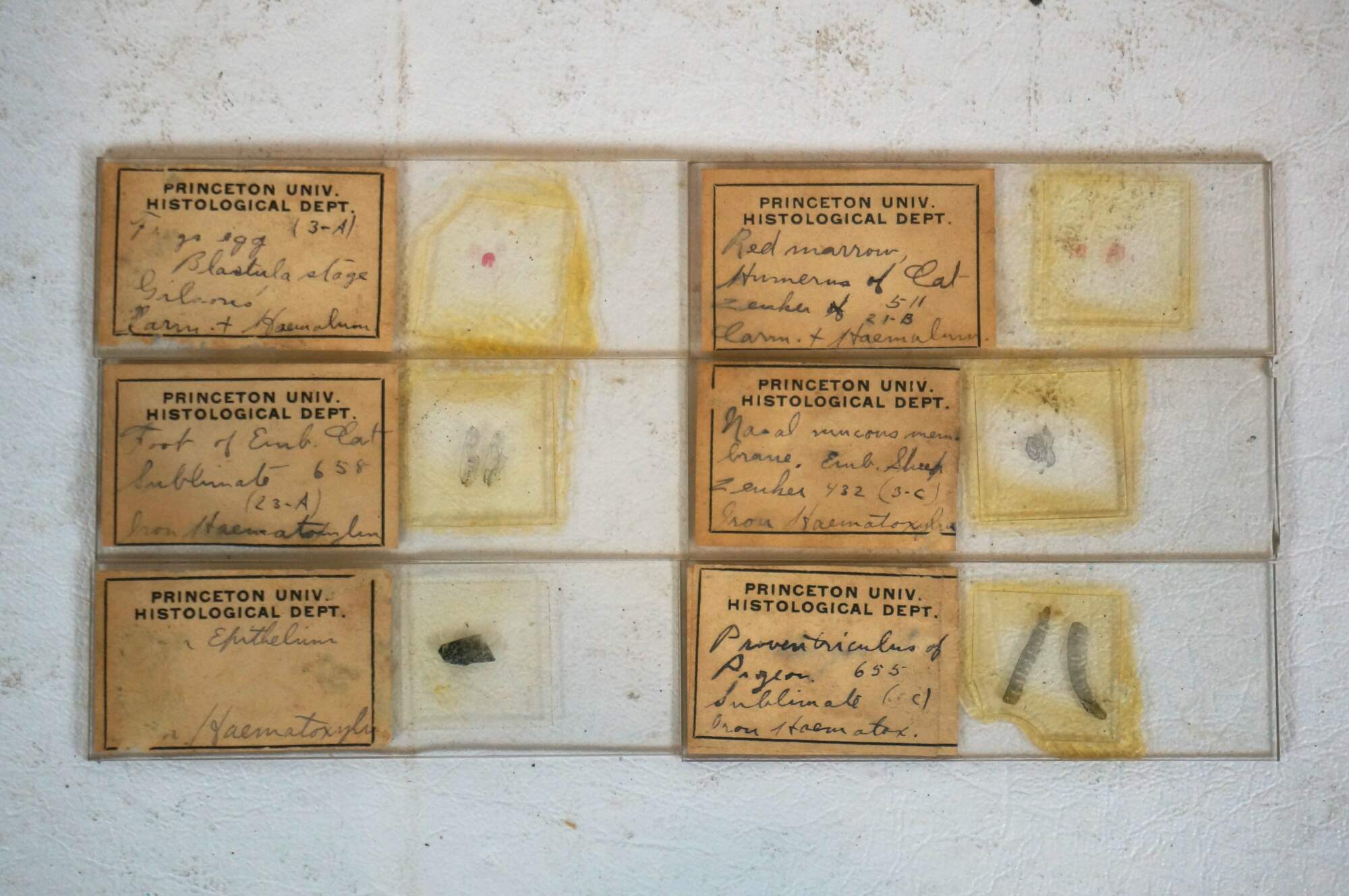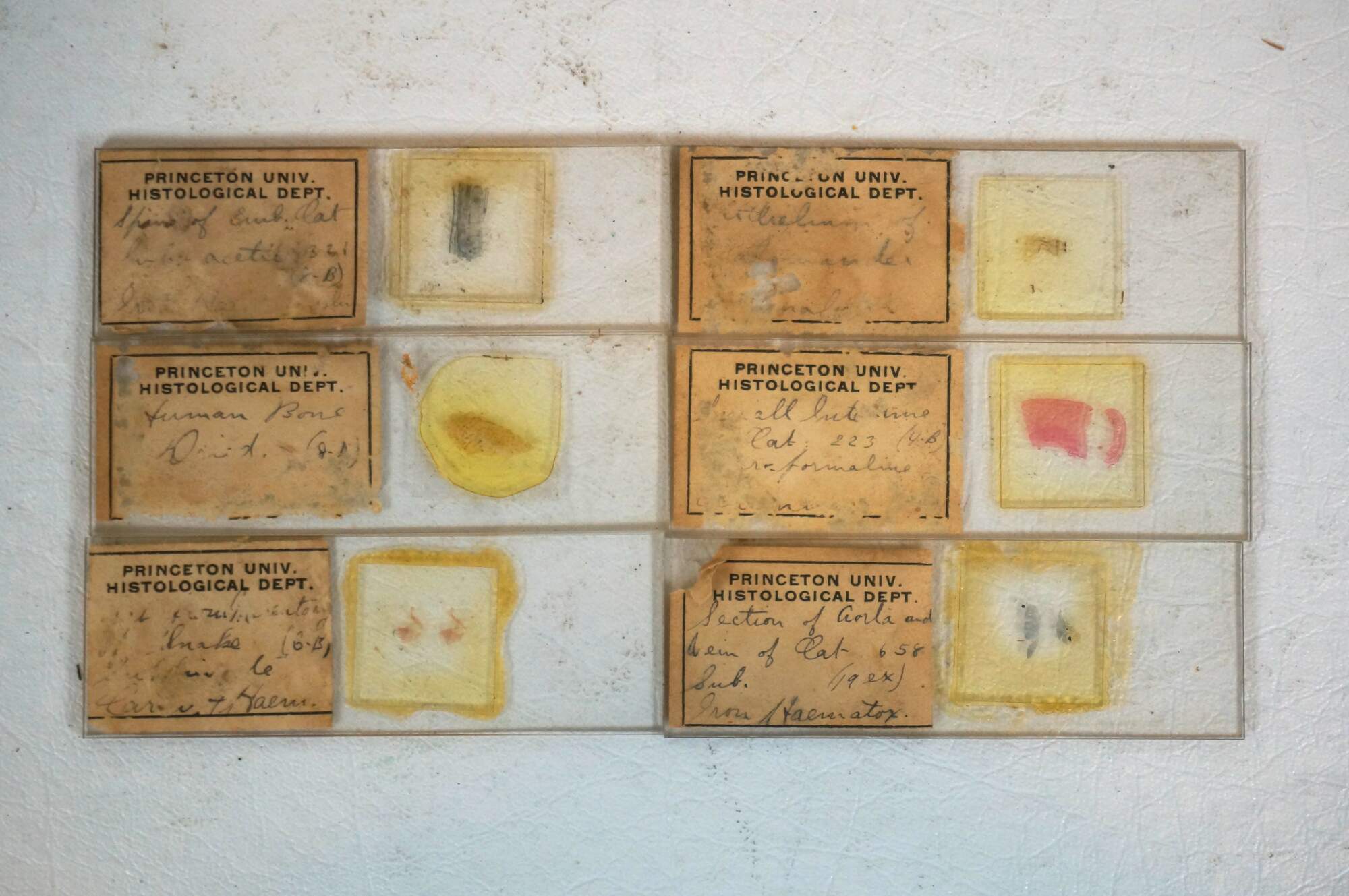 Rare antique circa 1904 set of 30 early prepared specimen glass microscope slides. Hand-written paper labels from the Princeton University Histological Department. Includes two wooden storage boxes with loose lids; interiors feature labeled slots for 25 slides each. Lids marked W.S. Schultz 1904.