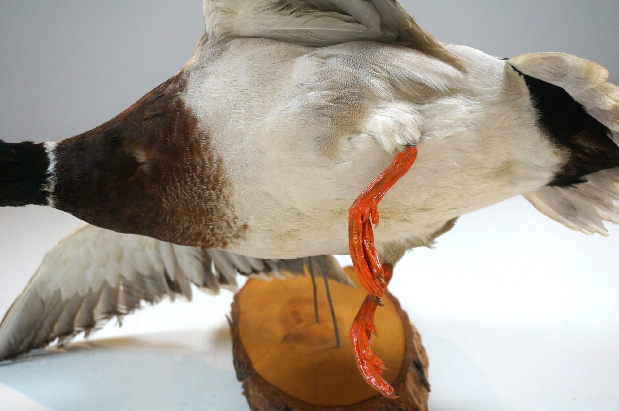 Vintage 20th century taxidermied Mallard drake / male wild duck, displayed in flight on a raw edge slice of wood.