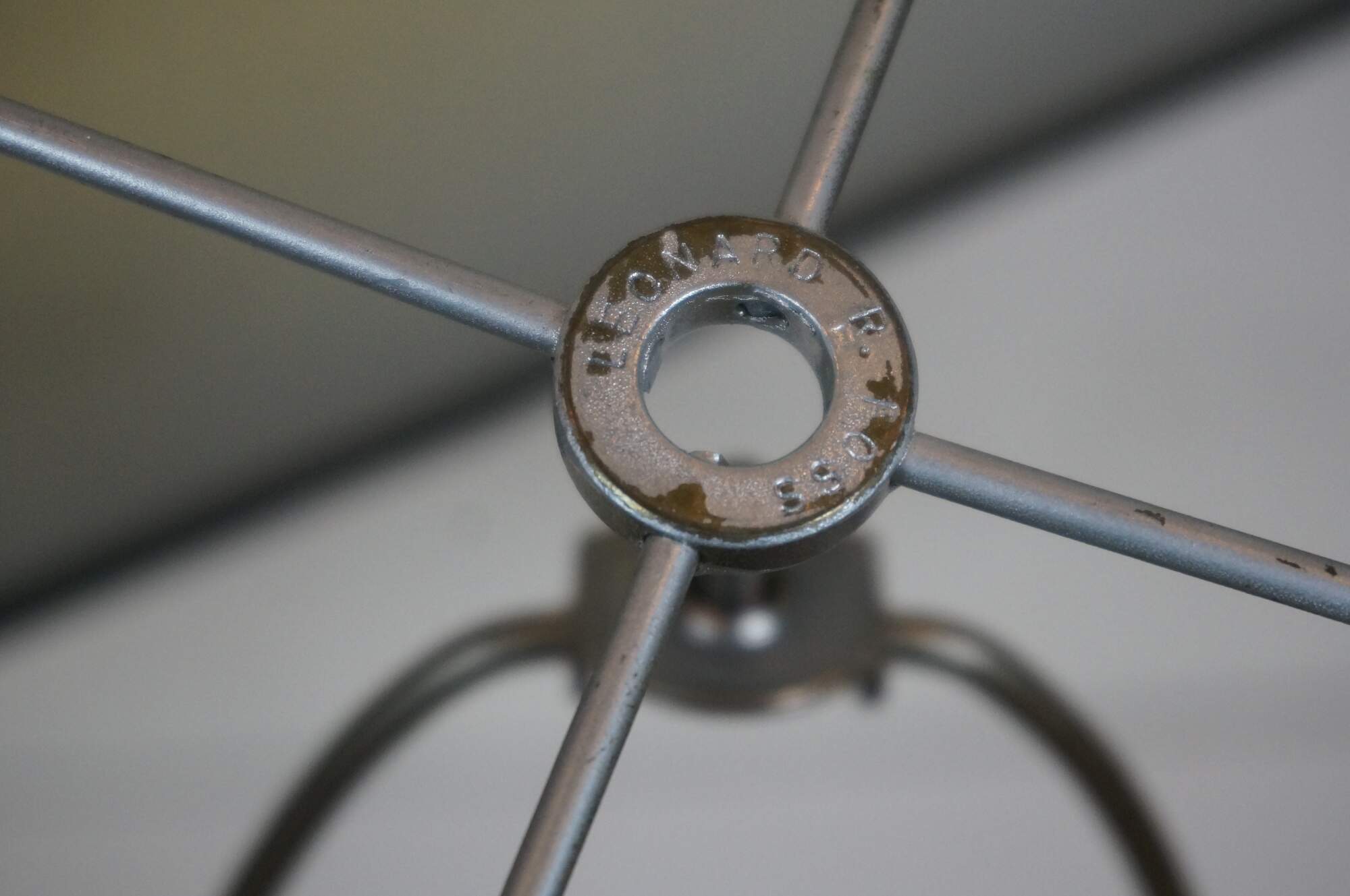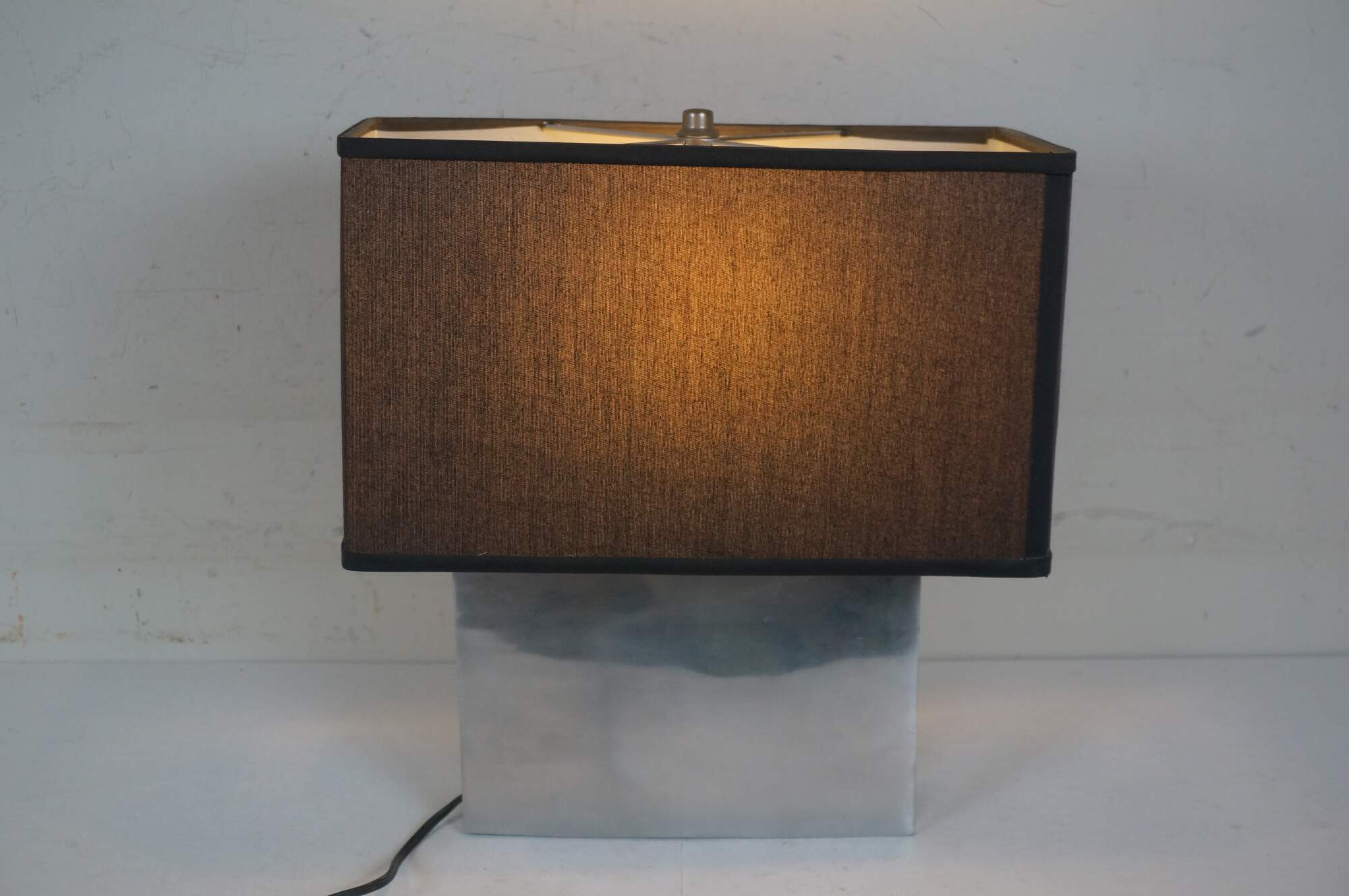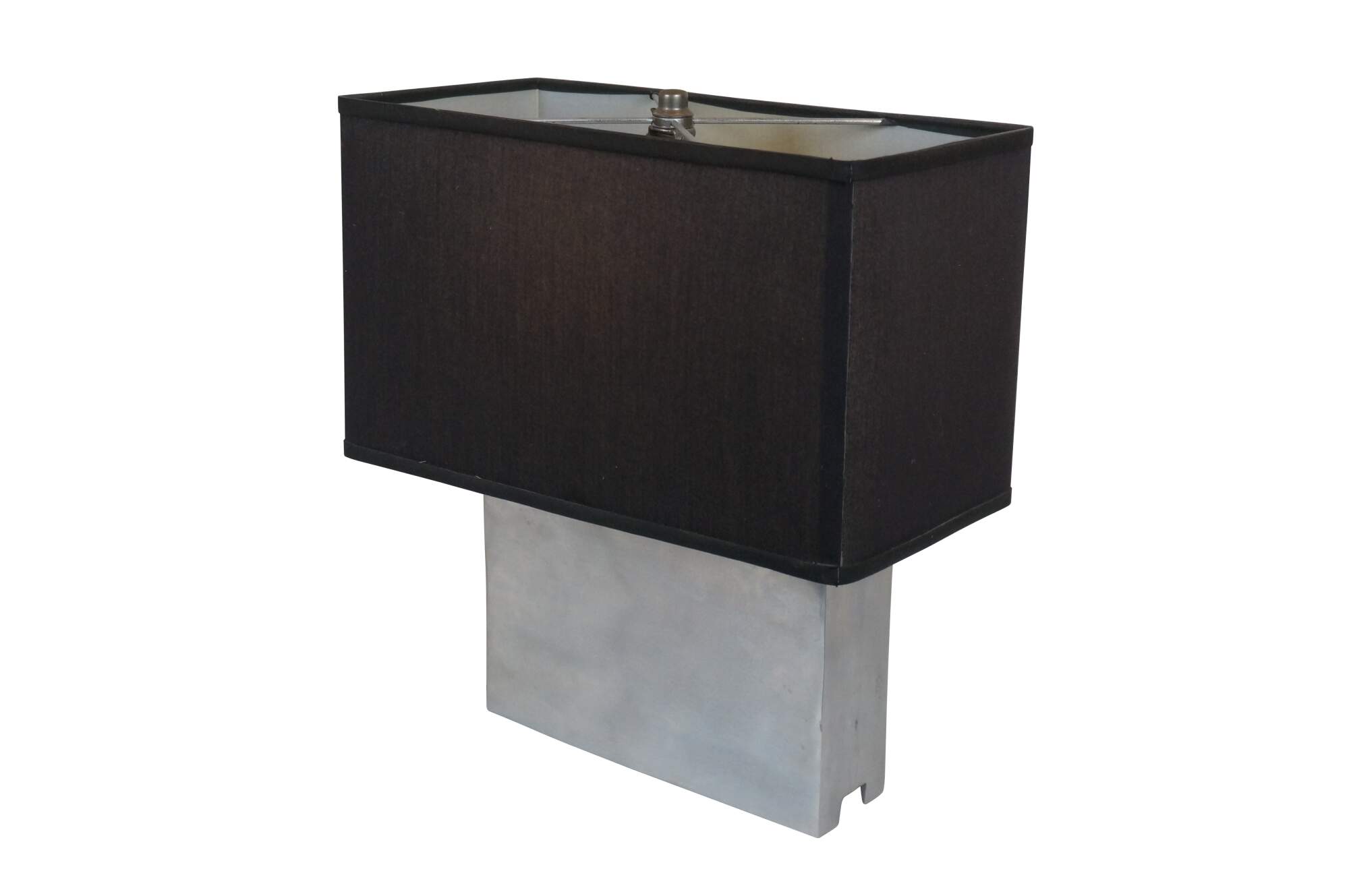 Mid century modern Leonard R. Foss cast aluminum rectangular table lamp with chrome finish. Includes harp, cap shaped finial and black fabric shade.