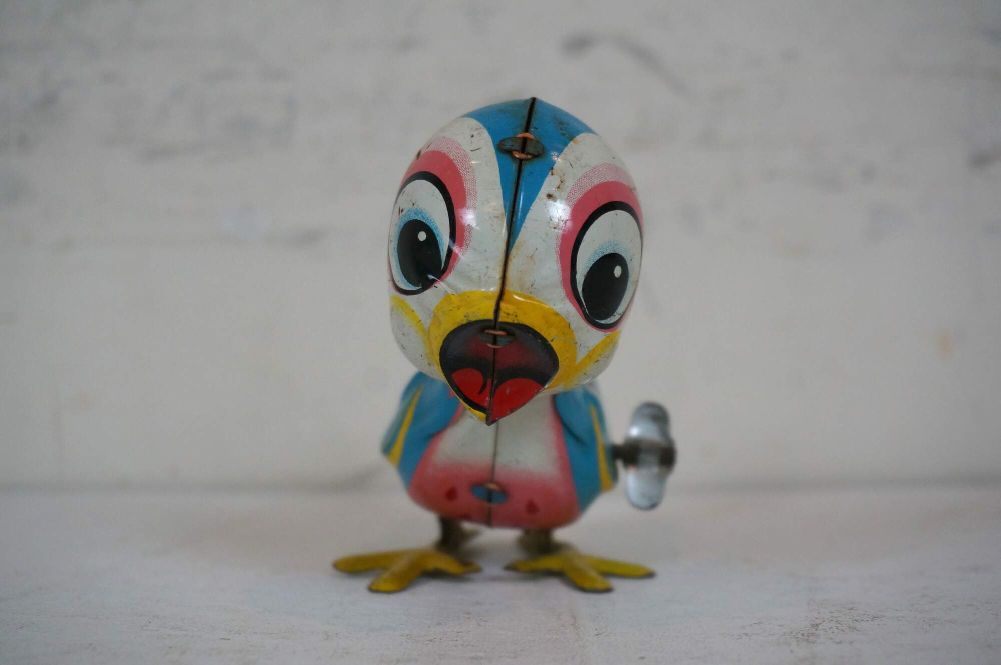 Mid 20th century litho printed tin wind up toy in the shape of a baby blue bird with big eyes, produced by Linemar Company Inc. Bobs up and down when wound. Made in Japan.