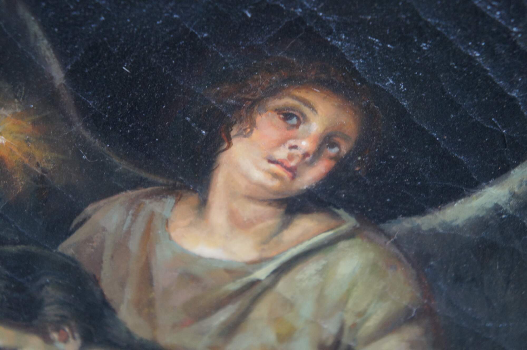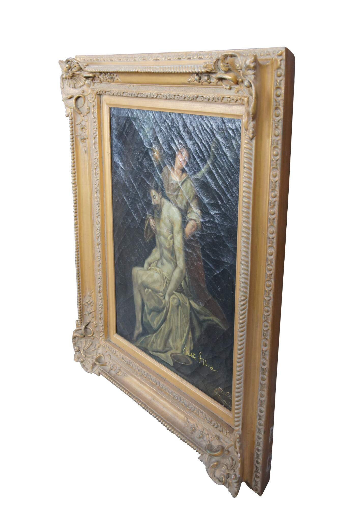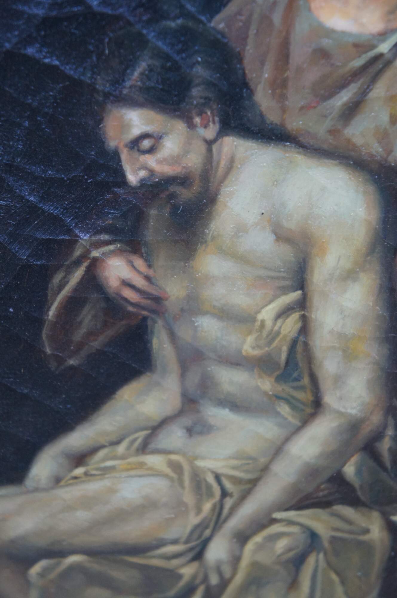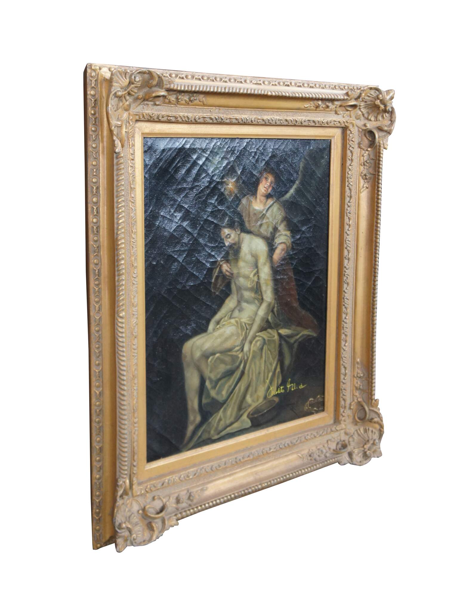 The Dead Christ supported by an Angel Oil Painting after Alonso Cano. Scalloped gold baroque frame with foliate accents.