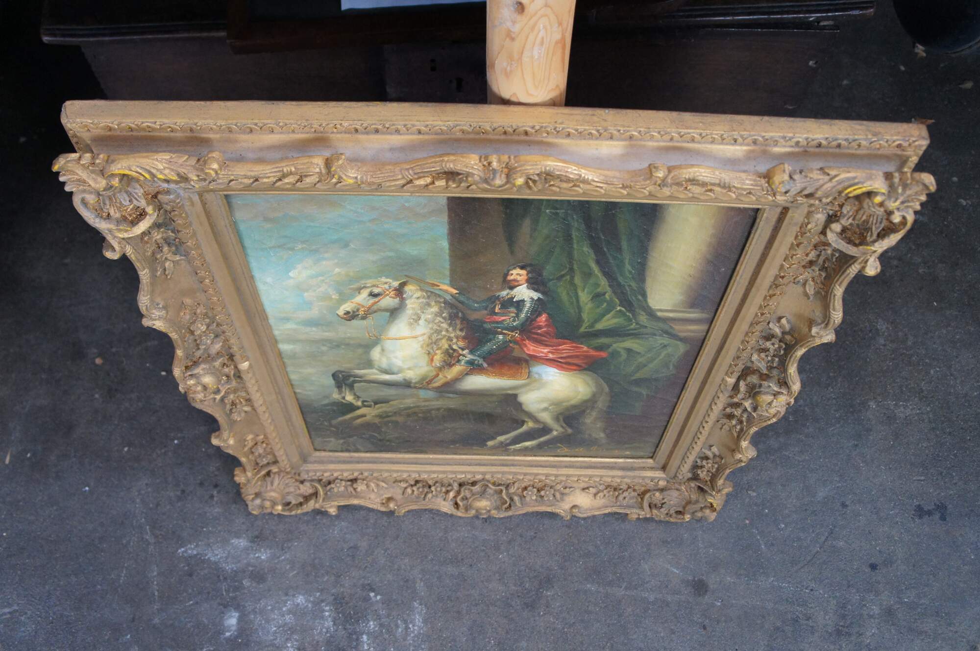 Late 20th century oil painting on linen after "Equestrian Portrait of Thomas Francis of Savoy, Prince of Carignano" originally painted in 1634 by Anthony van Dyck. Baroque gold floral and foliate frame.