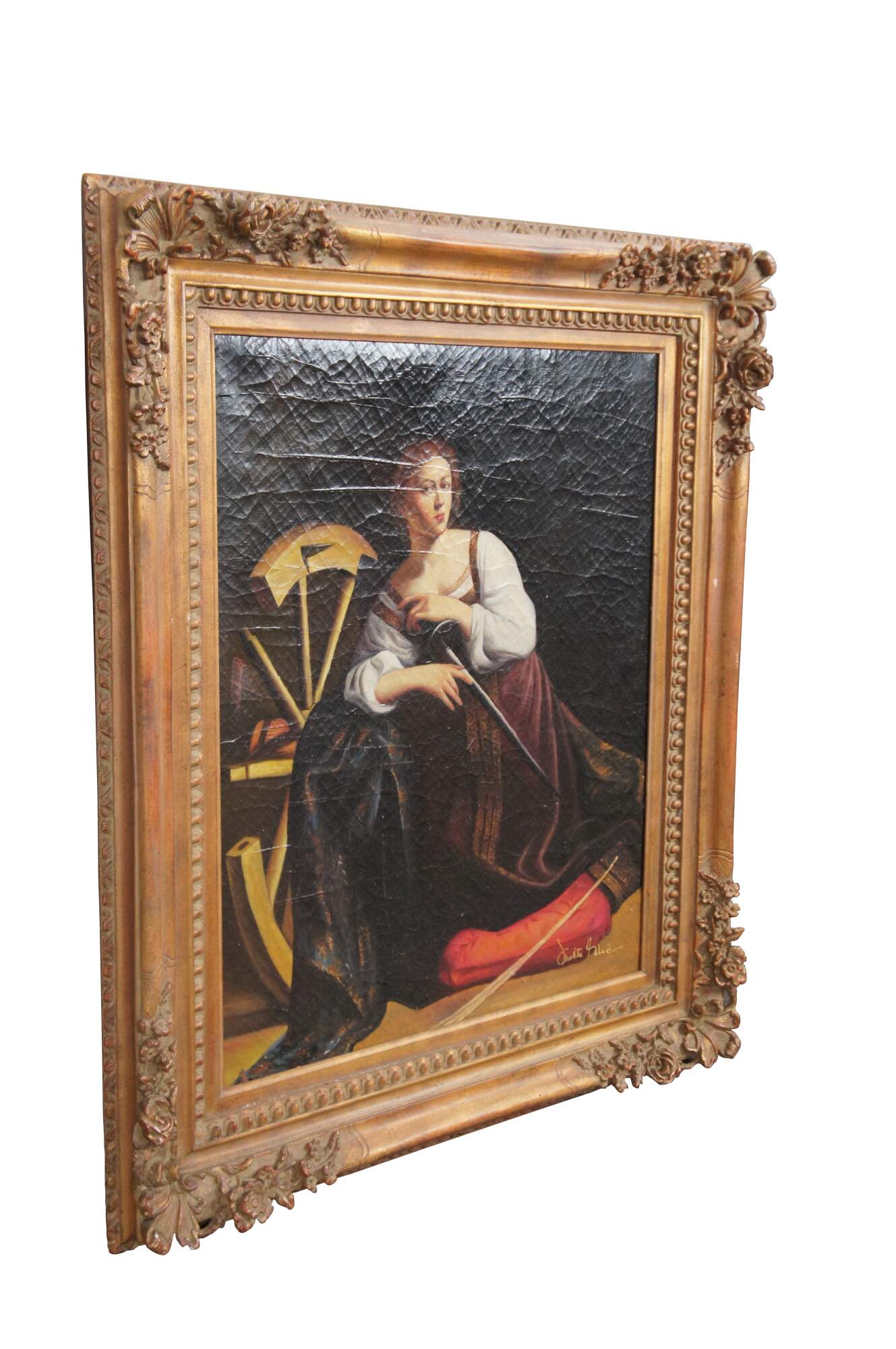 Saint Catherine of Alexandria was a popular figure in Catholic iconography. Her qualities are supposed to be those of beauty, fearlessness, virginity, and intelligence. She was of noble origins, and dedicated herself as a Christian after having a vision. At the age of 18, she confronted the Roman Emperor Maximus (presumably this refers to Galerius Maximianus), debated his pagan philosophers, and succeeded in converting many of them to Christianity. Imprisoned by the emperor, she converted his empress and the leader of his armies. Maximus executed her converts, including the empress, and ordered that Catherine herself be put to death on a spiked wheel. The wheel reportedly shattered the moment Catherine touched it. Maximus then had her beheaded.