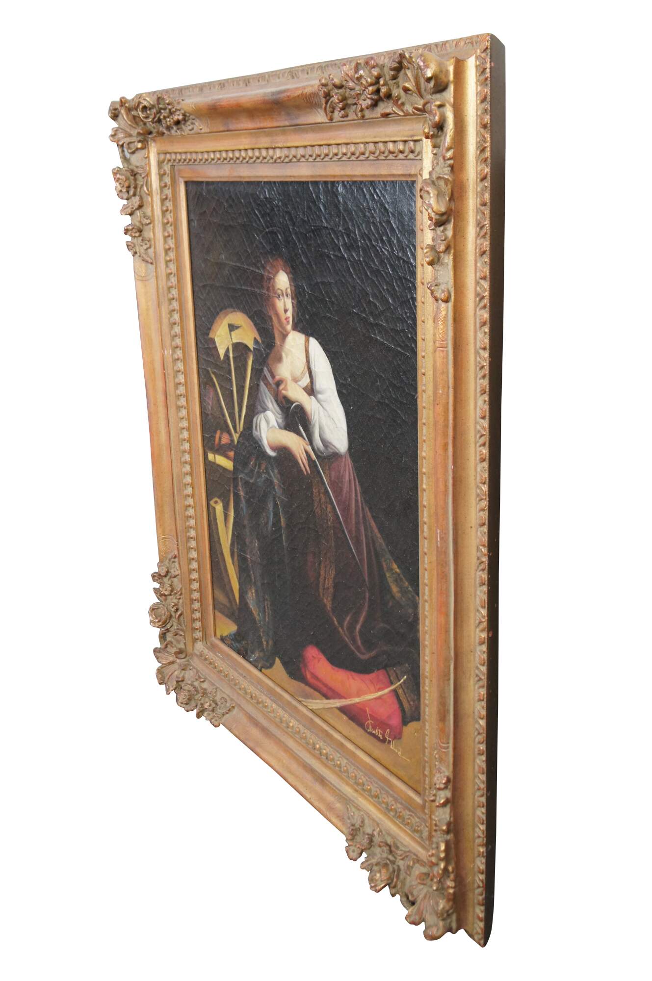 As the model for the saint, Caravaggio controversially chose Fillide Melandroni, a well known Roman prostitute he had fallen in love with and who caused him many problems. Fillide would again model for him in Martha and Mary Magdalene, Judith Beheading Holofernes, and in a single portrait burned in Berlin during World War II.