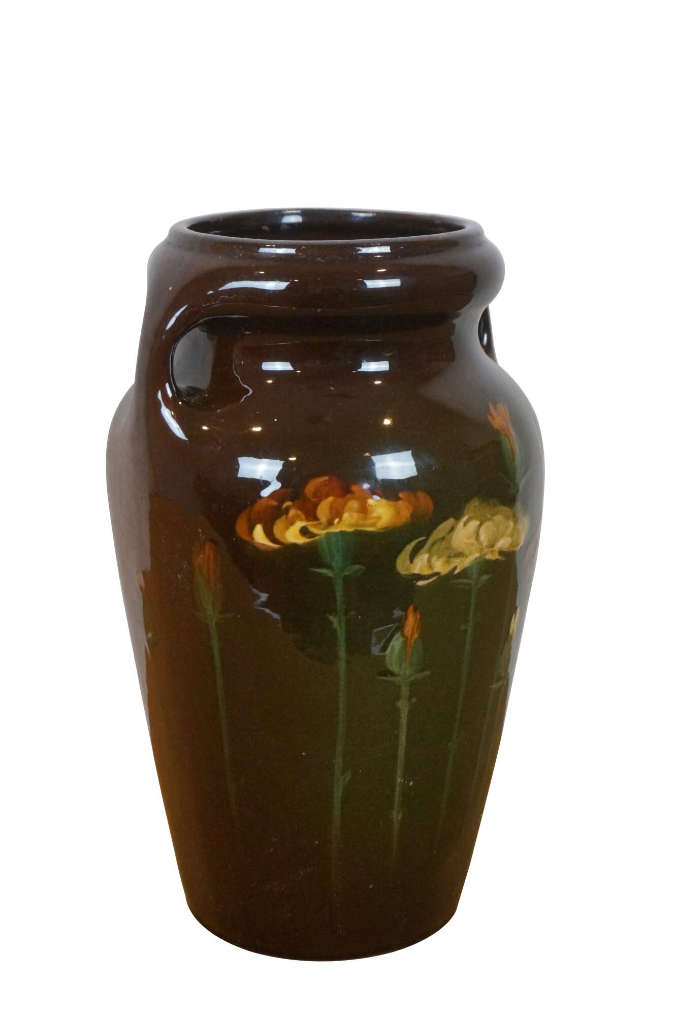 Early 20th century Loy-Nel-Art 02 vase by McCoy Pottery, first introduced sometime between 1905-1910. Cylindrical shape with slightly tapered base and low profile handles. Brown glaze with hand painted long stemmed flowers / carnations in orange and white.