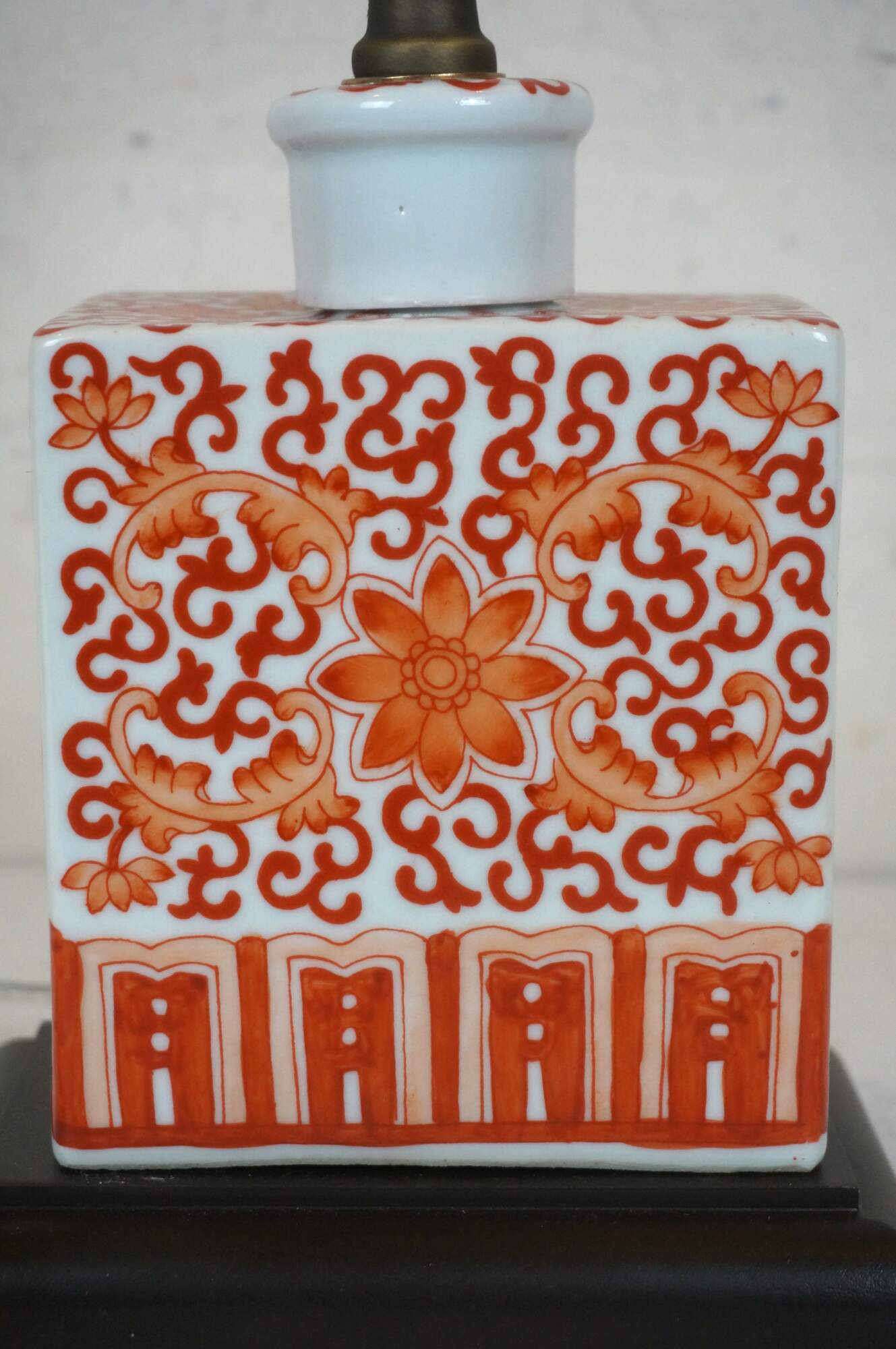 Beautiful chinoiserie table lamp crafted from an orange and white porcelain tea caddy decorated with leaves and flowers, set on a rectangular wood base. Includes harp, orange ceramic finial and white fabric shade.