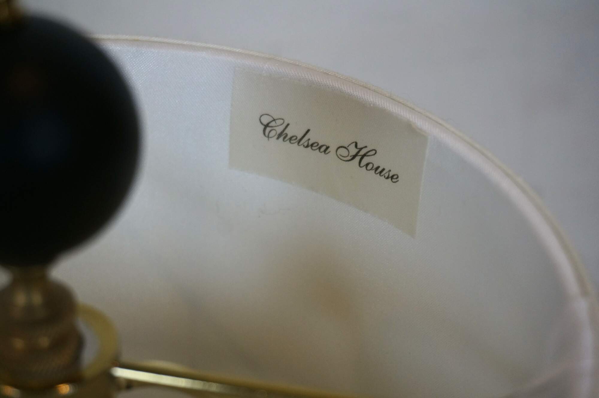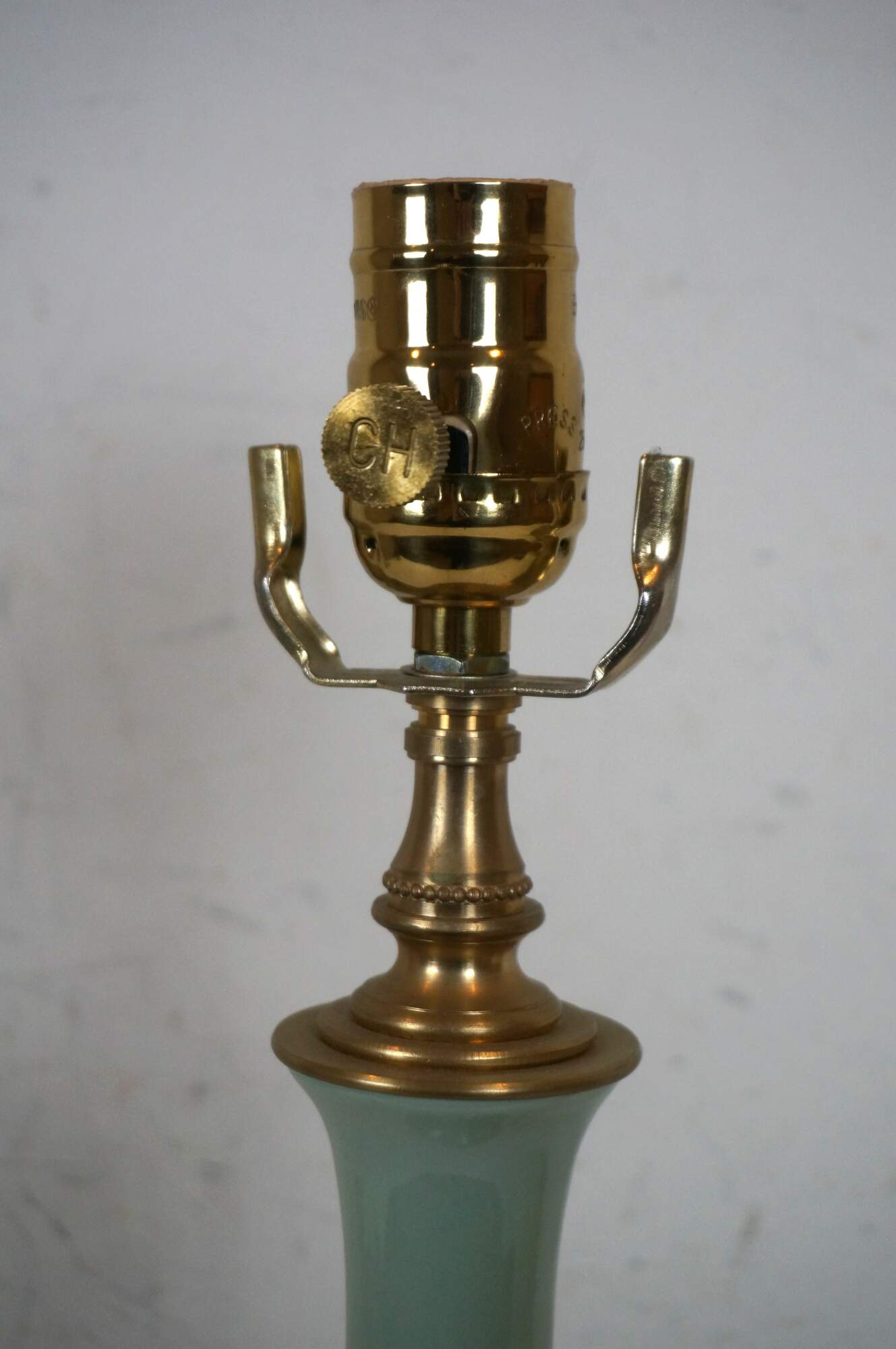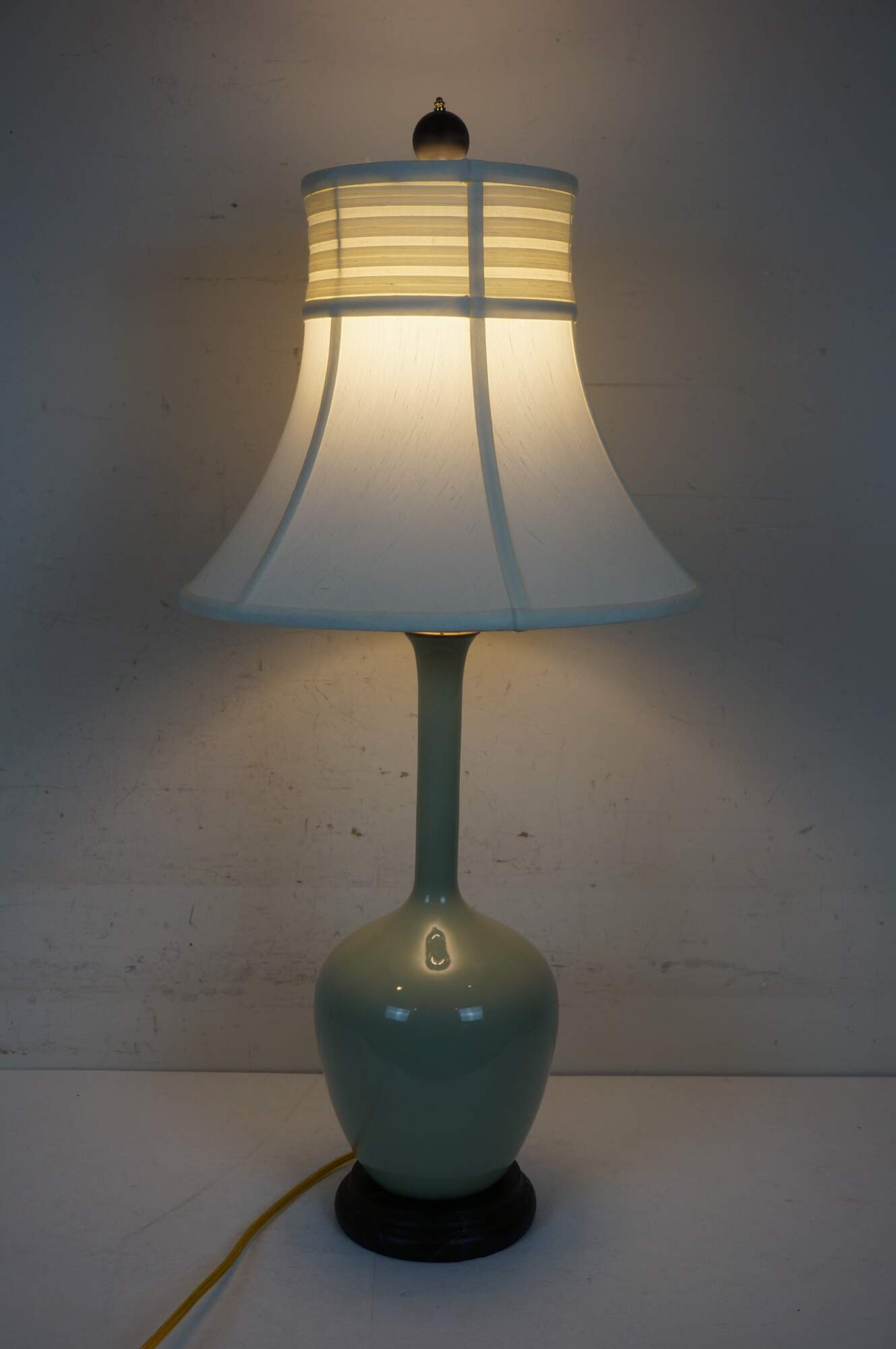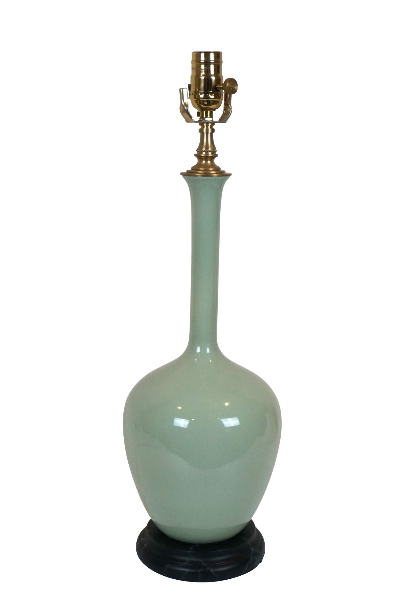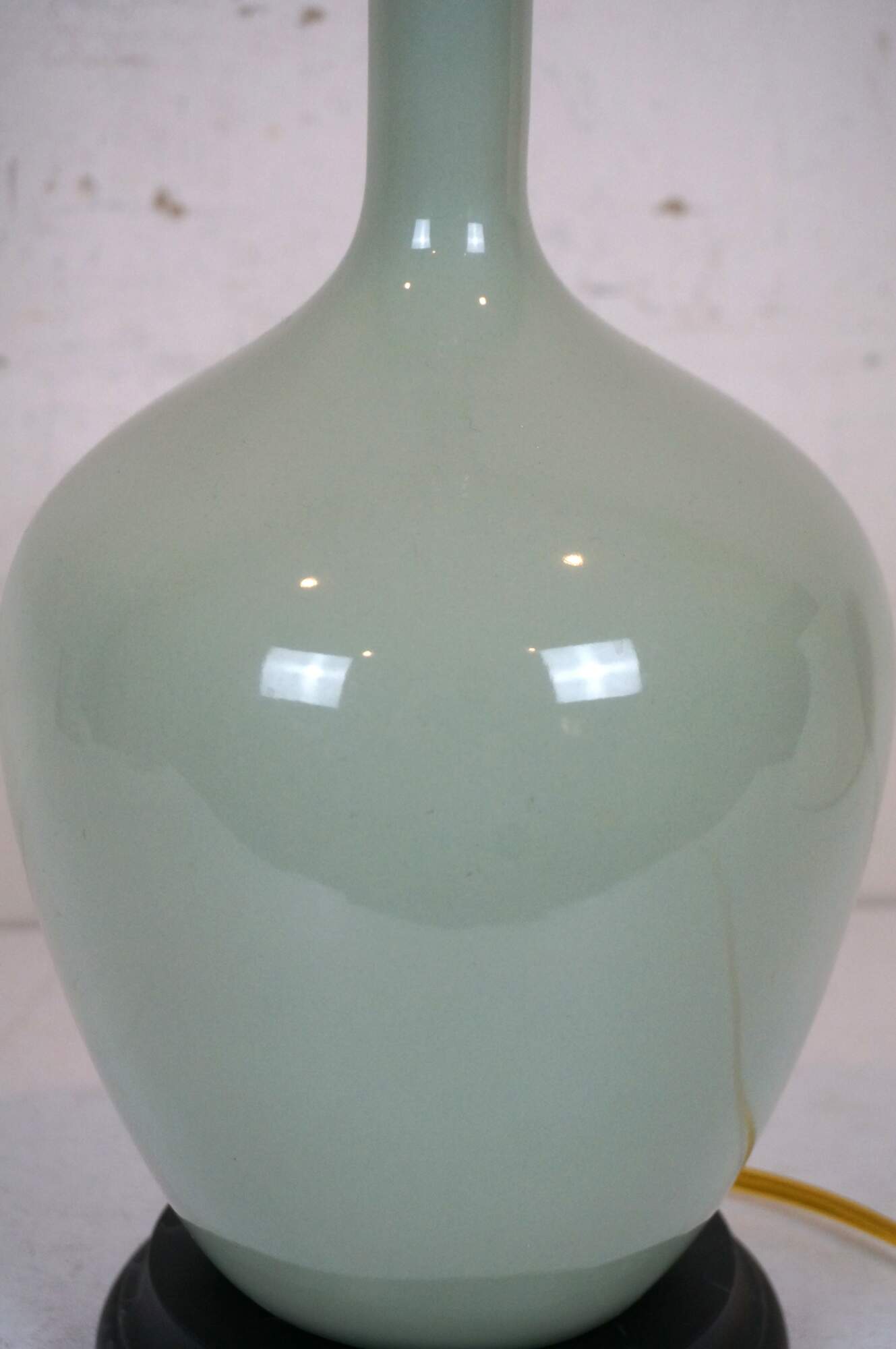 Chelsea House ceramic table lamp glazed in a soft celadon green with black faux marble base and brass hardware. Includes harp, black wood orb finial and a stylish white fabric shade. Made in China.