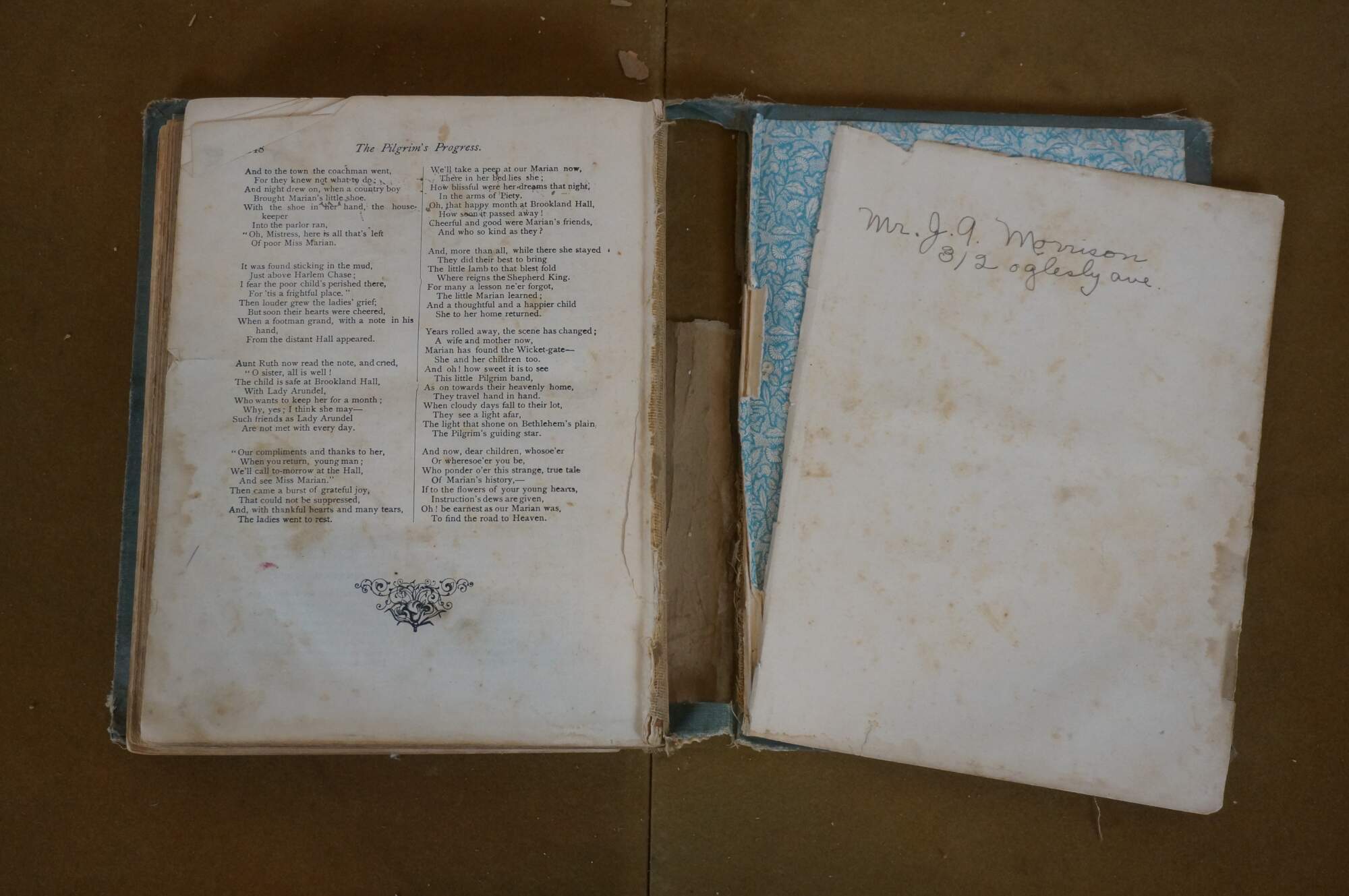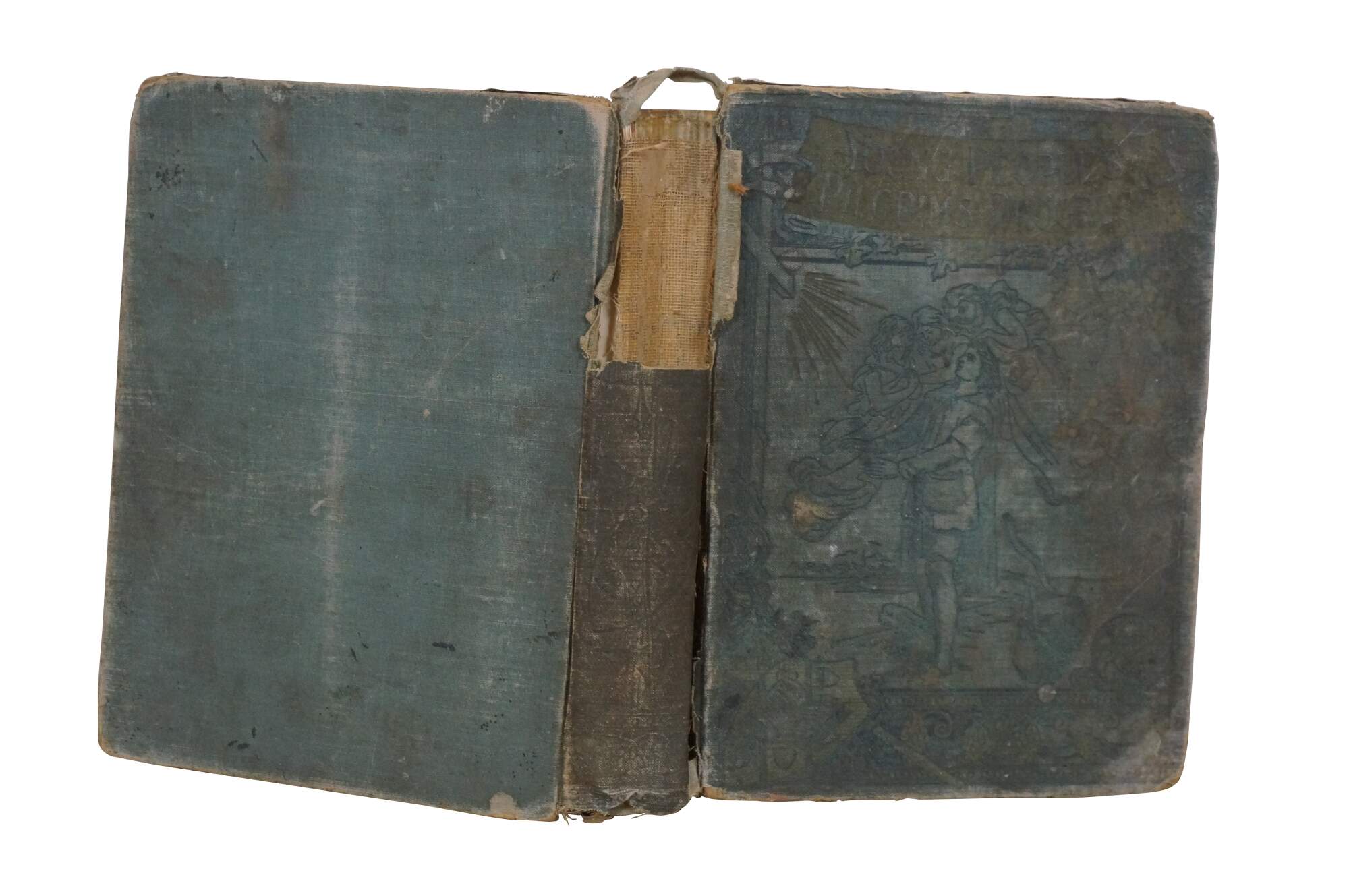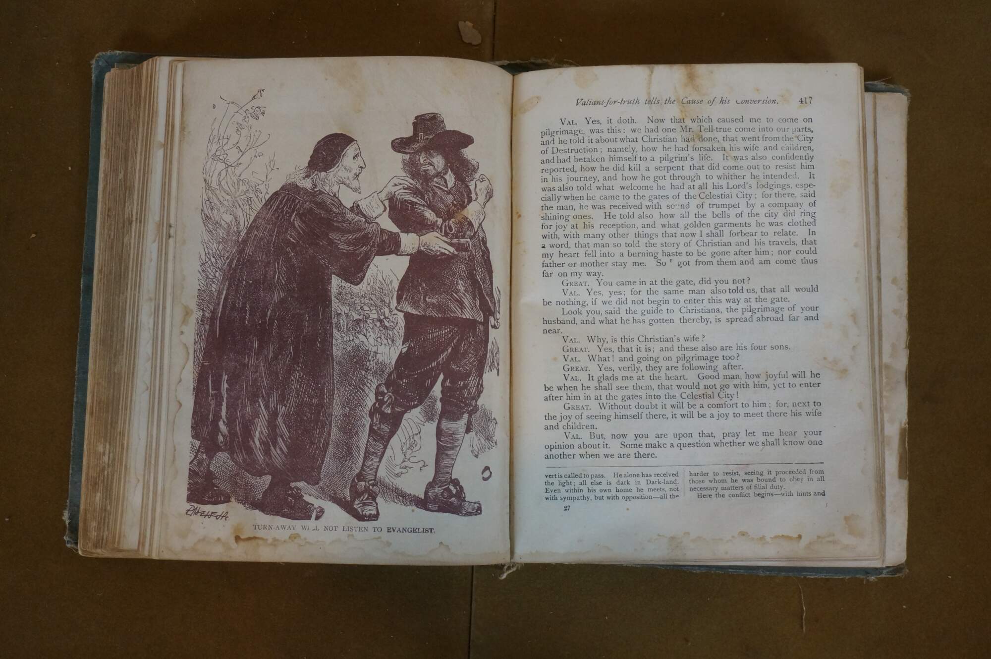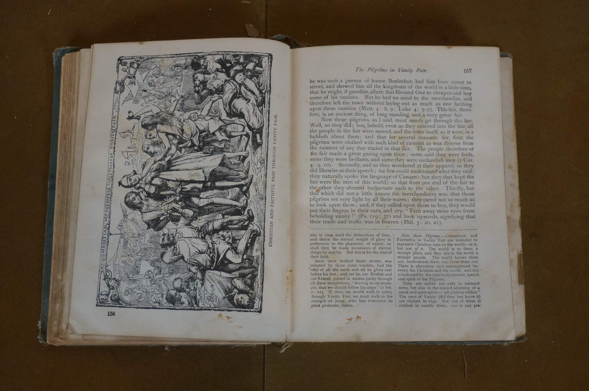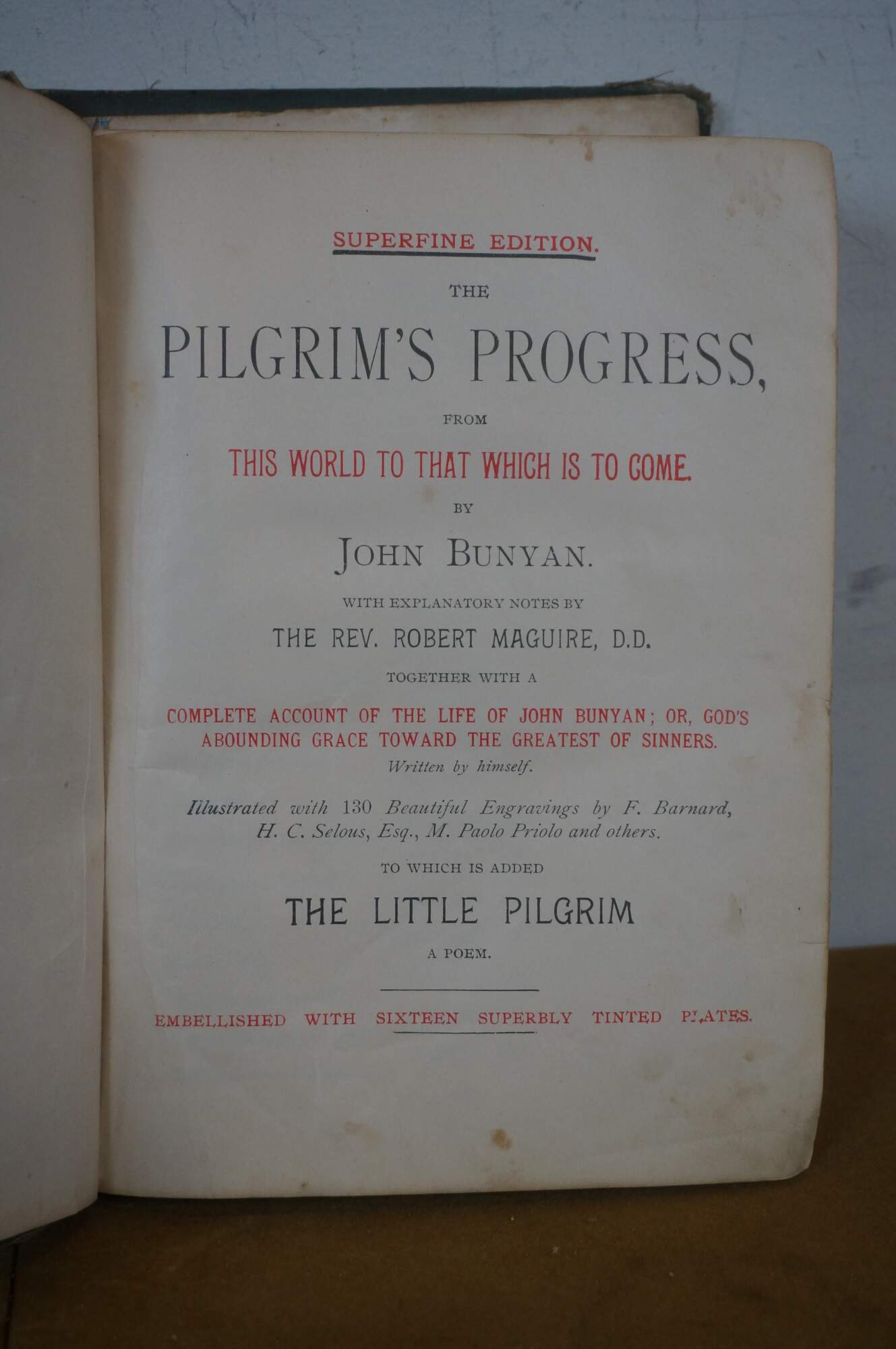 Late 19th to Early 20th century copy of The Pilgrim's Progress, From this World to That Which is to Come - By John Bunyan with Explanatory Notes by the Rev. Robert Maguire - Superfine Edition - Together with a Complete Account of the Life of John Bunyan - Illustrated with 130 Beautiful Engravings by F. Barnard, H.C. Selous, M. Paolo Priolo and others - To Which is Added The Little Pilgrim, a Poem - No publisher noted - Hard cover, blue cloth binding.