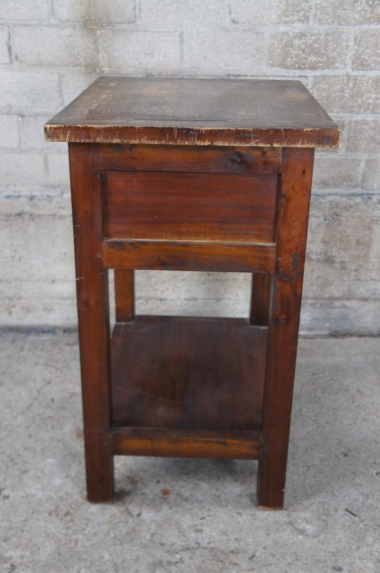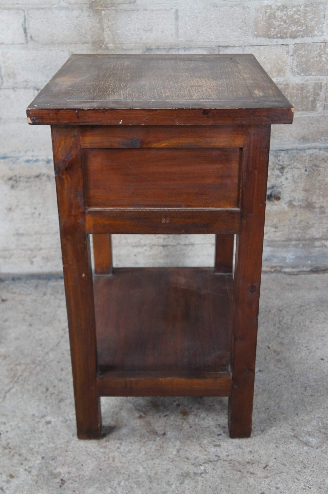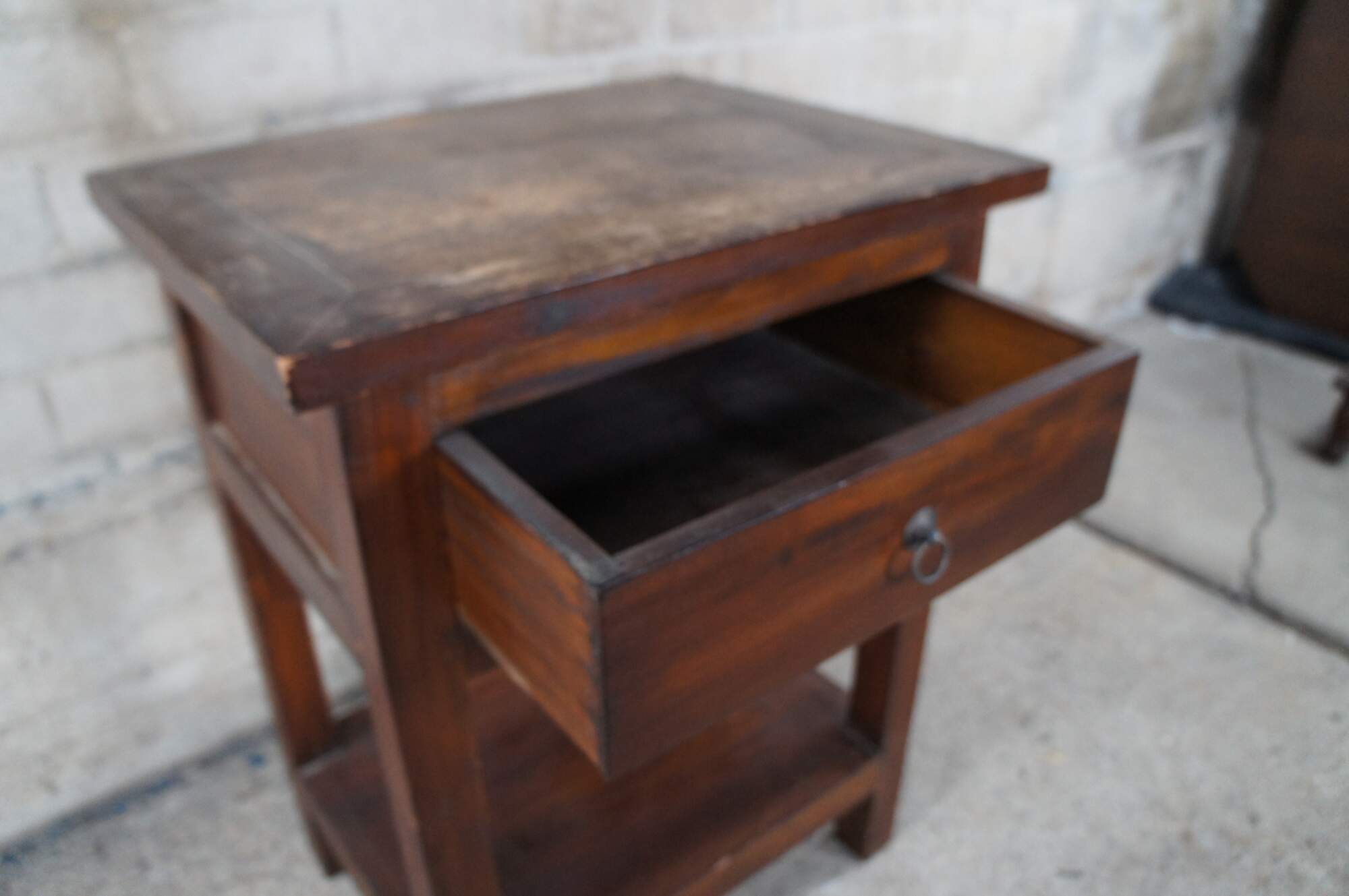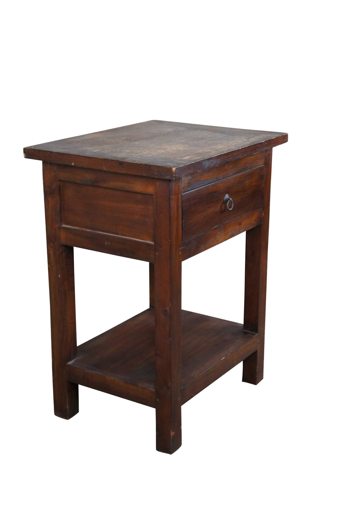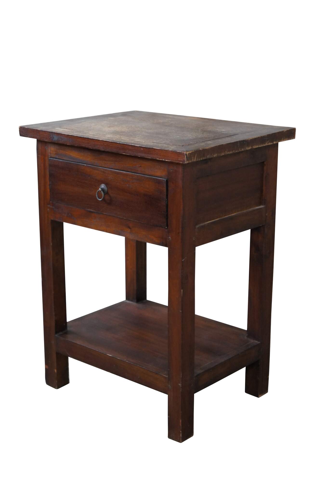 Handcrafted mahogany side table. Features a rectangular form with lower shelf and drawer.