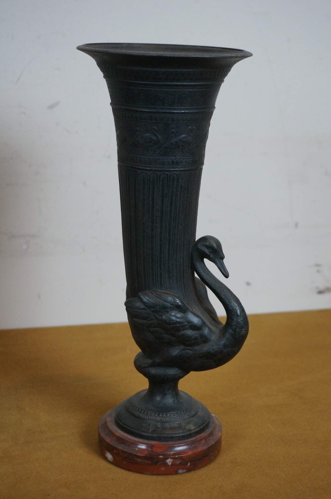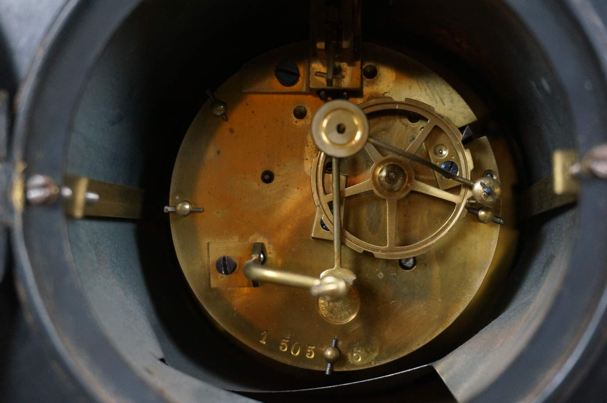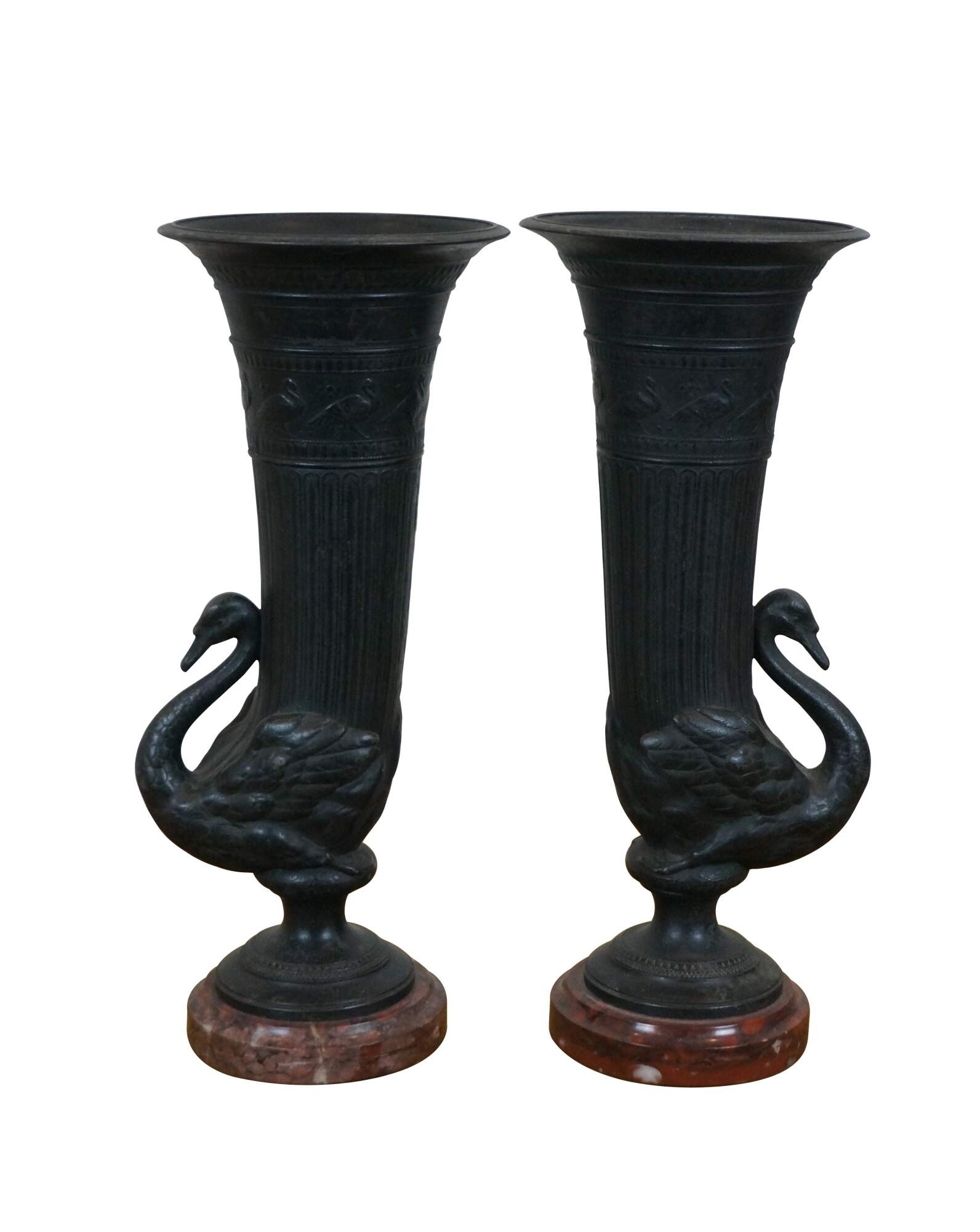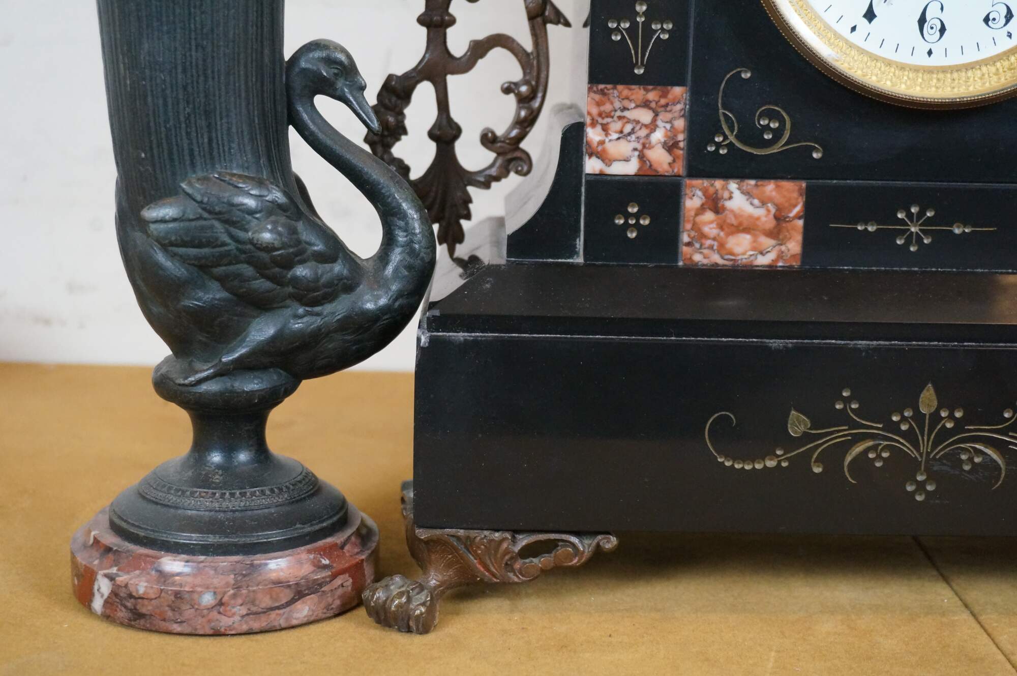 Late 19th Century L. Marti et Cie French Napoleon III style Mantel Clock & Garniture Set. The beautifully designed lcock is made from slate with filigree engraving, reuge marble panels, ornate bronze detail and a trophy urn. The face is enameled with a Roman dial and marked Versailles. The bronze figural garniture urns showcase swans at the base of the vessel with an additional scene wrapped around the mid upper section. Each garniture is footed with a Reuge Marble base. A perfect set that will display nicely along any mantel, office, library or parlor setting.
