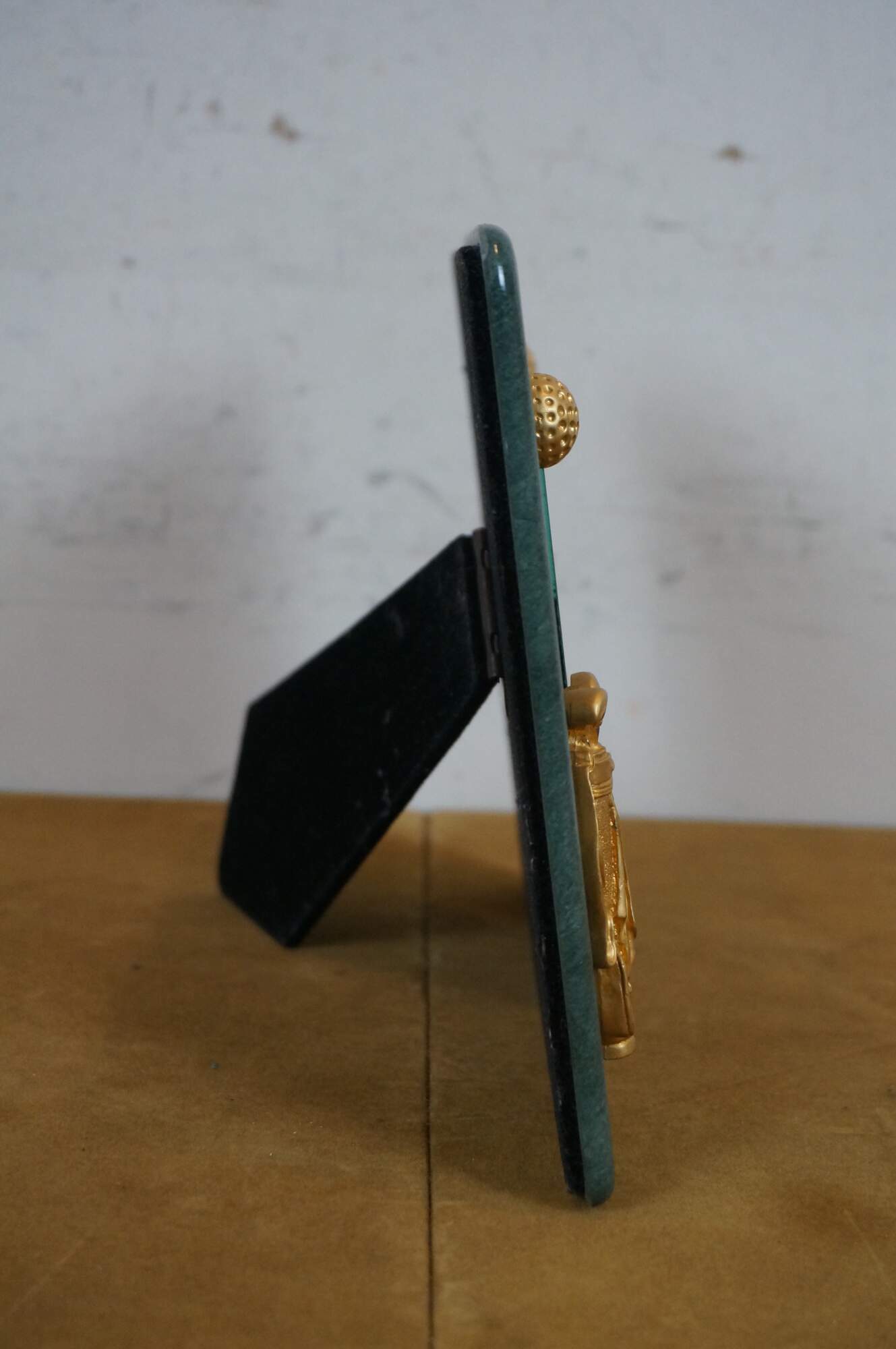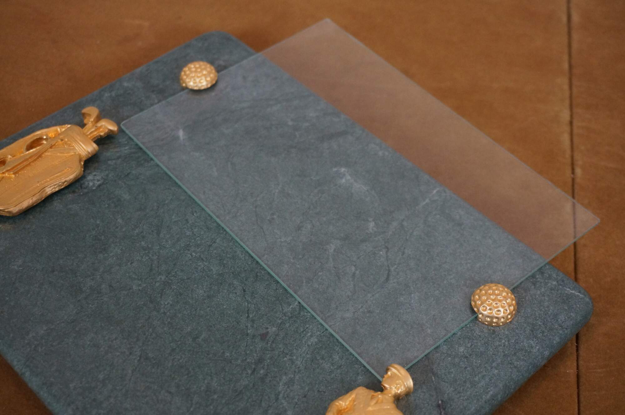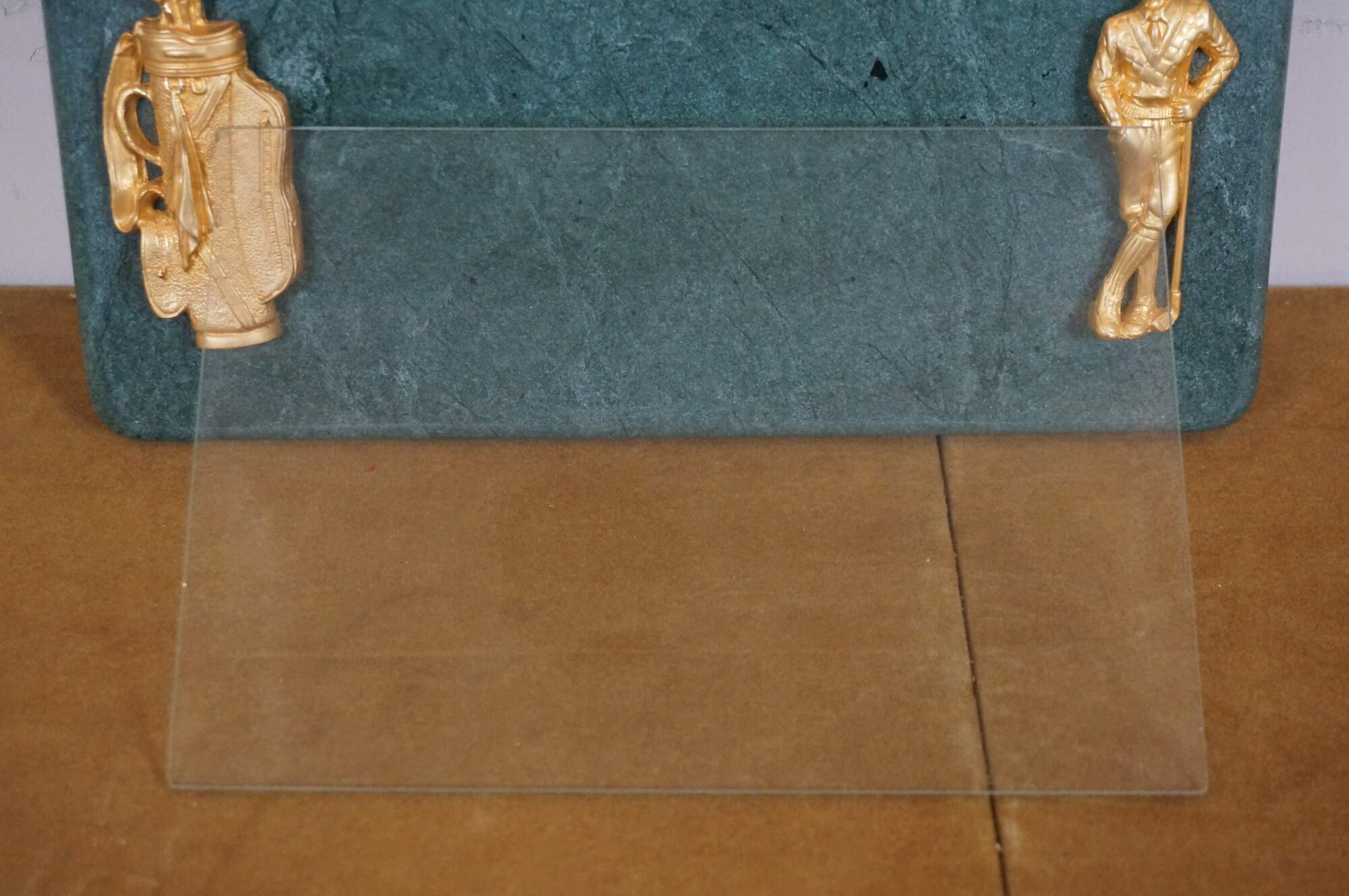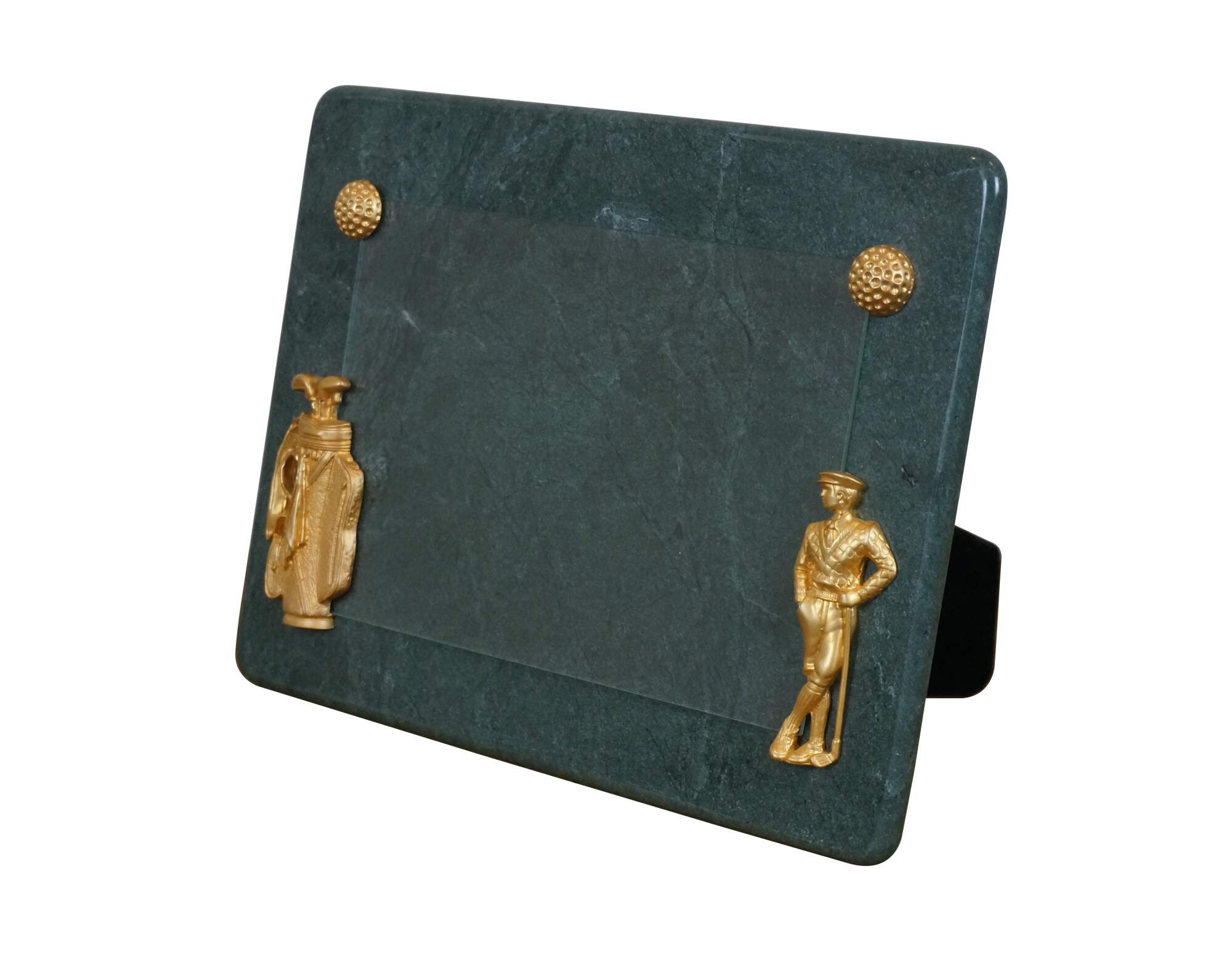 Late 20th Century Gold Themed Photo / Picture Frame. Features a green marble slab with glass covering held between two gold metal golf balls above a golfer posing across from his clubs.