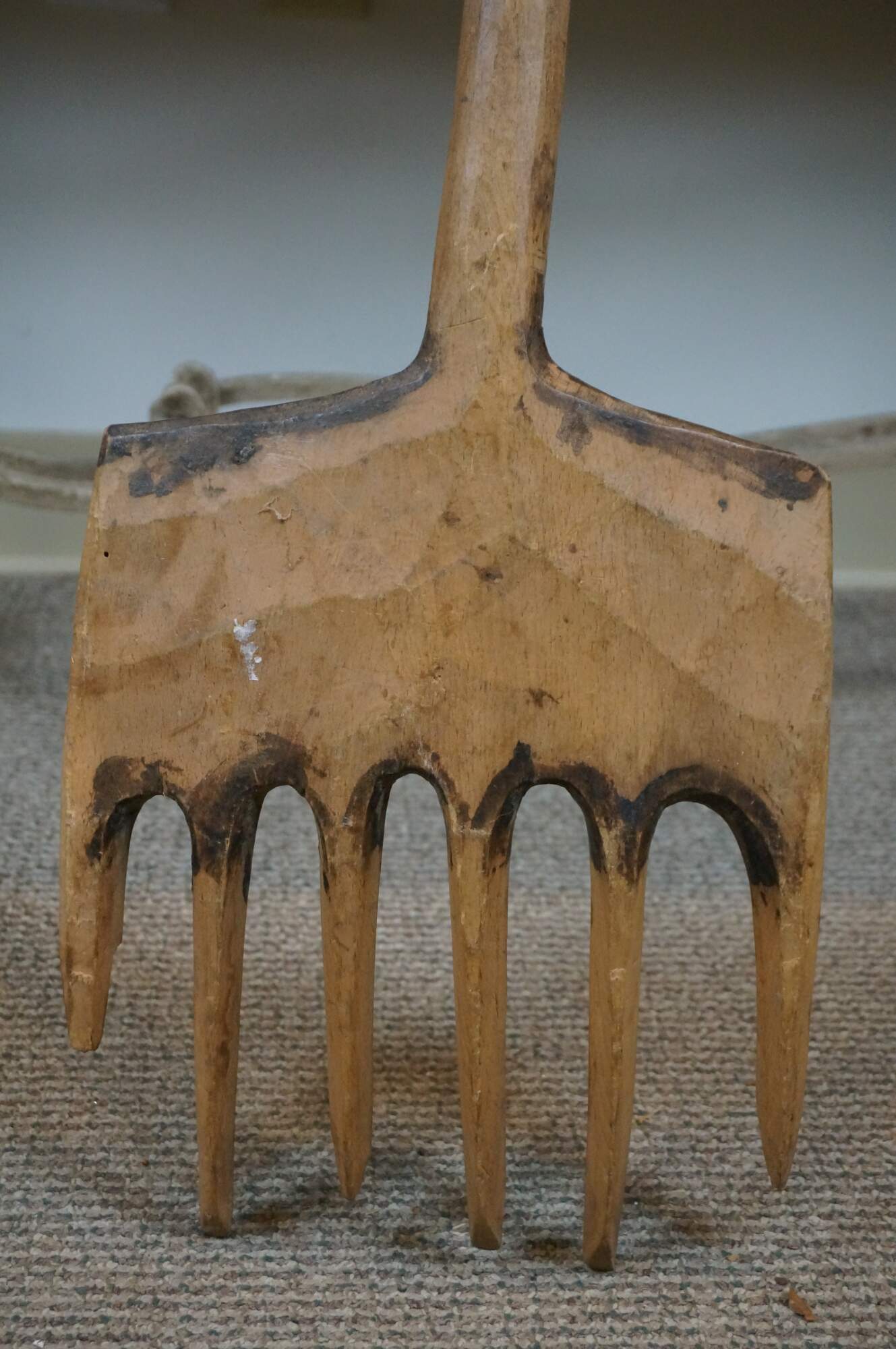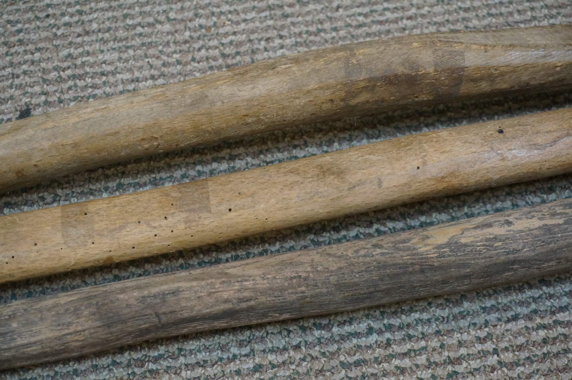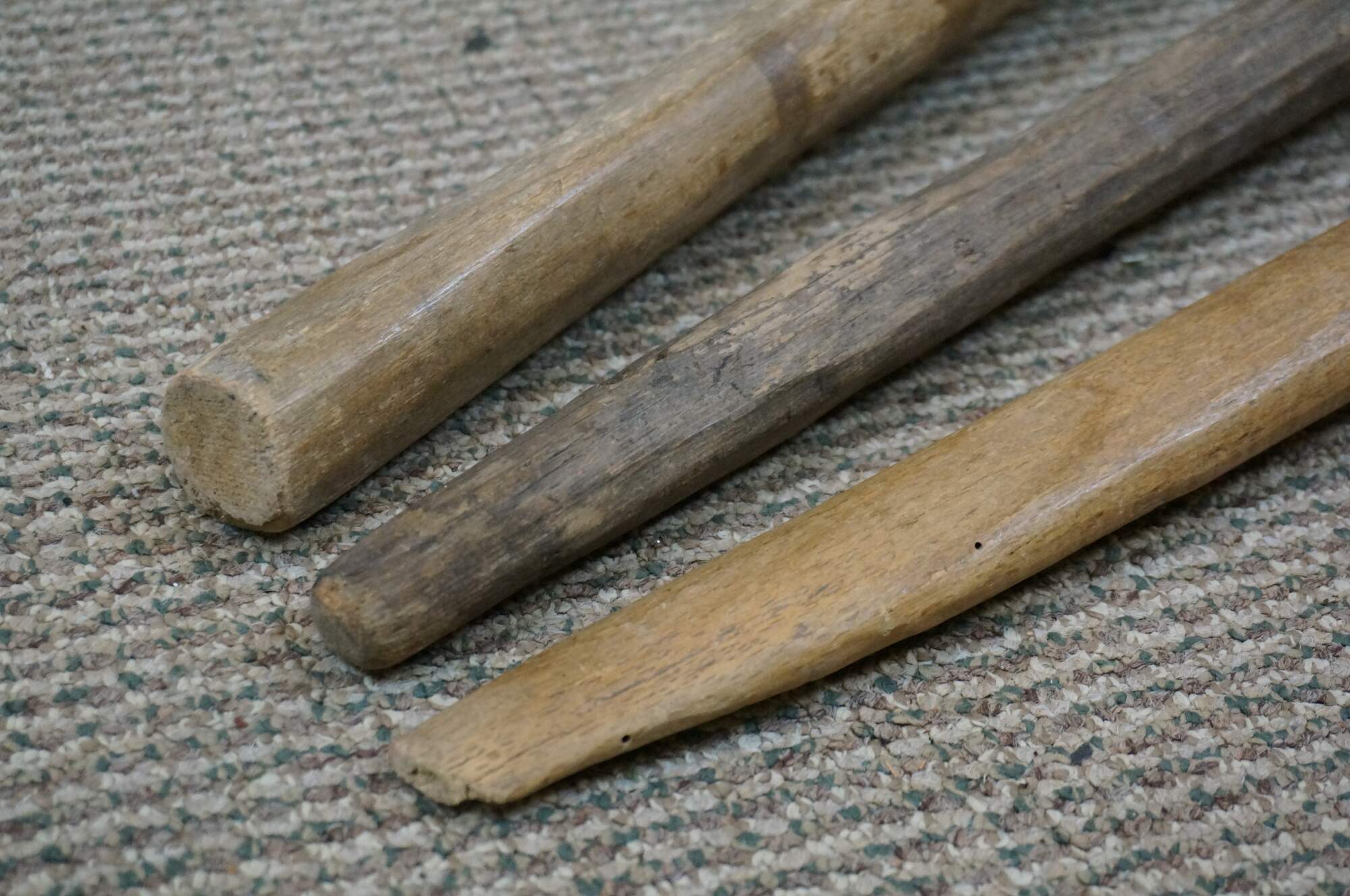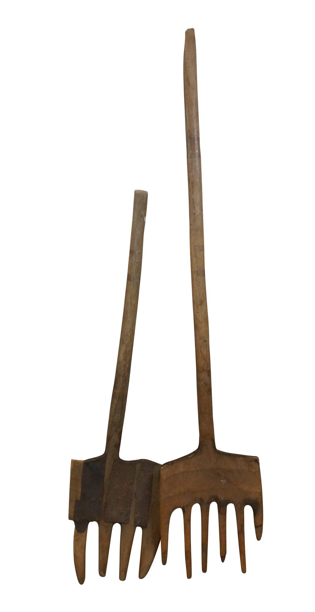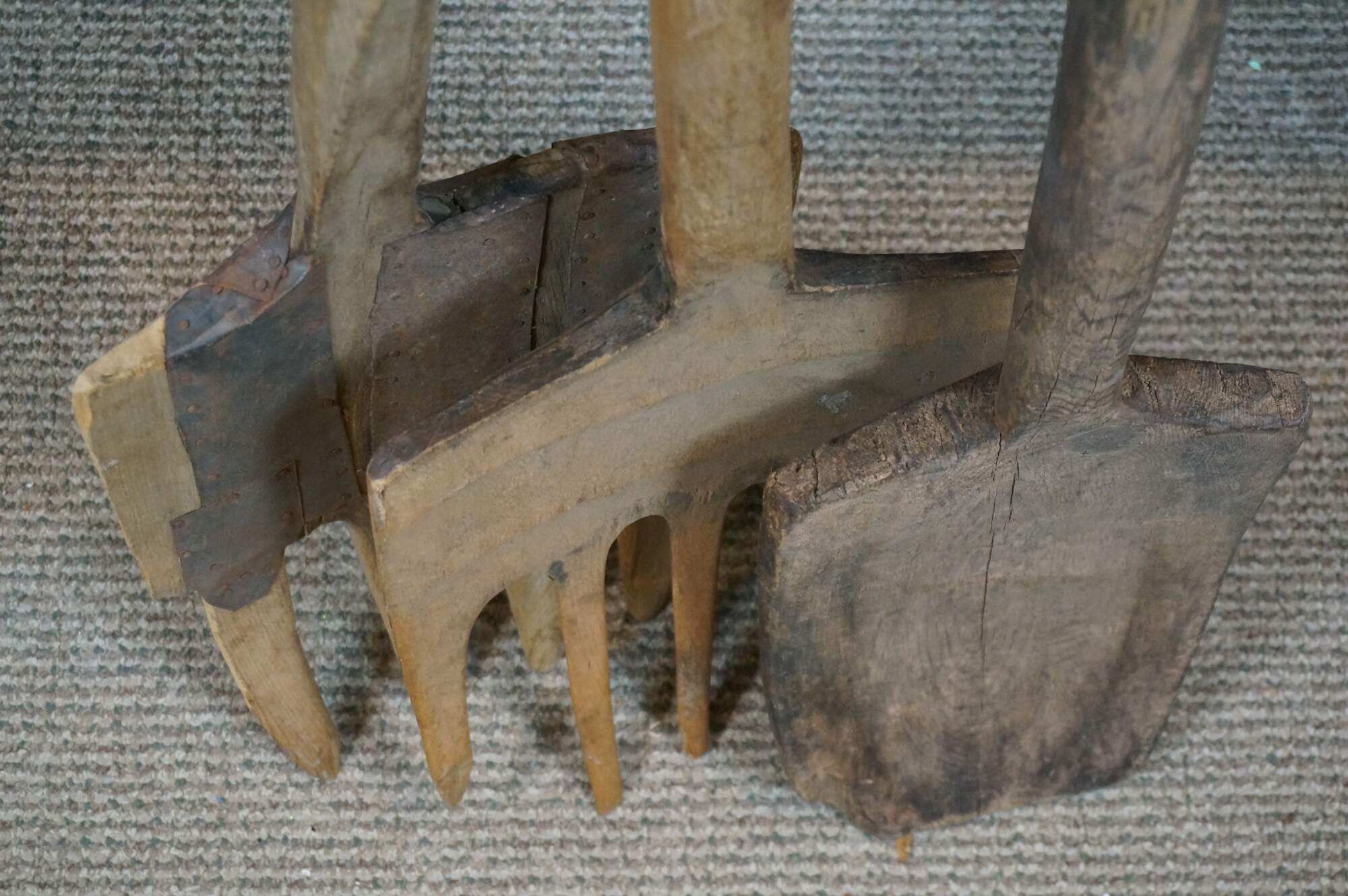 Set of 3 vintage handmade farm tools. Includes two hay forks and one coal shovel. Great for display