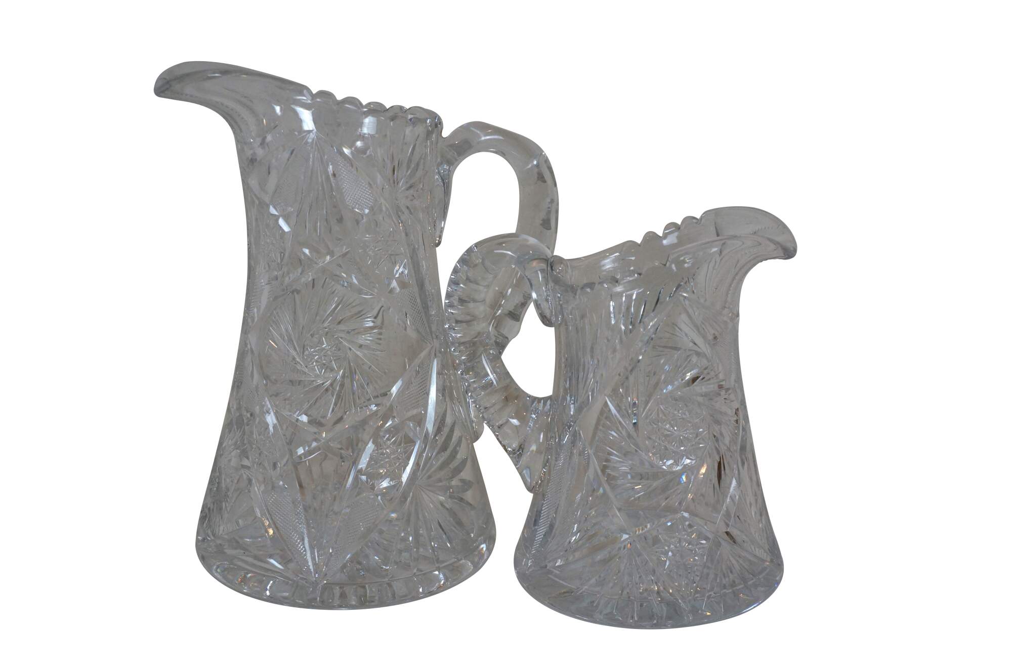 Lot of American Brilliant Cut Glass. Includes 2 Pitchers & 6 lowball Glasses. Each piece has a classic pinwheel design.