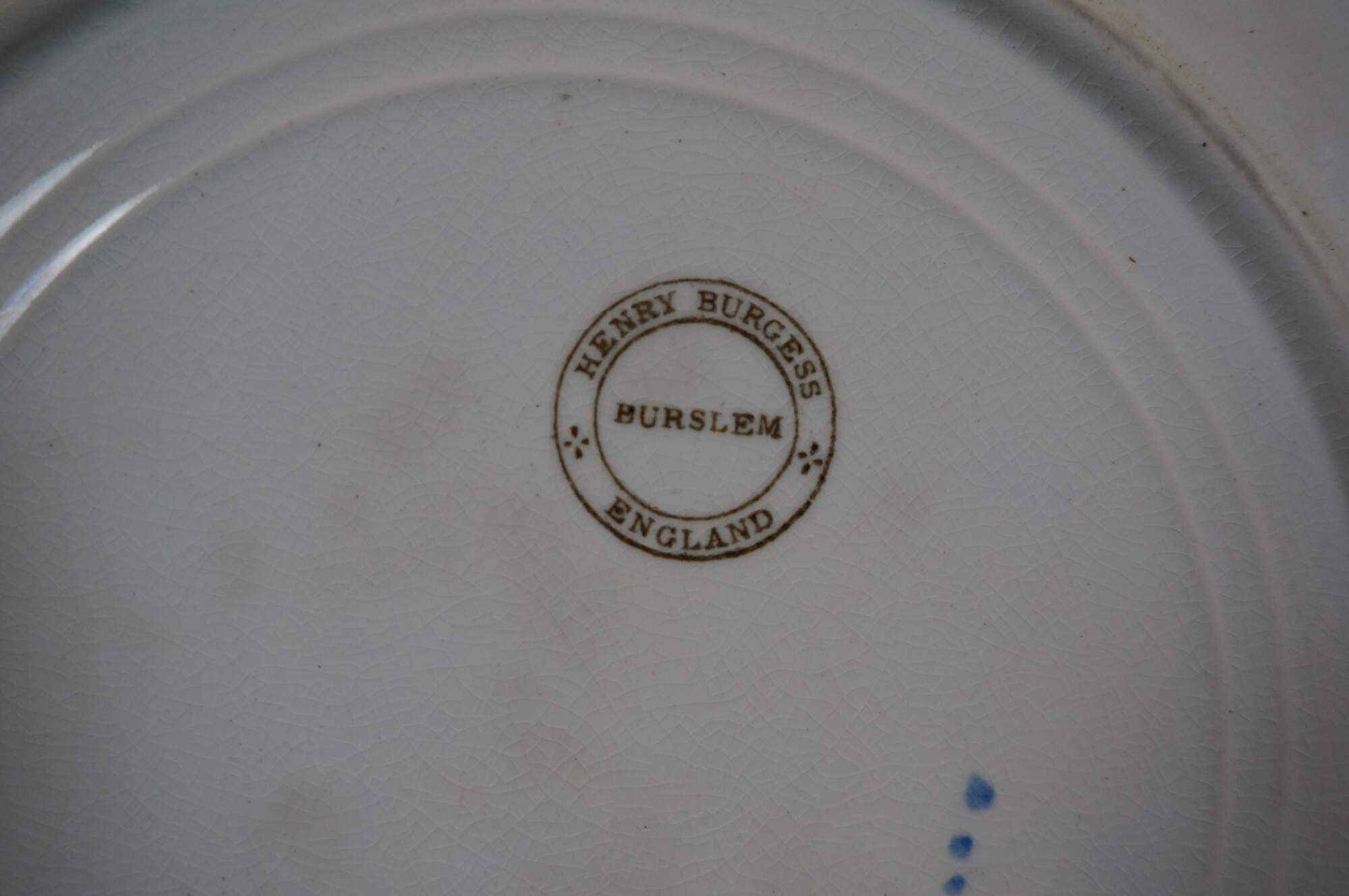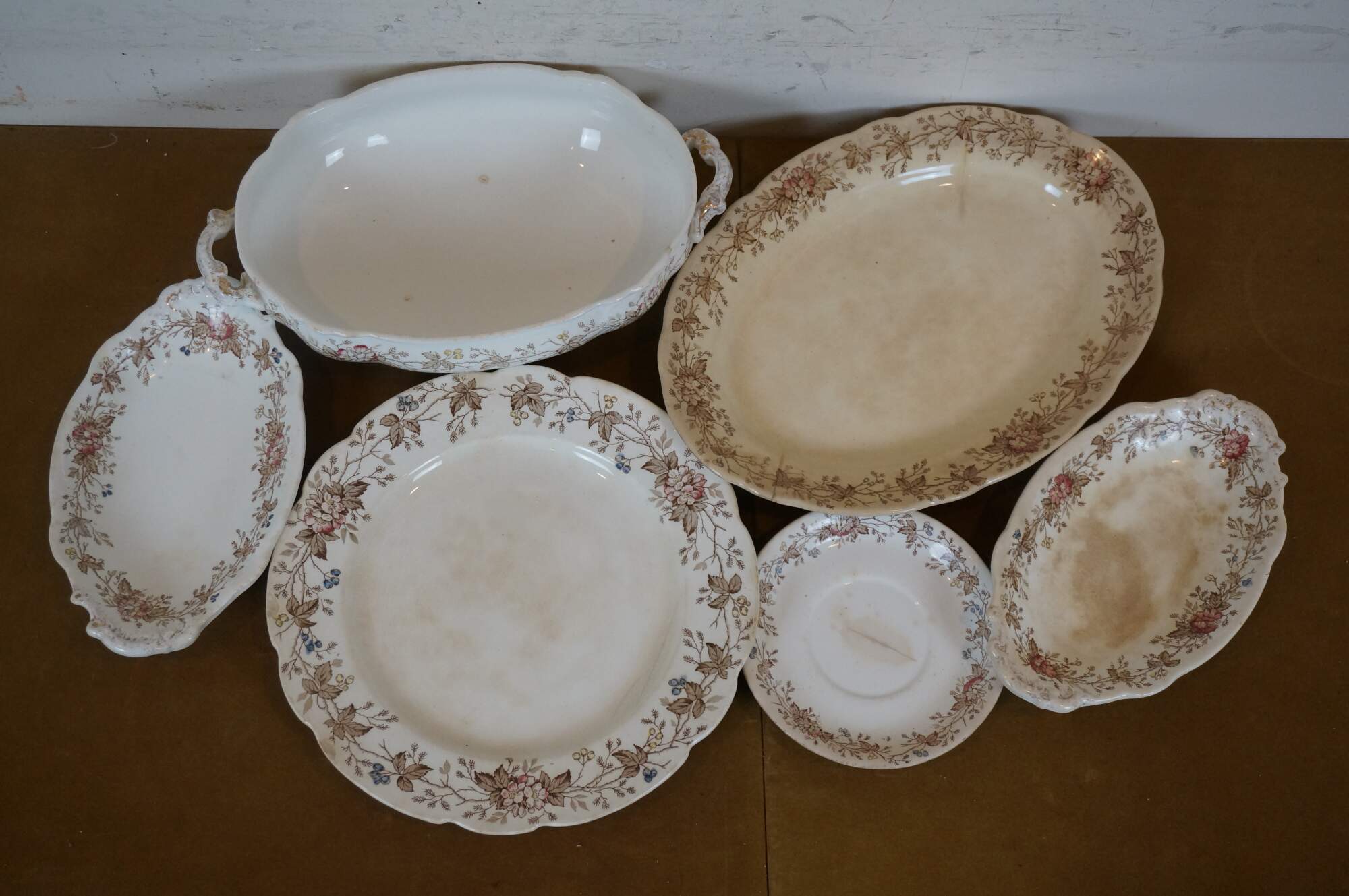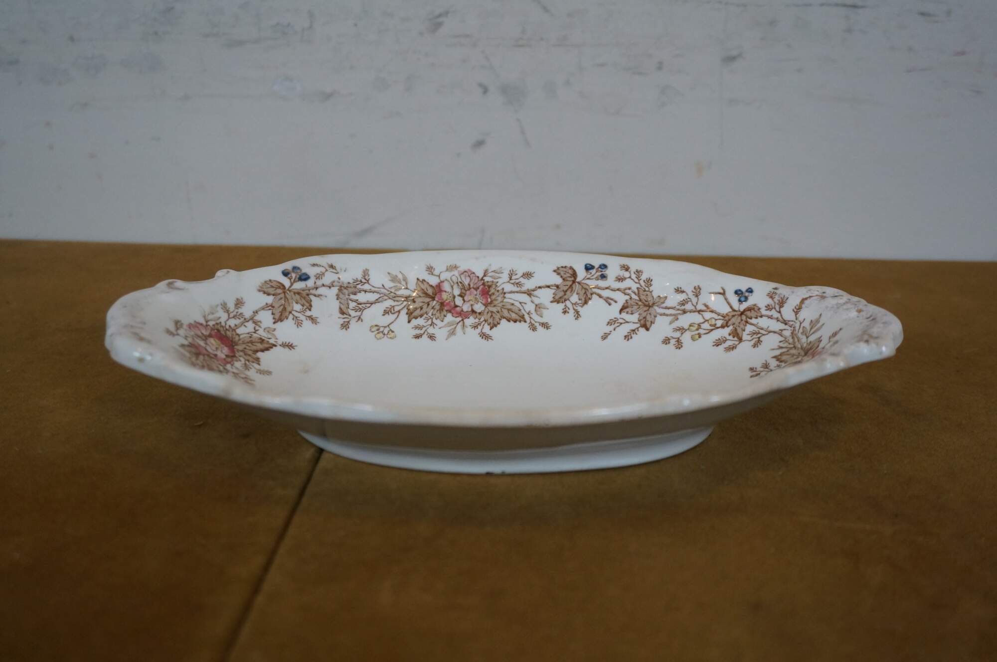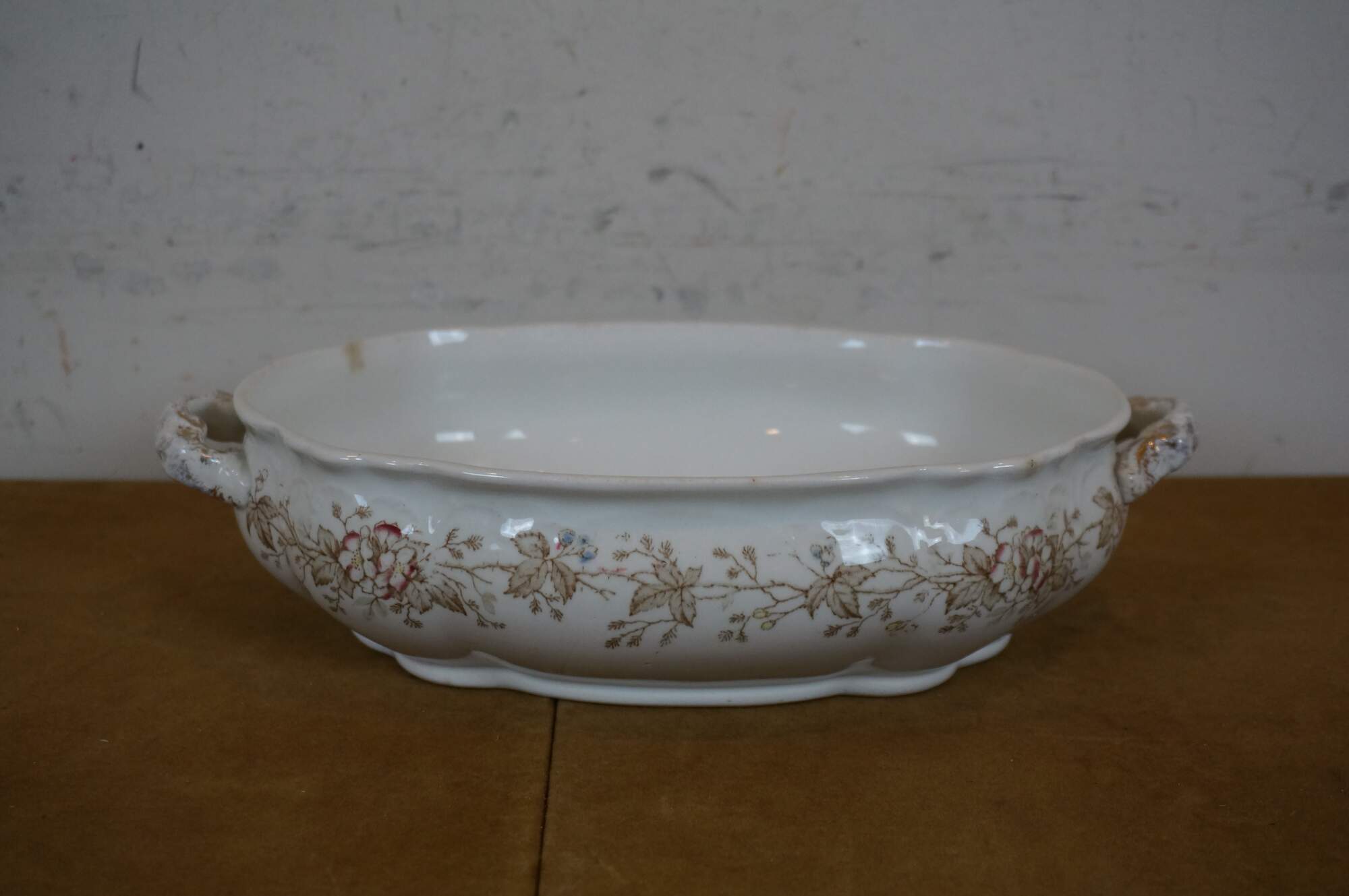 Lot 6 English Henry Burgess Burslem Ironstone serving pieces. Includes a tureen, Platter, serving plate, small plate and two serving dishes.