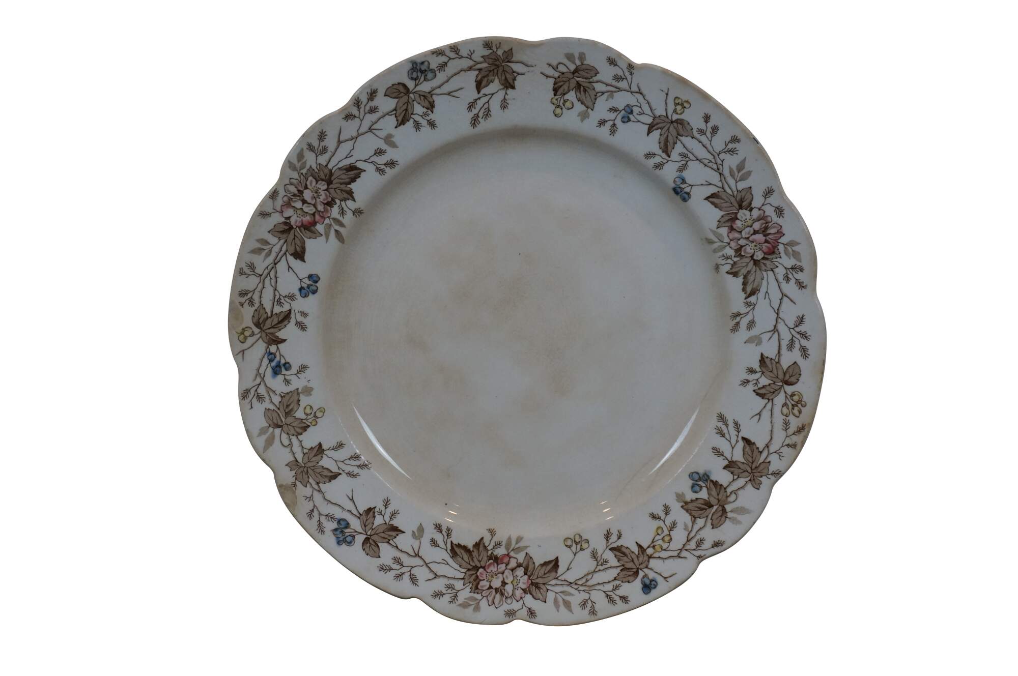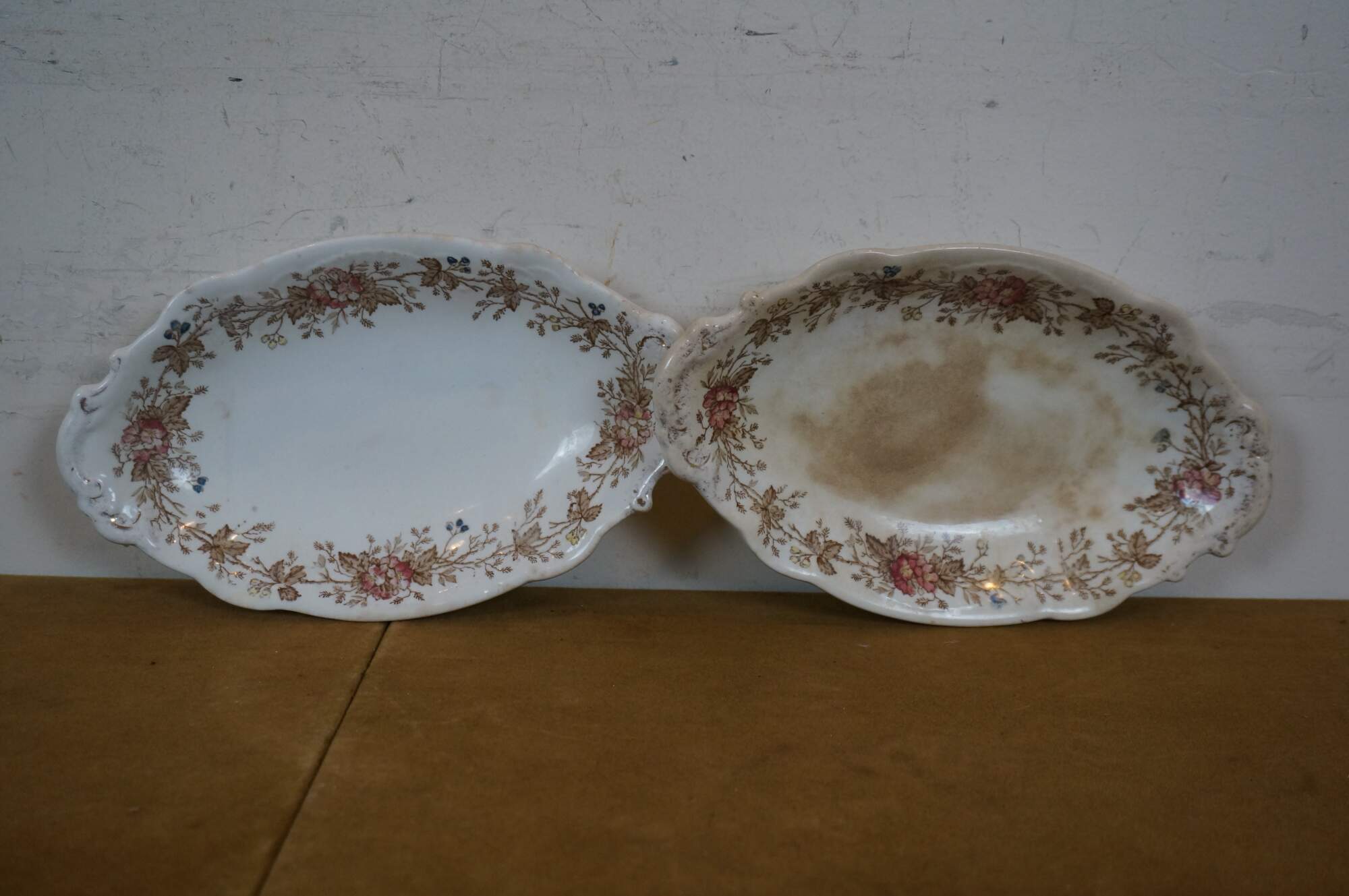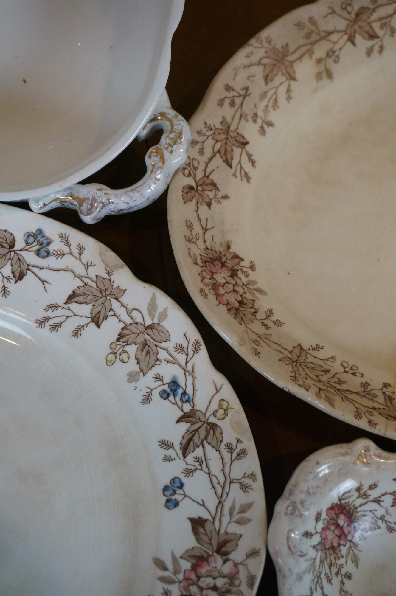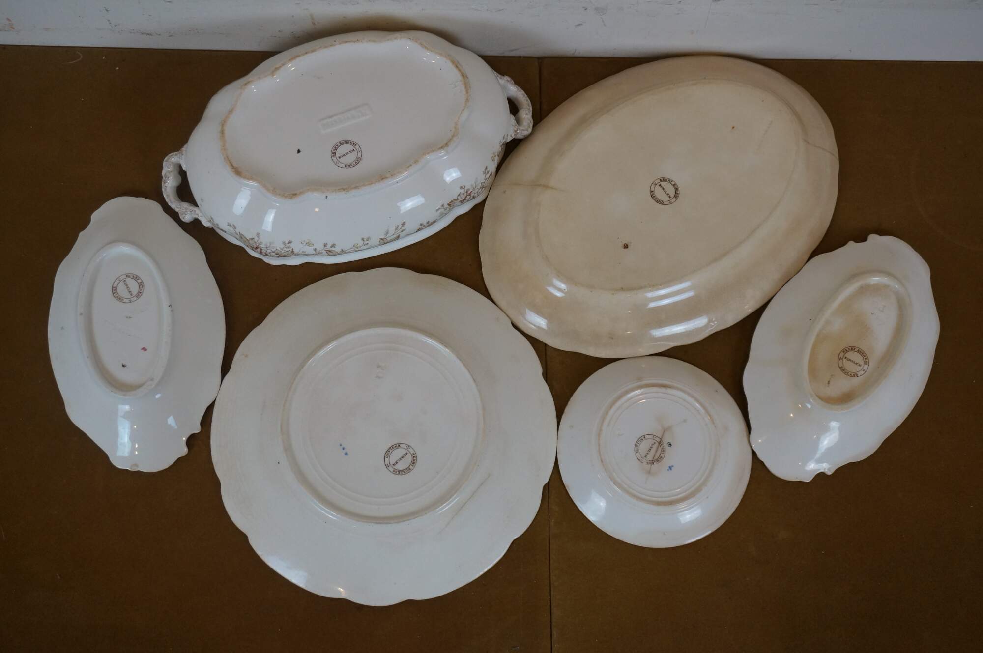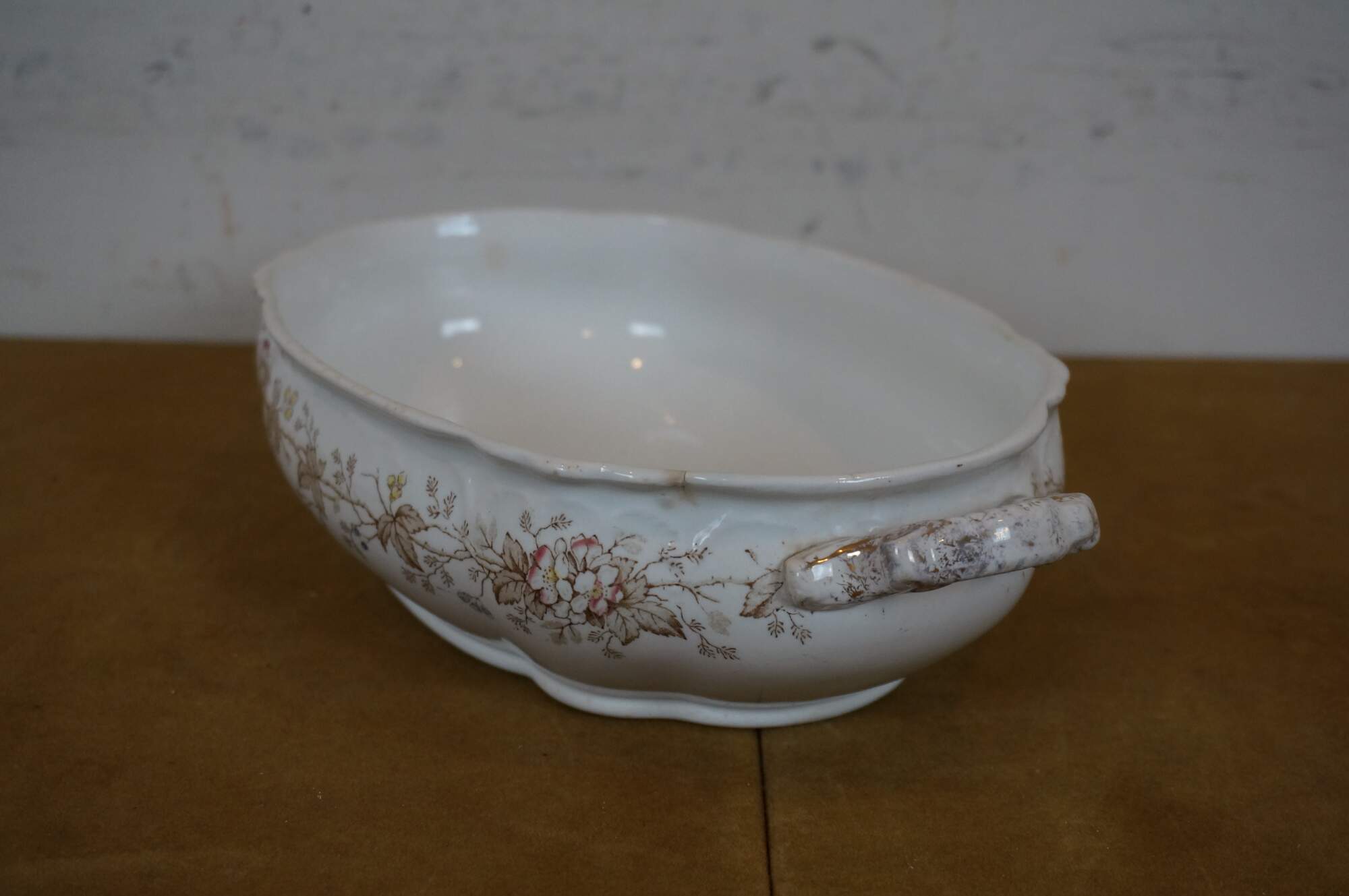 Lot 6 English Henry Burgess Burslem Ironstone serving pieces. Includes a tureen, Platter, serving plate, small plate and two serving dishes.