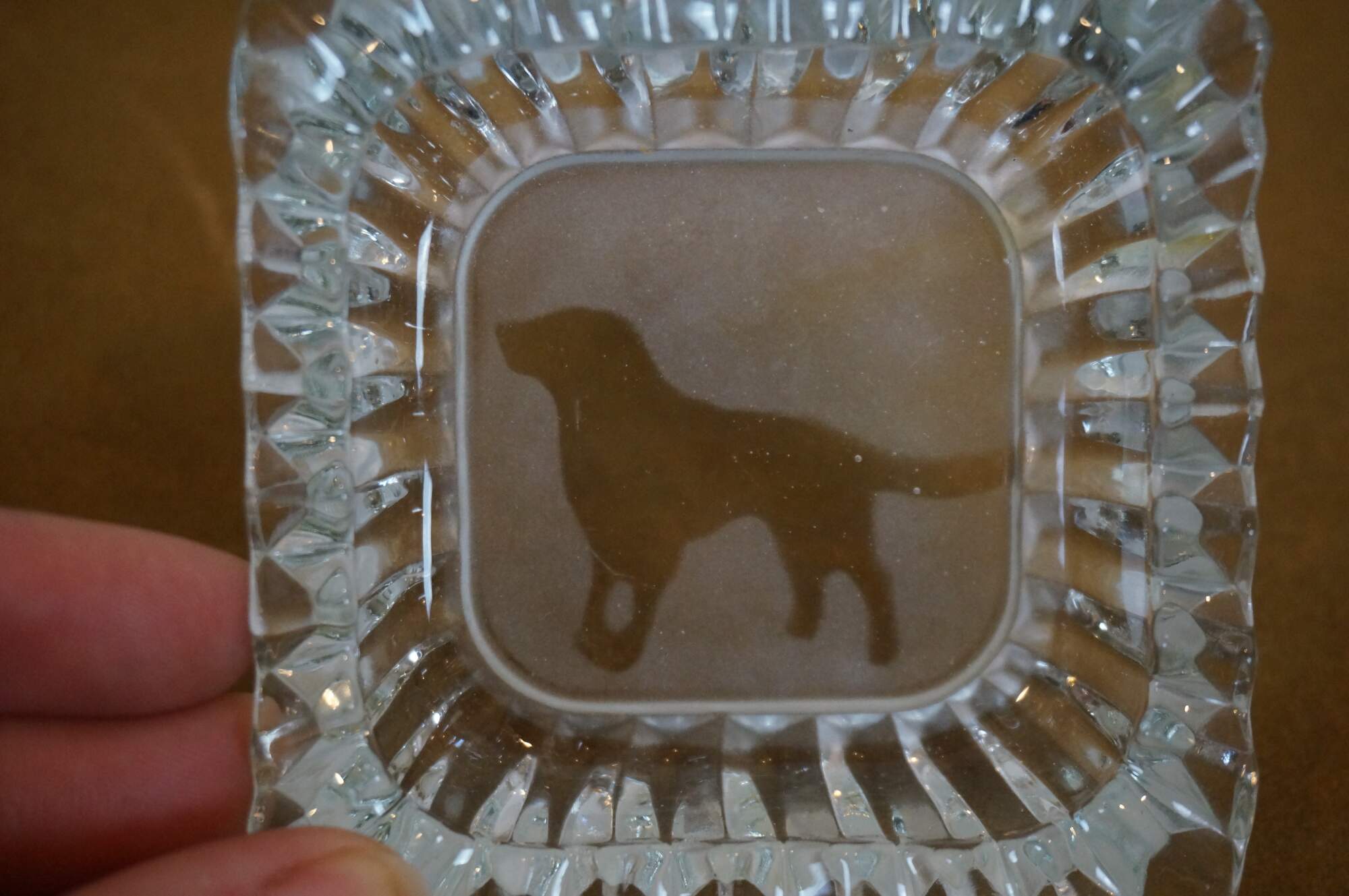 4 pc frosted cut glass storage box with golden retriever image and 3 dishes. The box was most likely used to store cigarettes with the other dishes being complimentary ashtrays