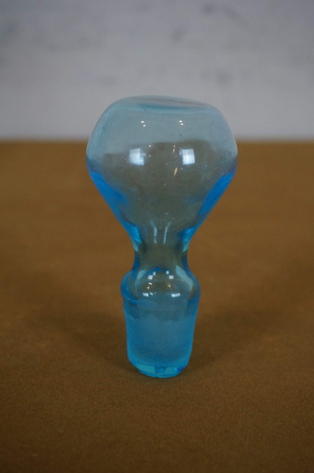 Mid Century Hand Blown Blue Hourglass Shaped Art Glass Bottle or Decanter. Double gourd shaped with stopper.