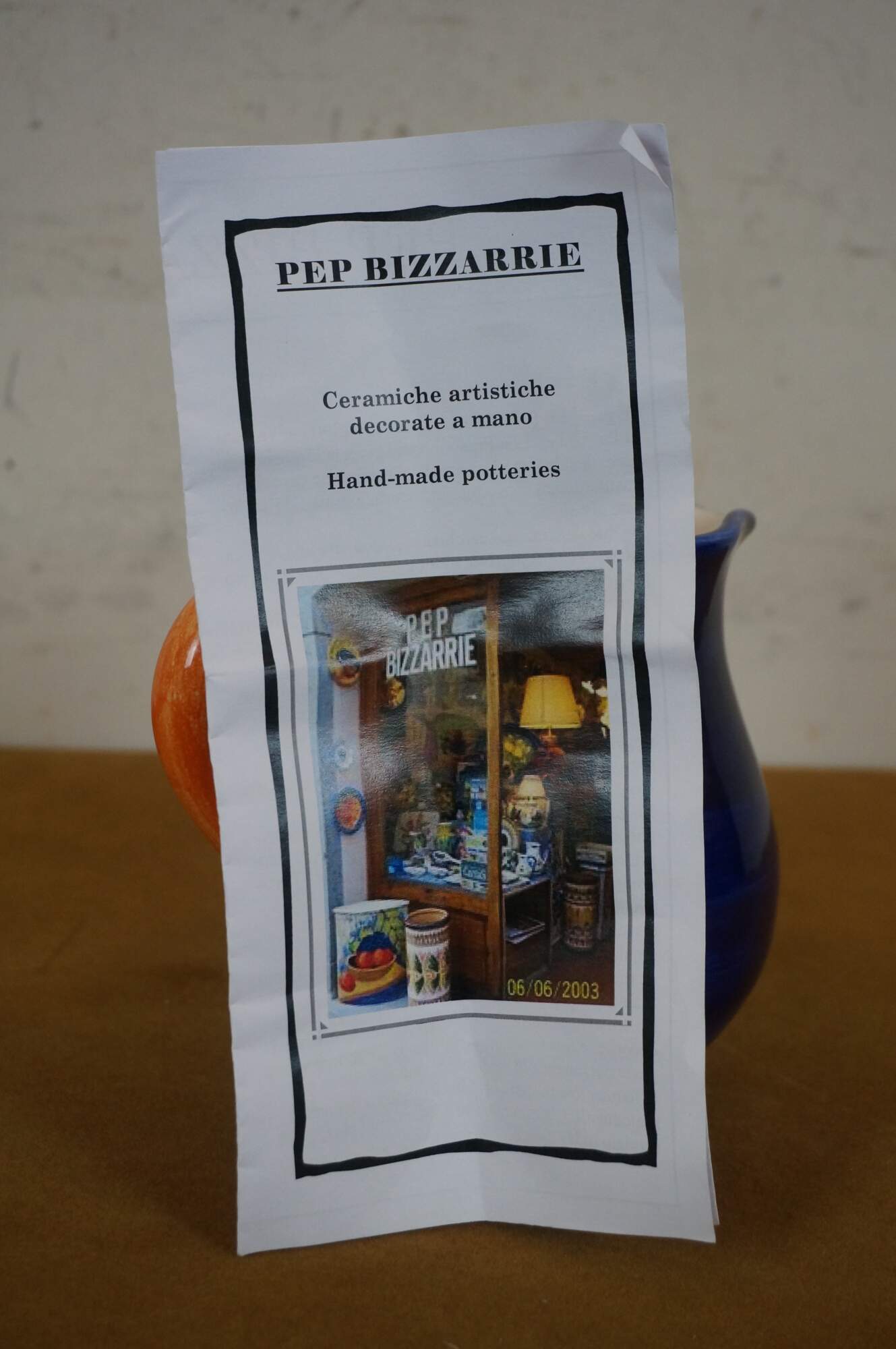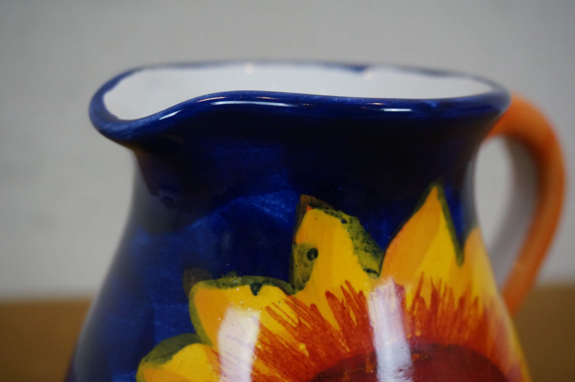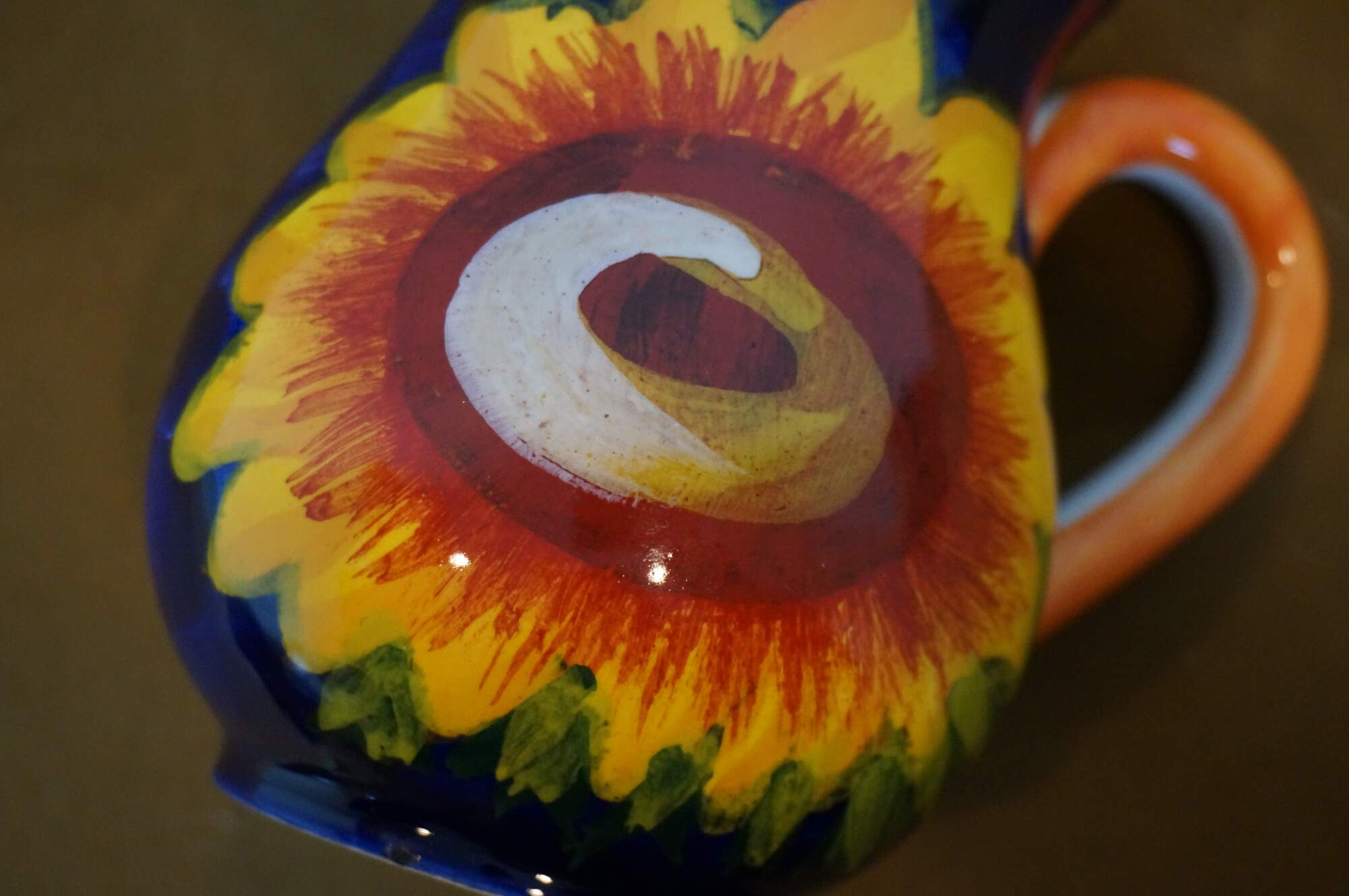 Vintage sunflower pitcher by Pep Bizzarrie. Pep Bizzarrie is an Italian pottery brand that sells hand-painted plates, vases, and bowls. The pottery is made in Chianti Toscana, Italy.