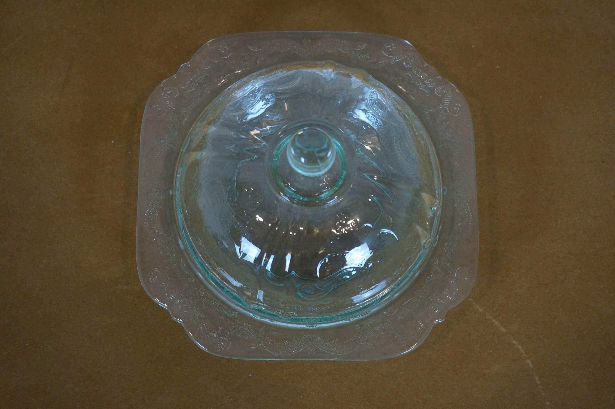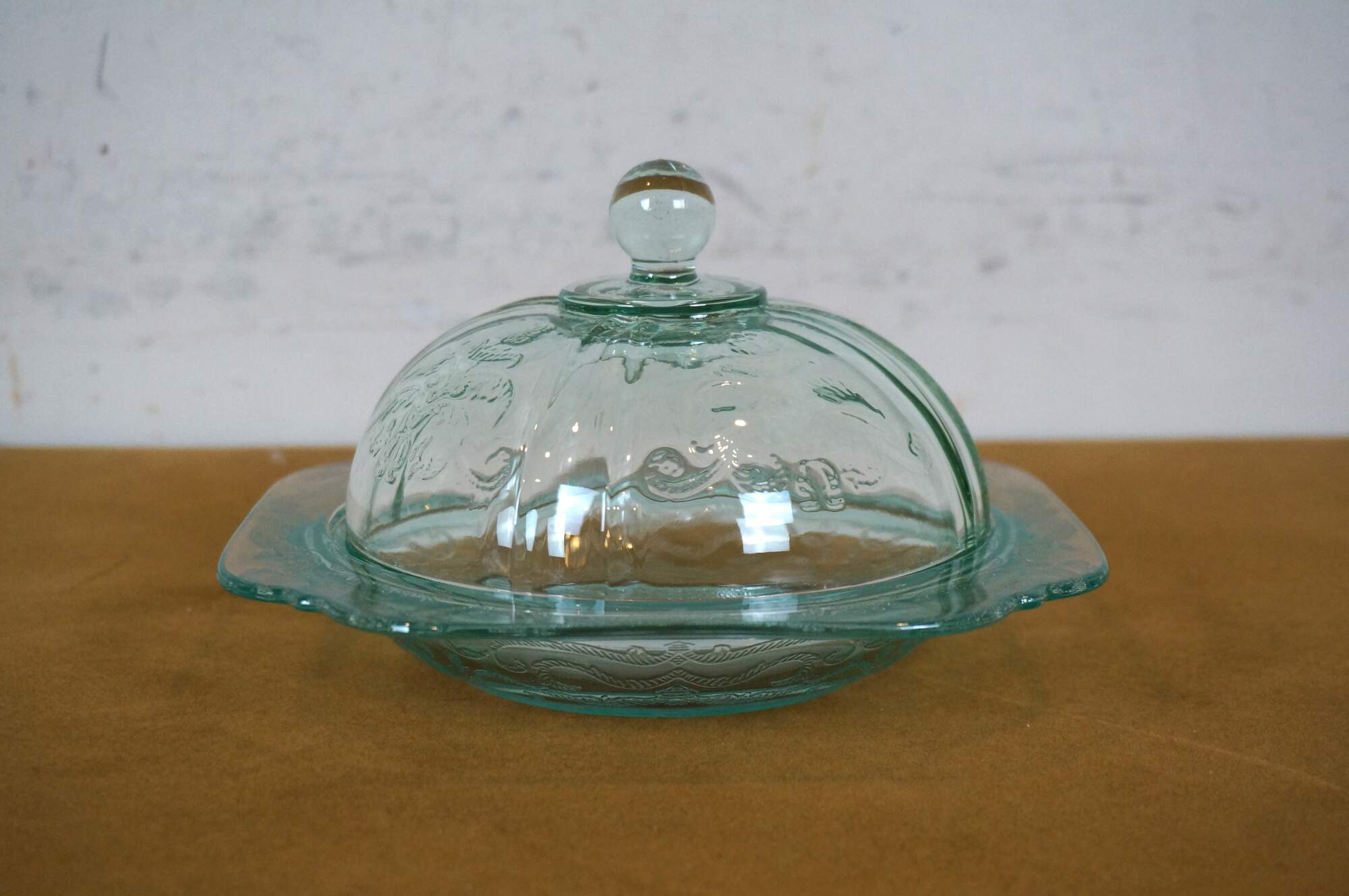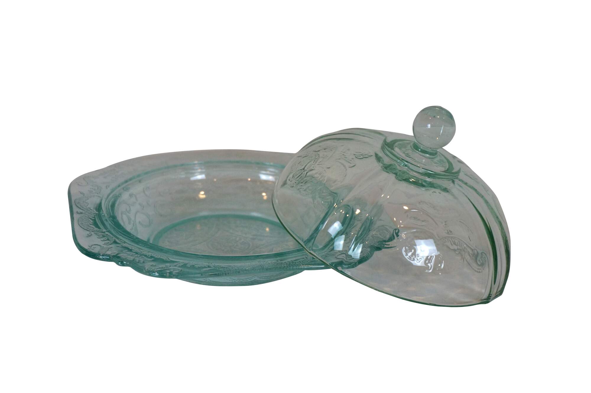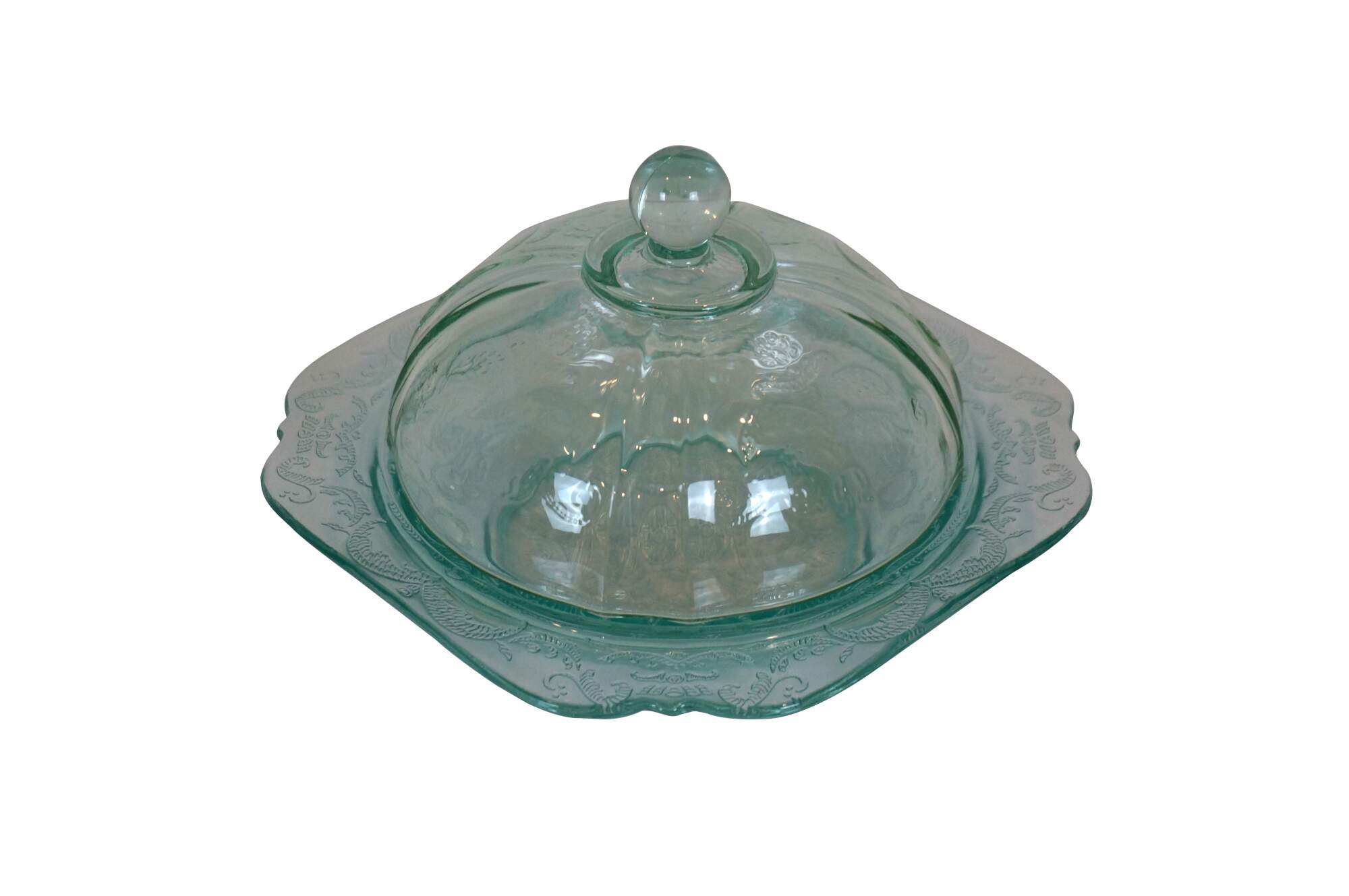 Vintage Indiana Glass Co Recollection aqua / sea green / teal reproduction Madrid Federal Depression glass-covered butter or cheese dish plate.