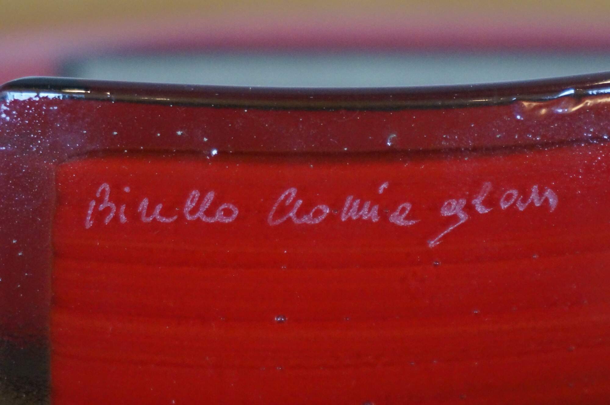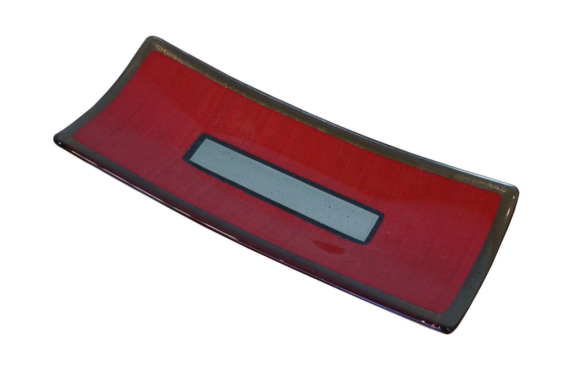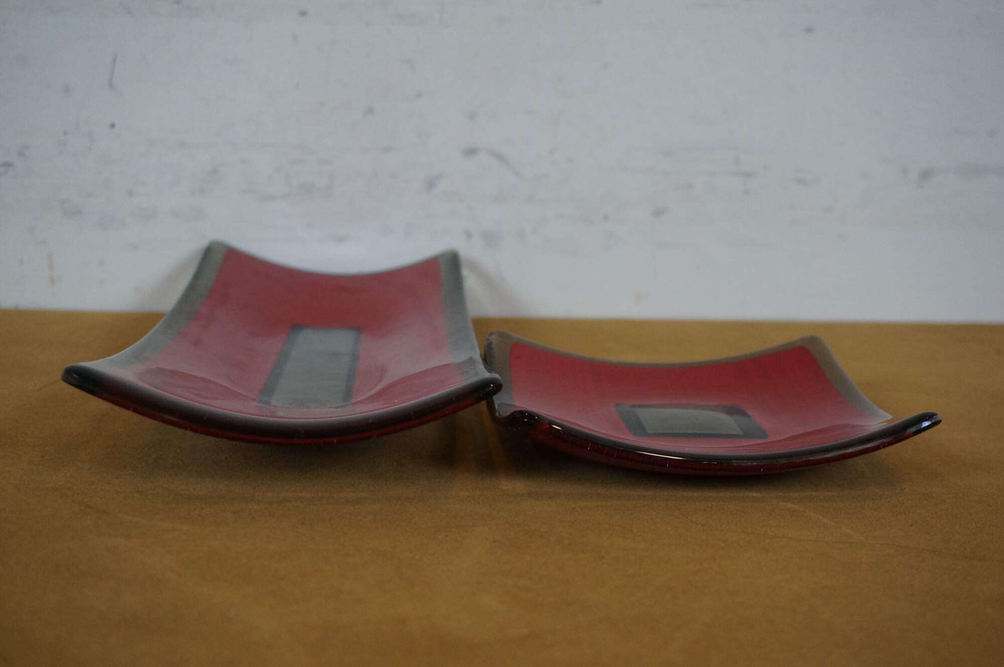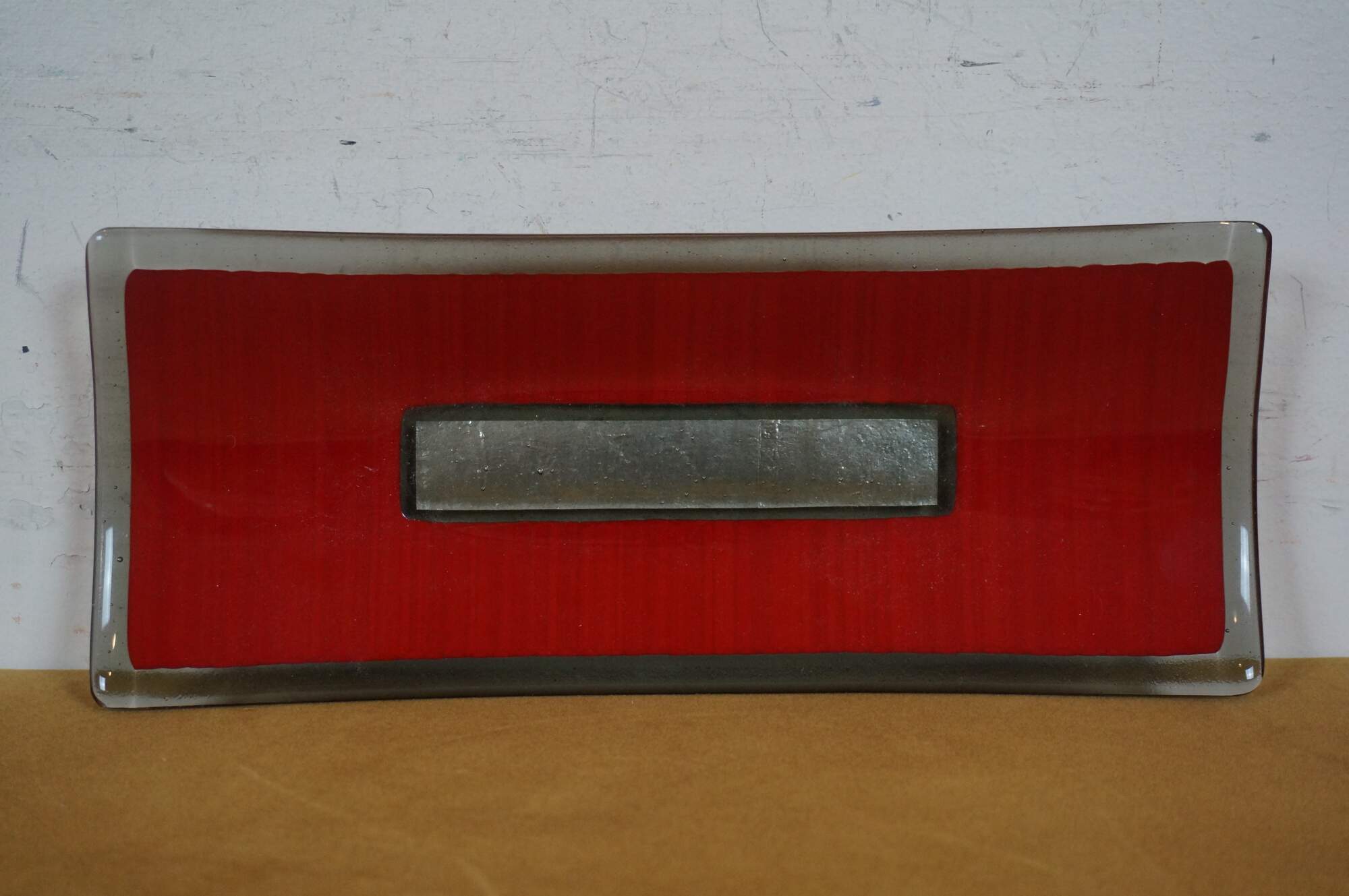 Two vintage Stefano Birello Venetian Murano Studio Art Glass tray / dish / plates featuring a modern red and silver Cromia glass design. Stefano is an artist born in Italy in 1966.