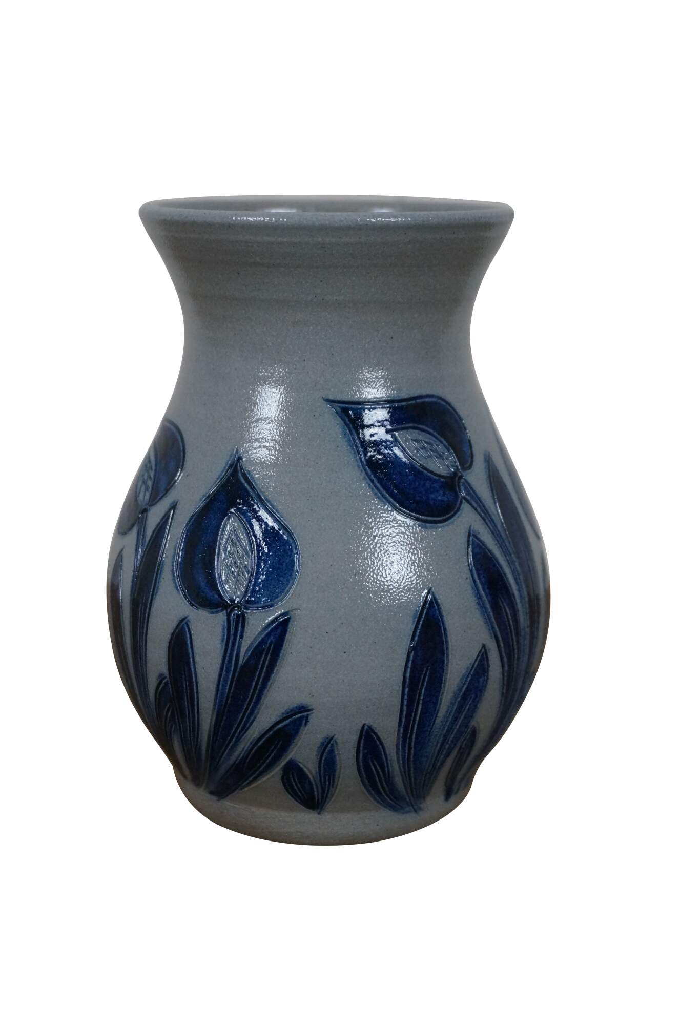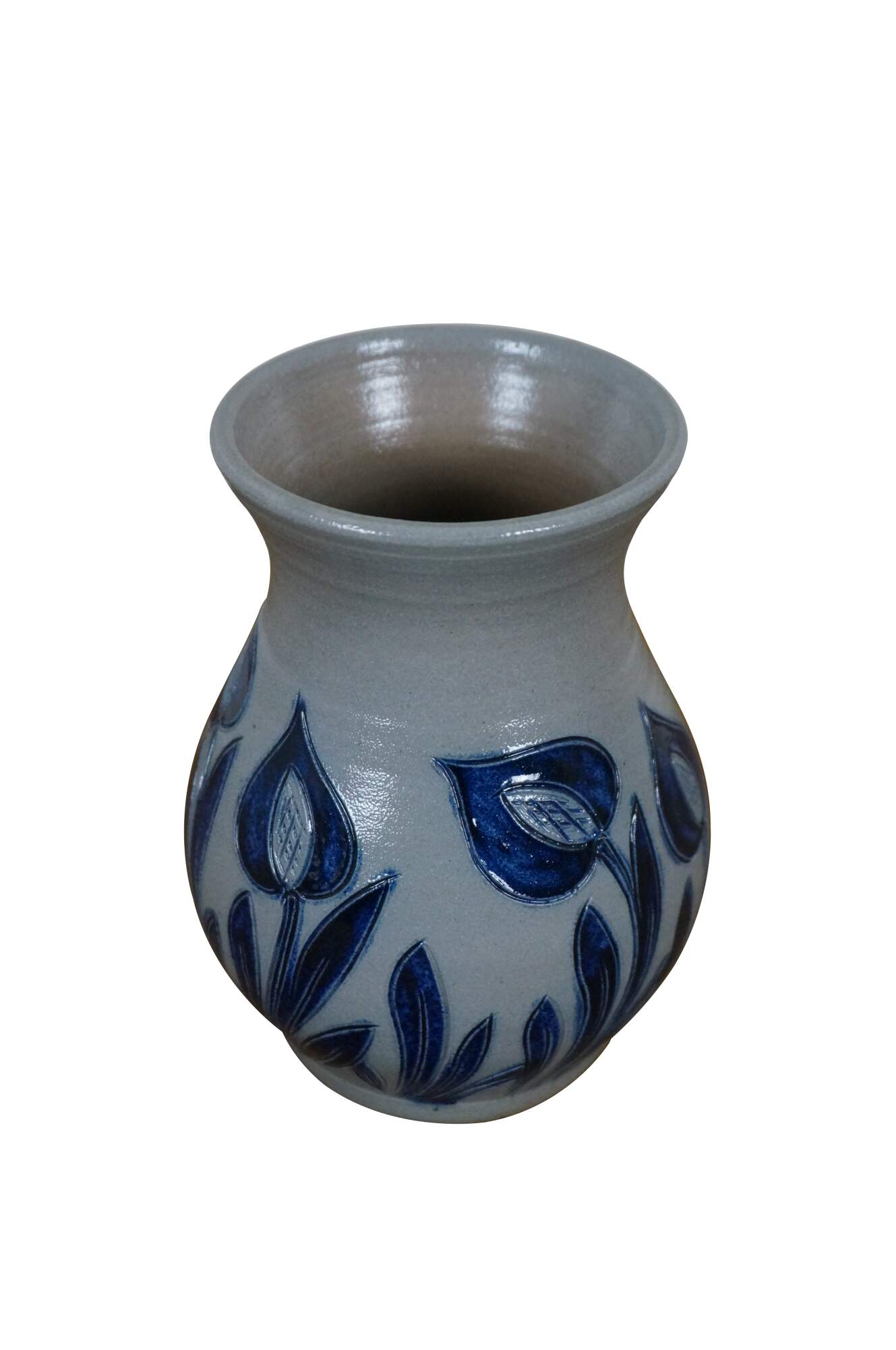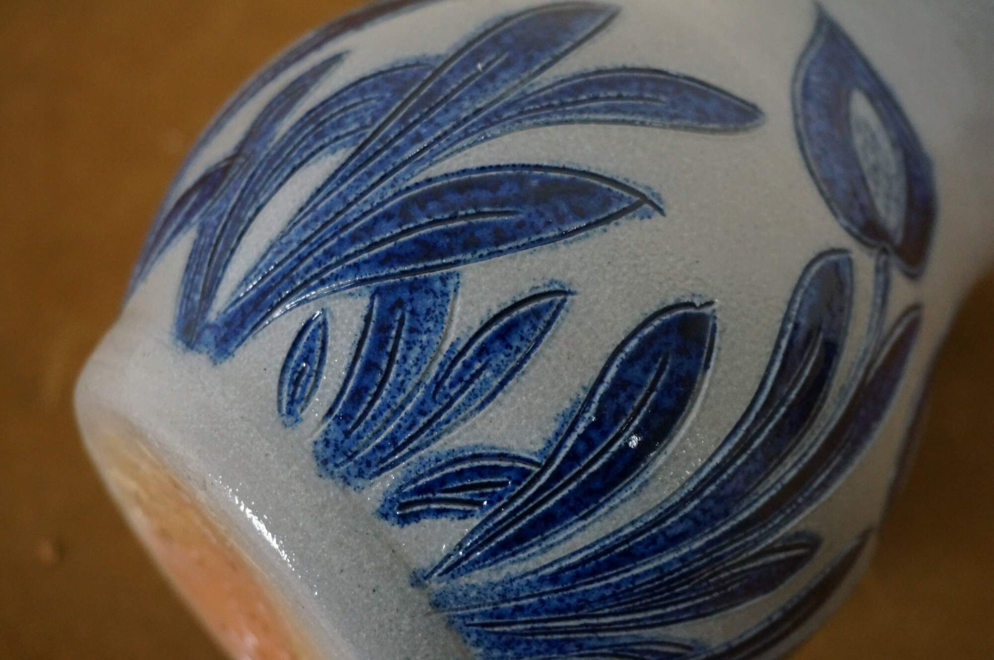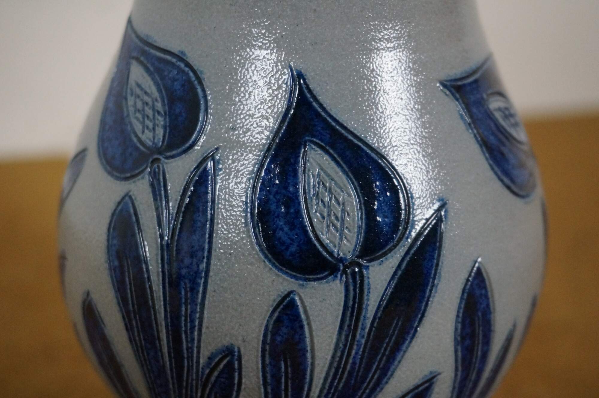 Potiers Alsace / Gres D'Alsace Betschdorf France salt glaze bud vase featuring a cobalt blue floral Art Nouveau theme.