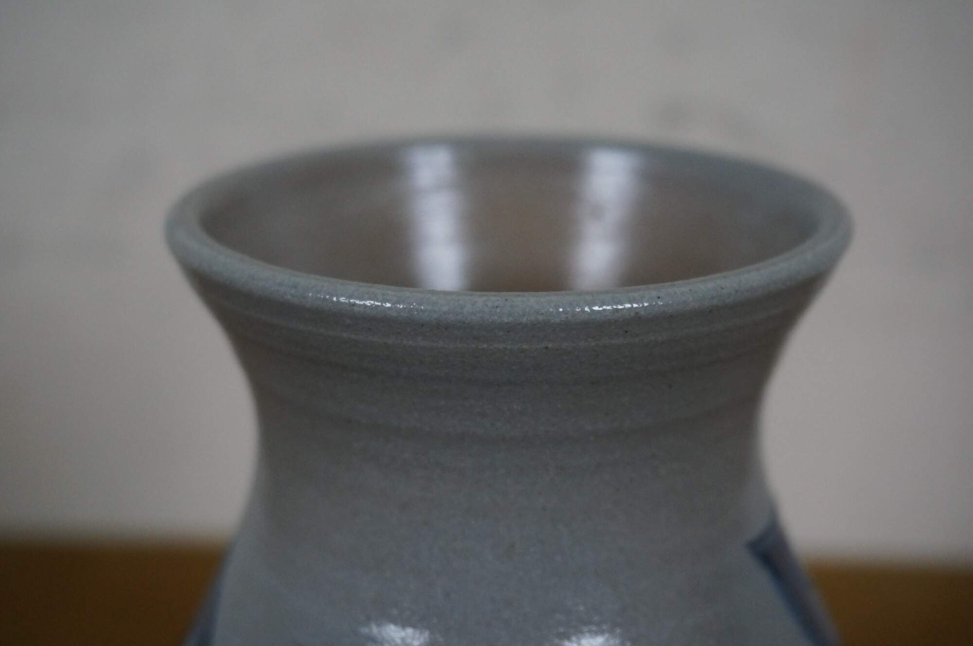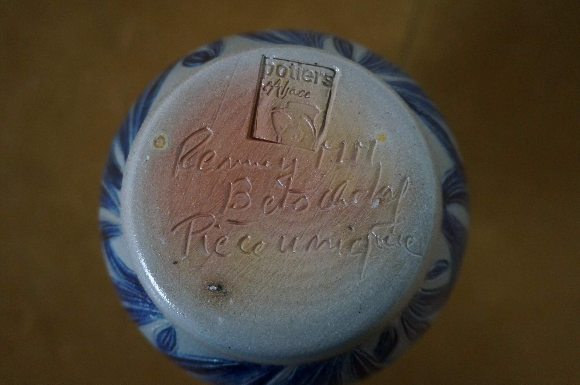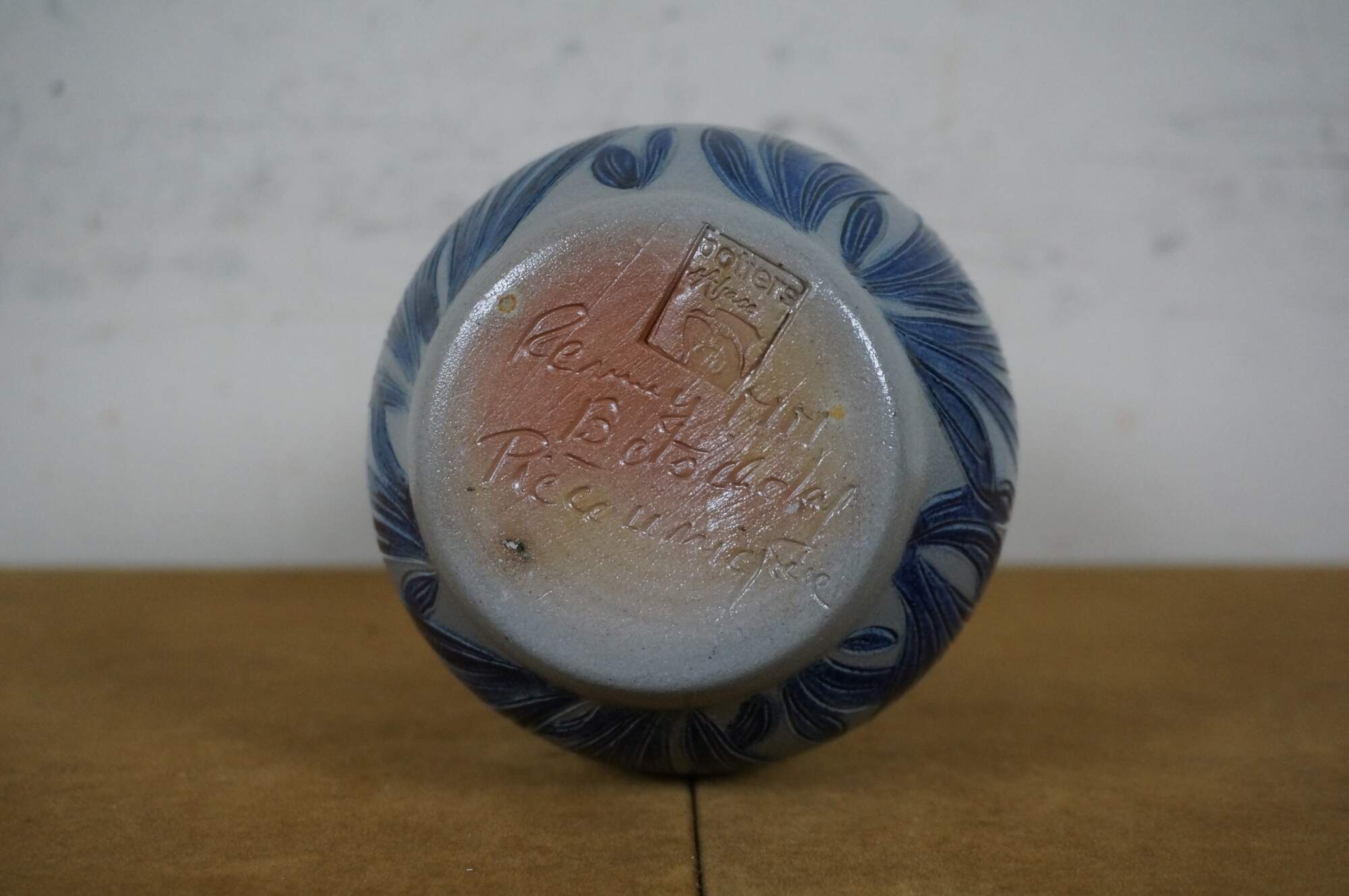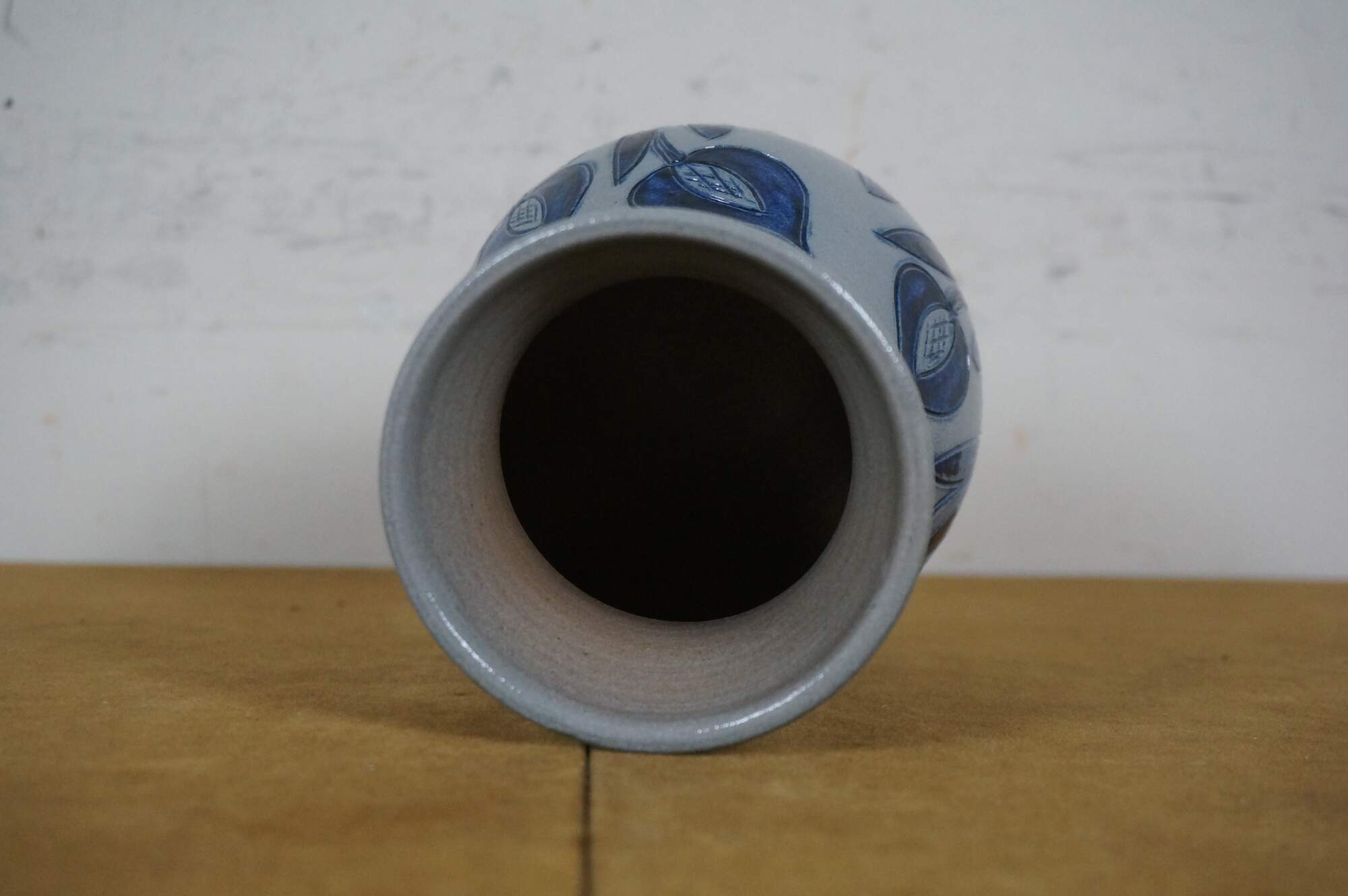 Potiers Alsace / Gres D'Alsace Betschdorf France salt glaze bud vase featuring a cobalt blue floral Art Nouveau theme.