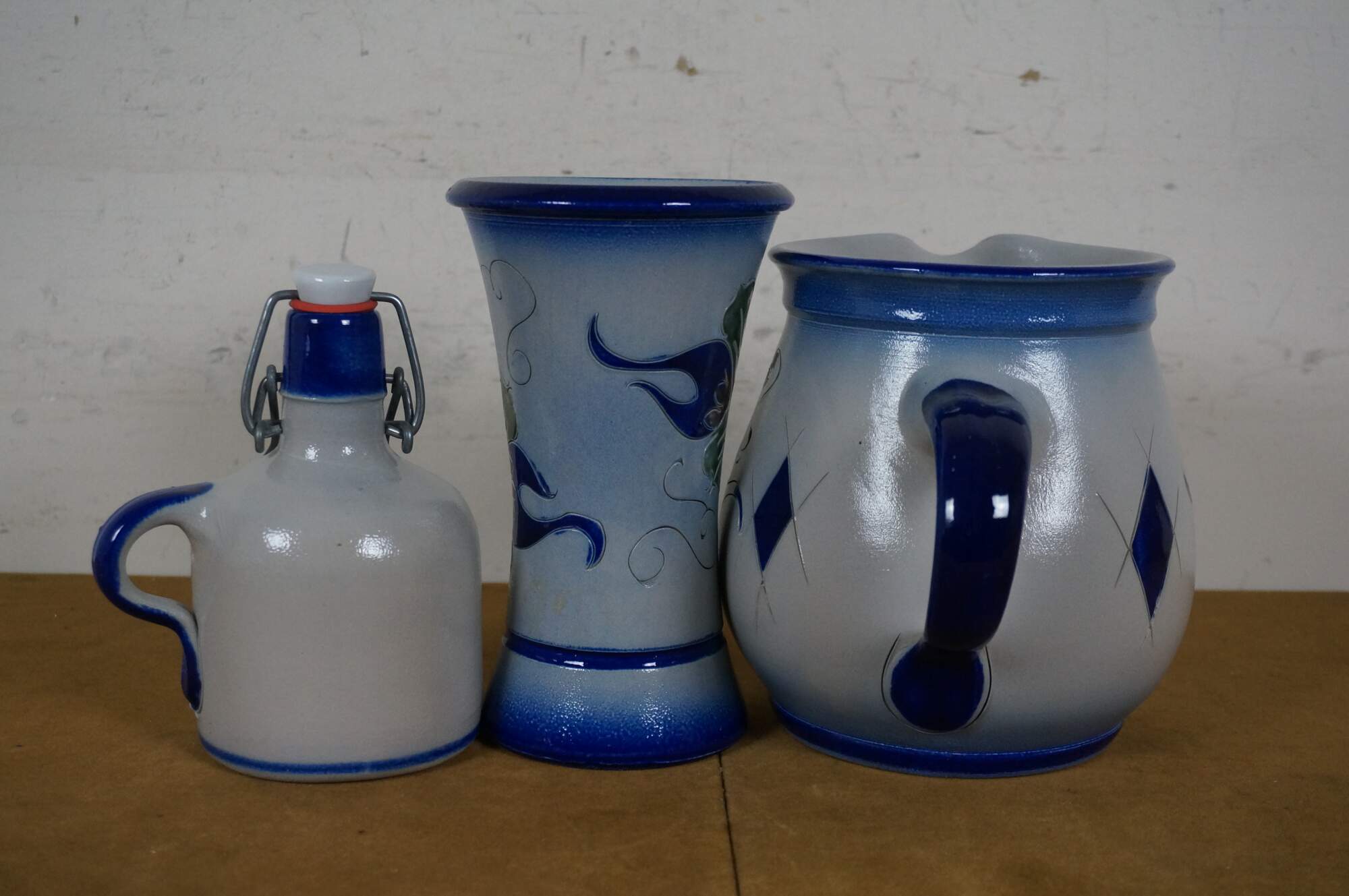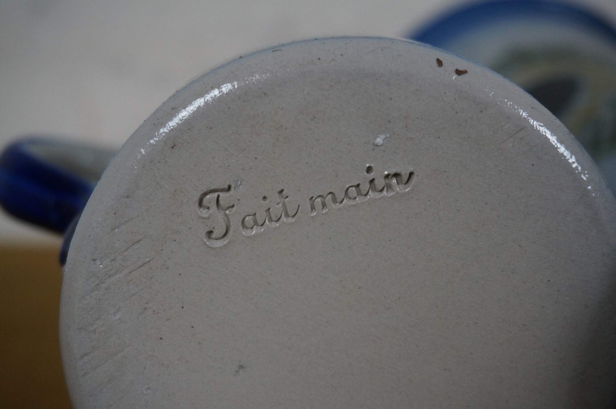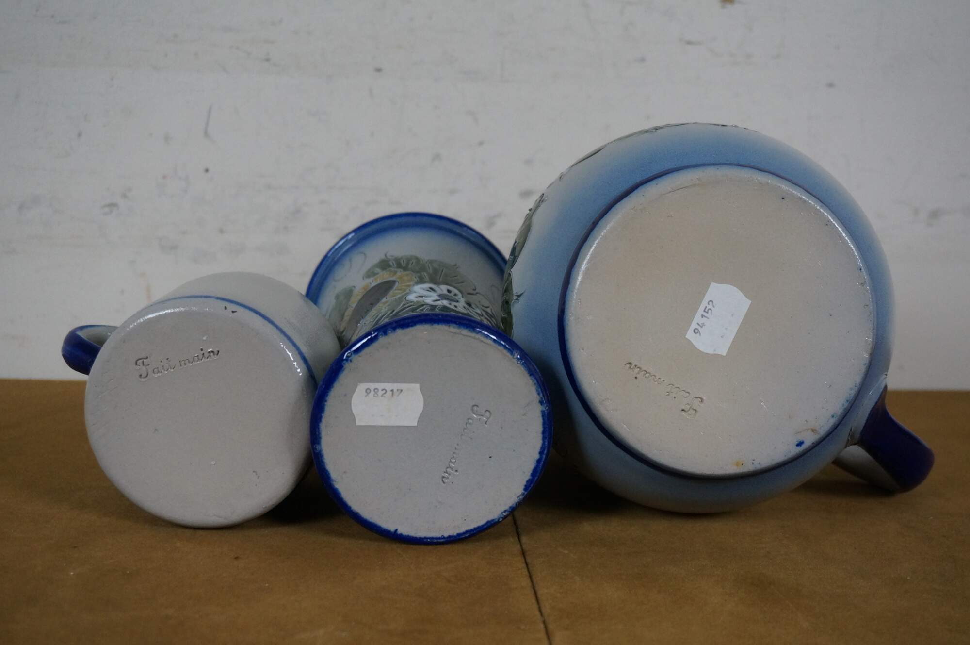 Vintage three piece French Fait Main salt glaze stoneware pottery. Features pitcher, vase and eau de vie (Brandy liquor) jug with stopper and latch - two decorated with a floral and sunflower theme, the other with grapevine. Made in France.