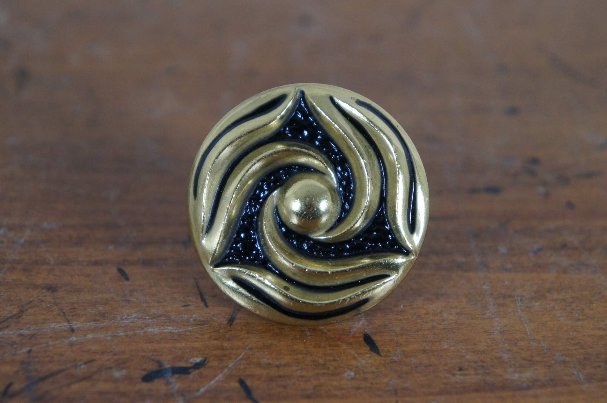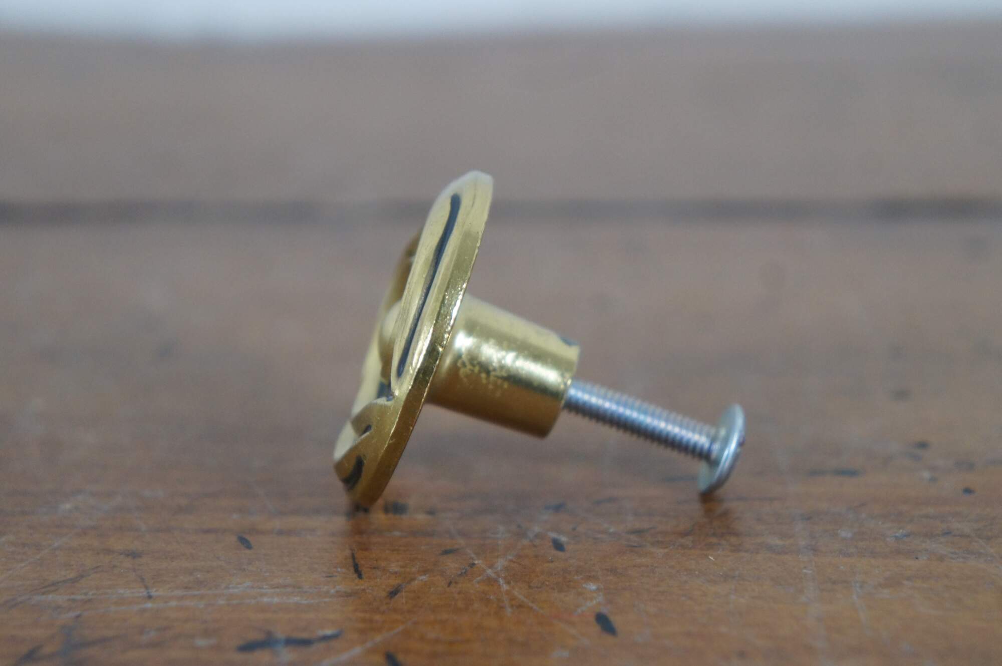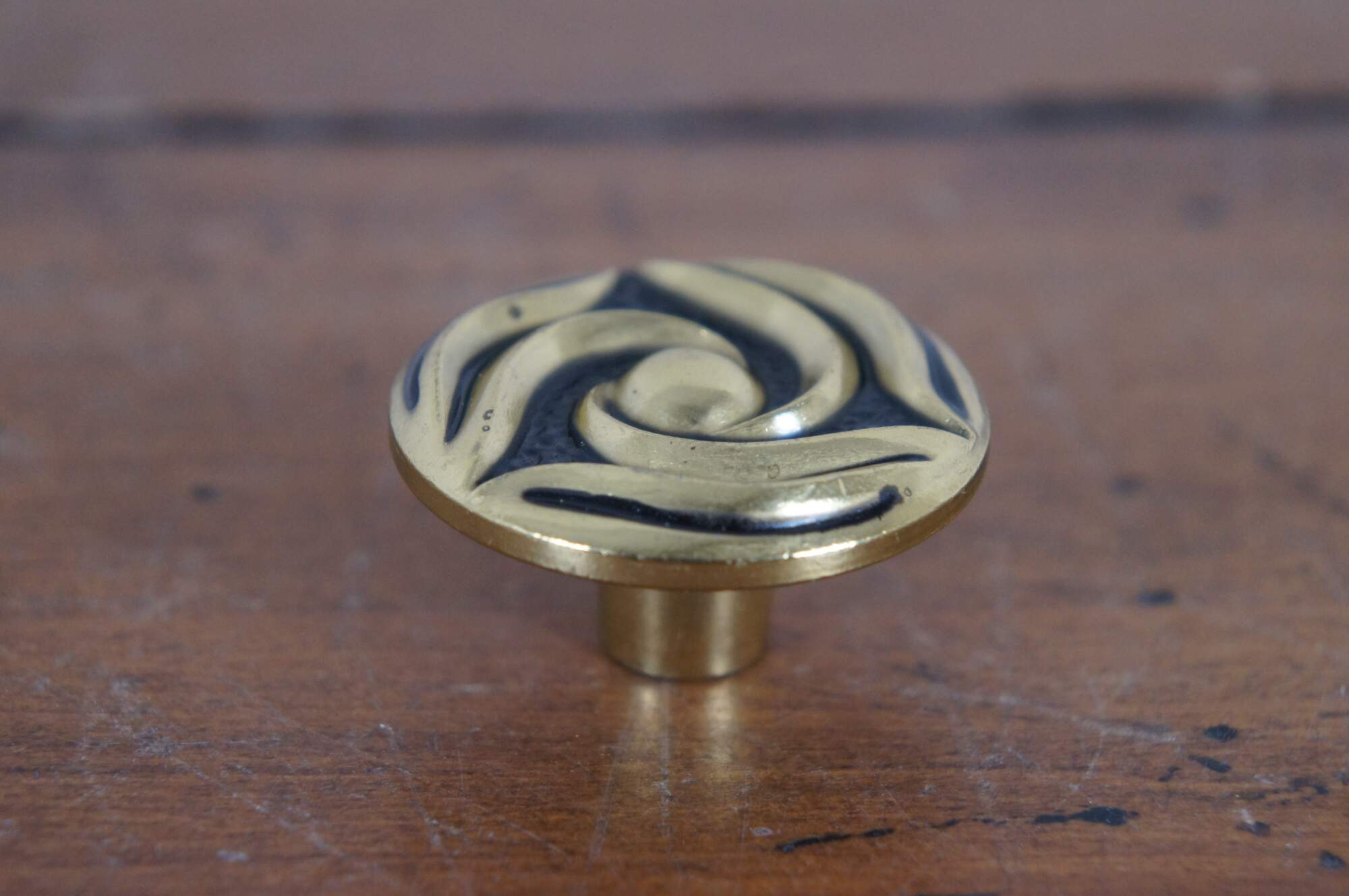 18 Available - Mid to late 20th century old-stock drawer / cabinet pulls. National Lock Company - Medalist knob. Antique brass finish. Mid century modern styling. Round / circular shape with abstract rose / swirl rosette design.