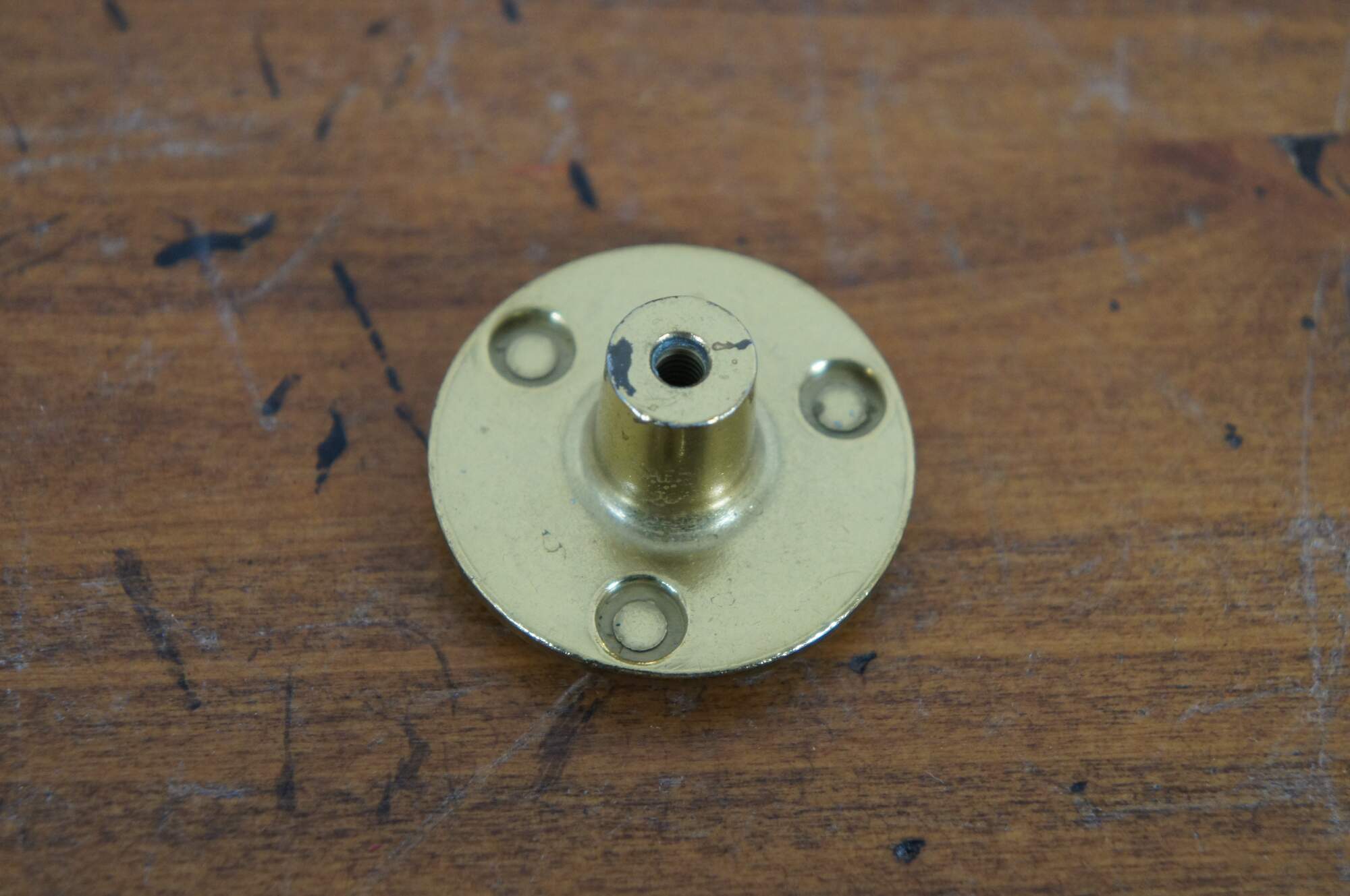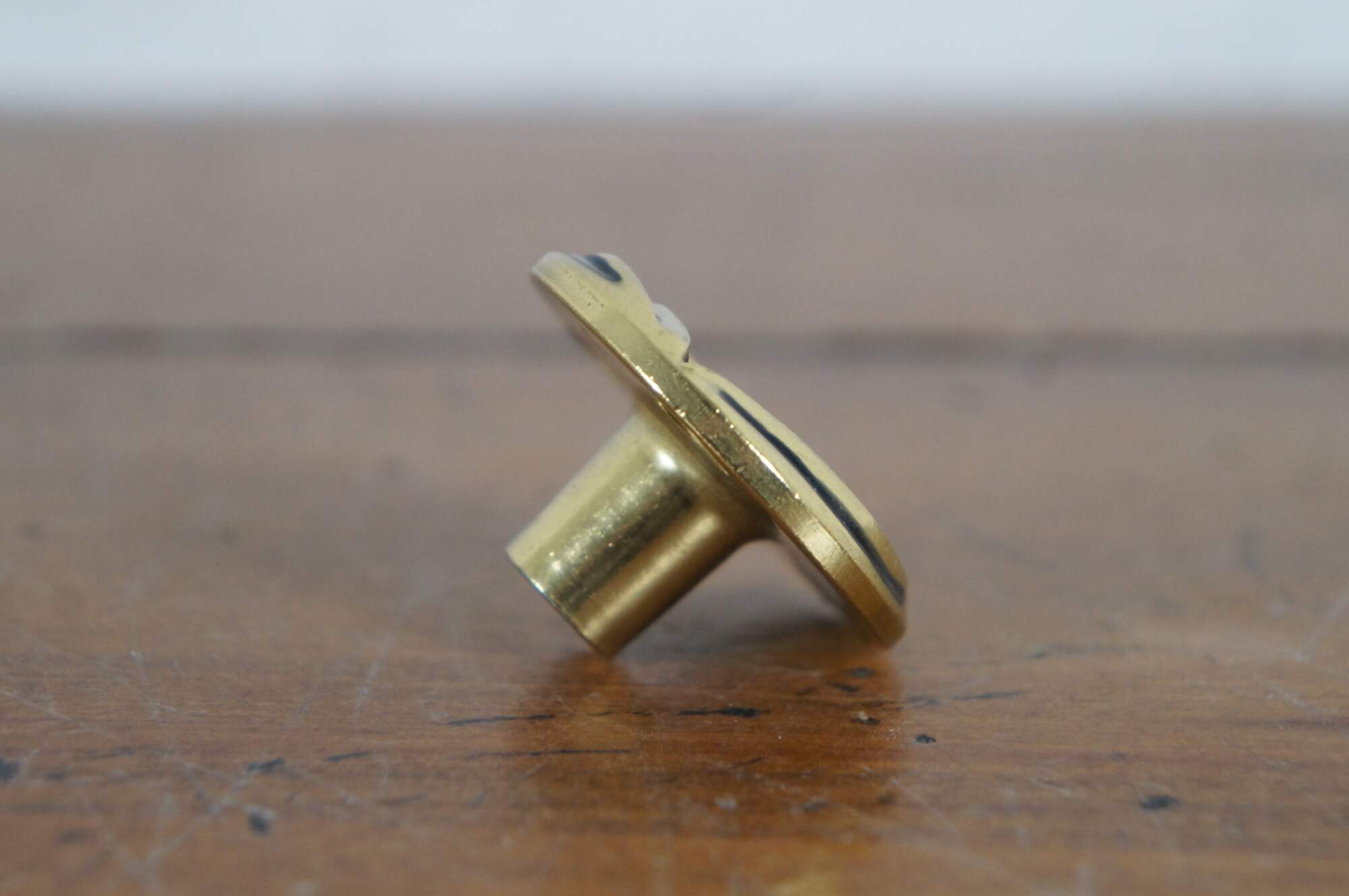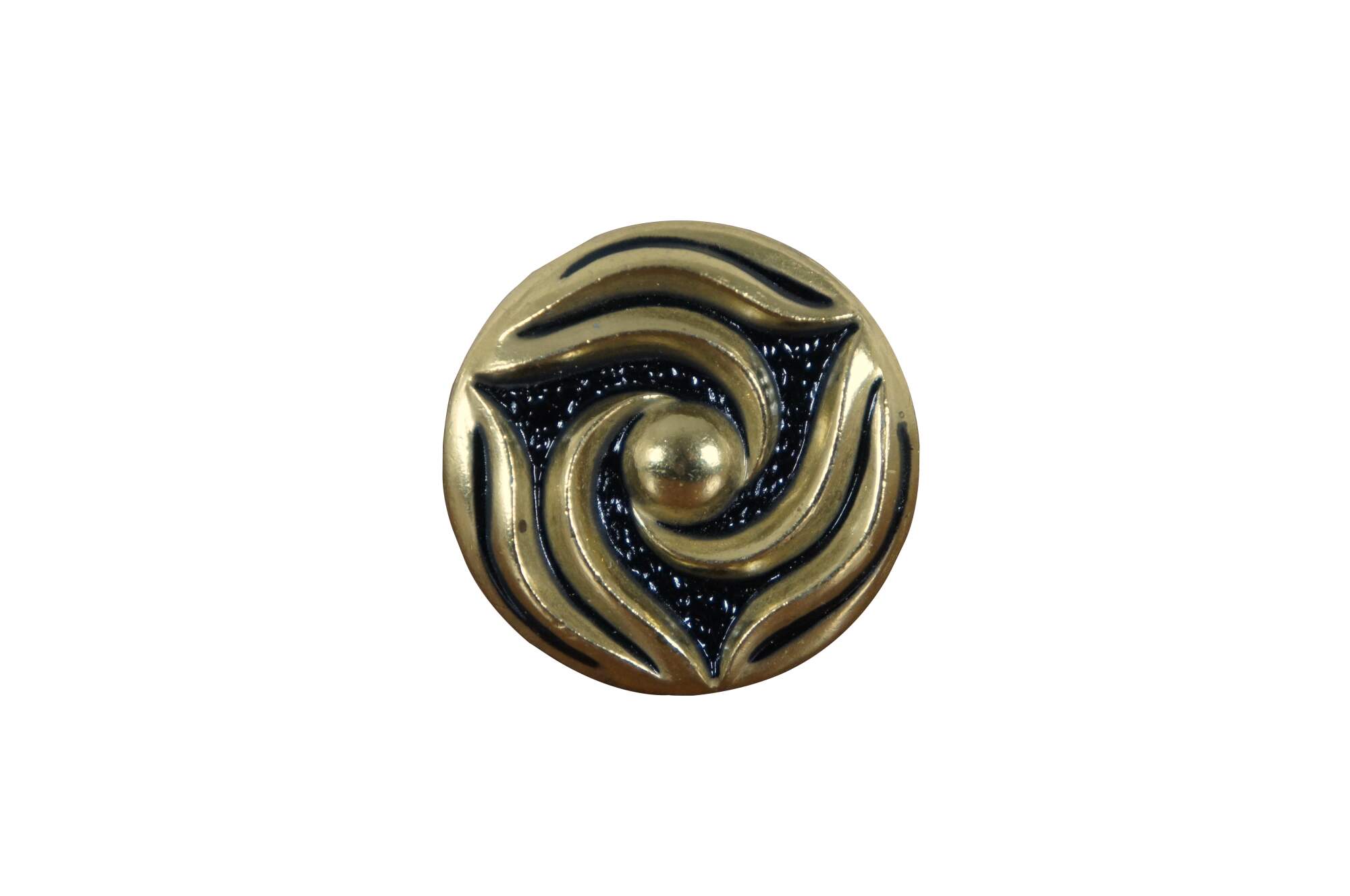 18 Available - Mid to late 20th century old-stock drawer / cabinet pulls. National Lock Company - Medalist knob. Antique brass finish. Mid century modern styling. Round / circular shape with abstract rose / swirl rosette design.