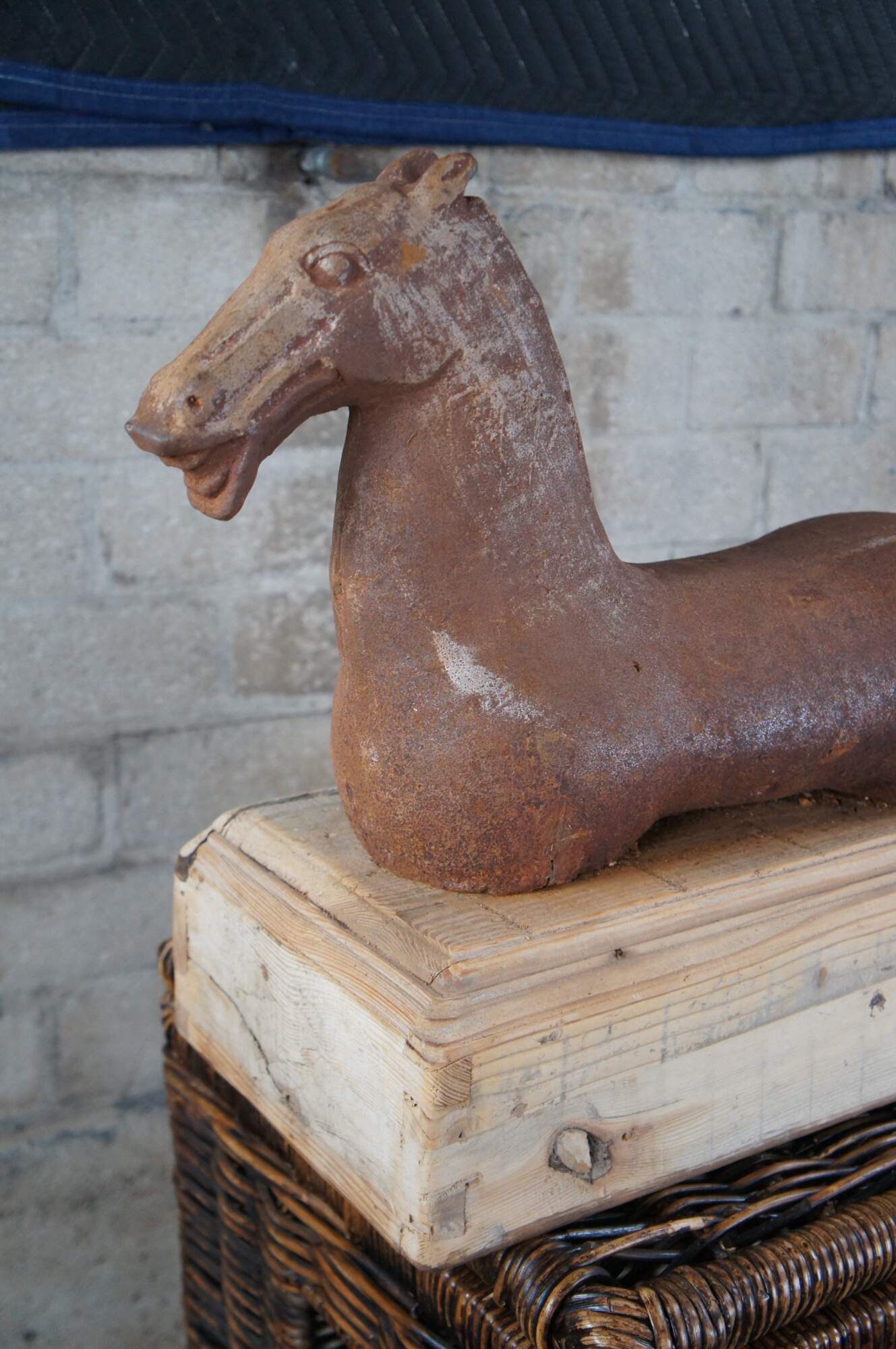 20th-century cast iron sculpture or hitching post of a Han (or Tang) Dynasty-style horse with muscular cheeks, open mouth, and no legs. Mounted on a hollow, dovetailed, unfinished wood base.