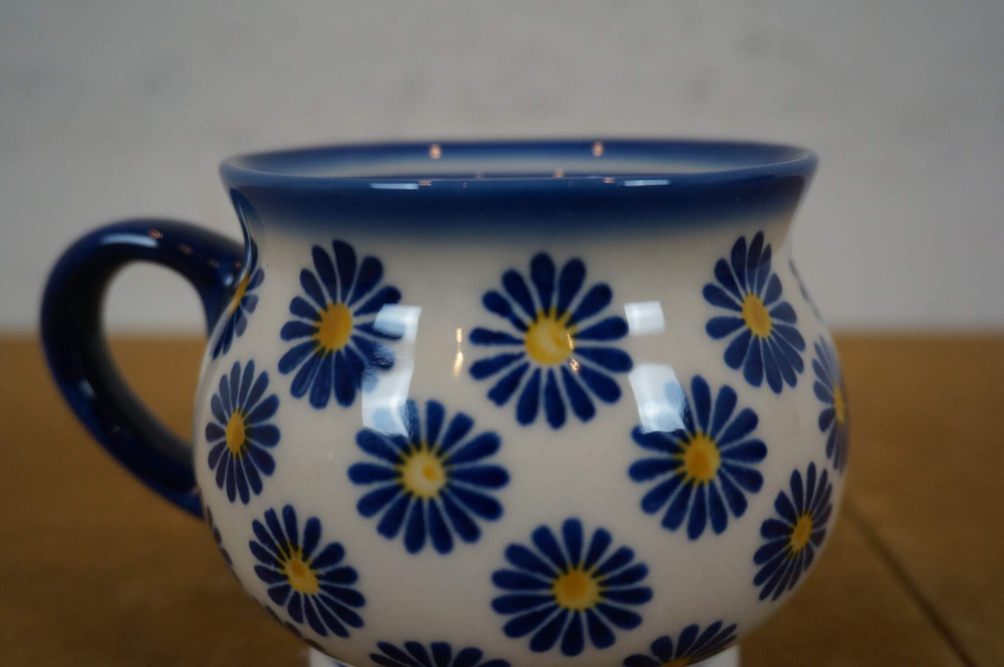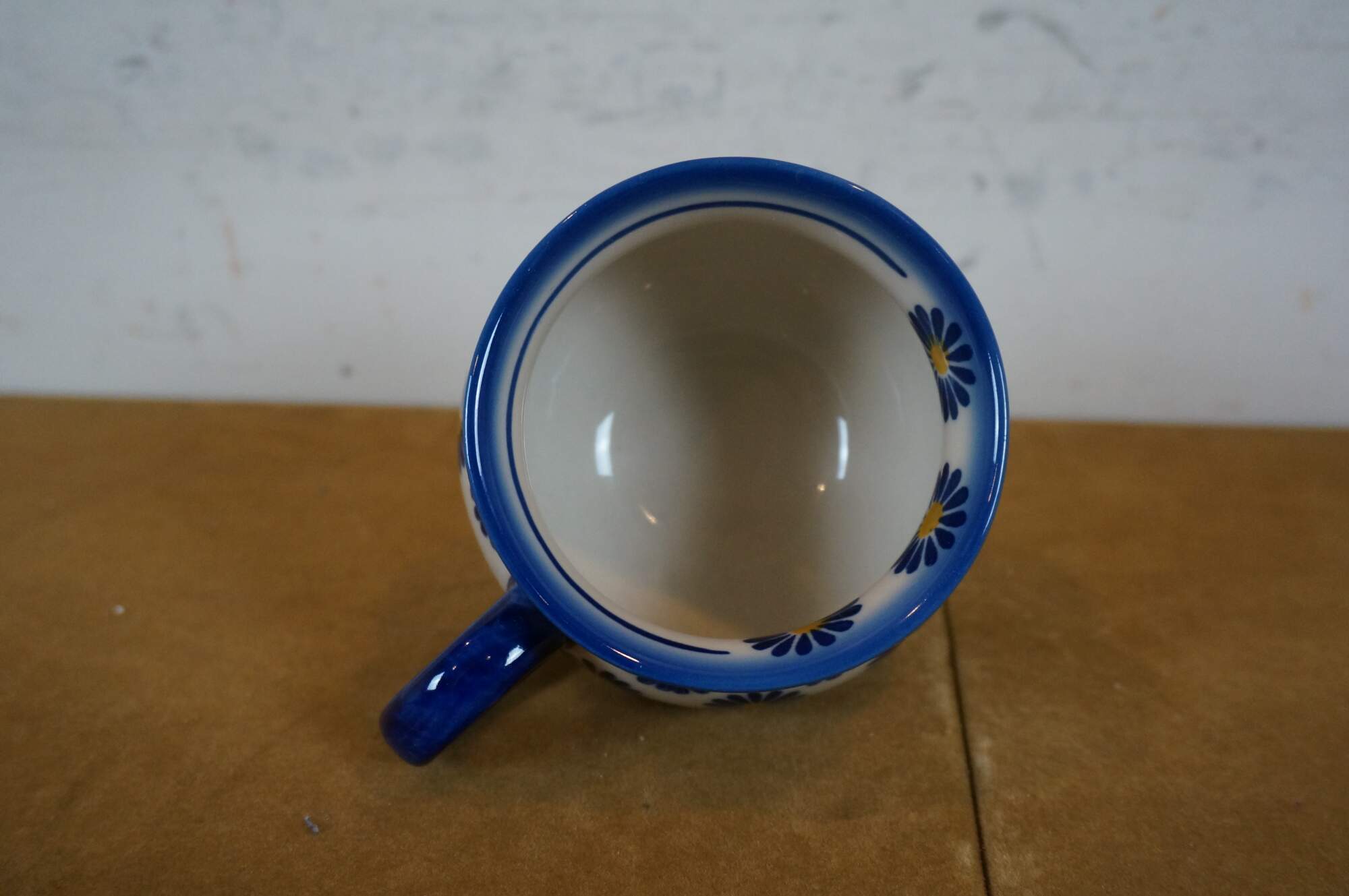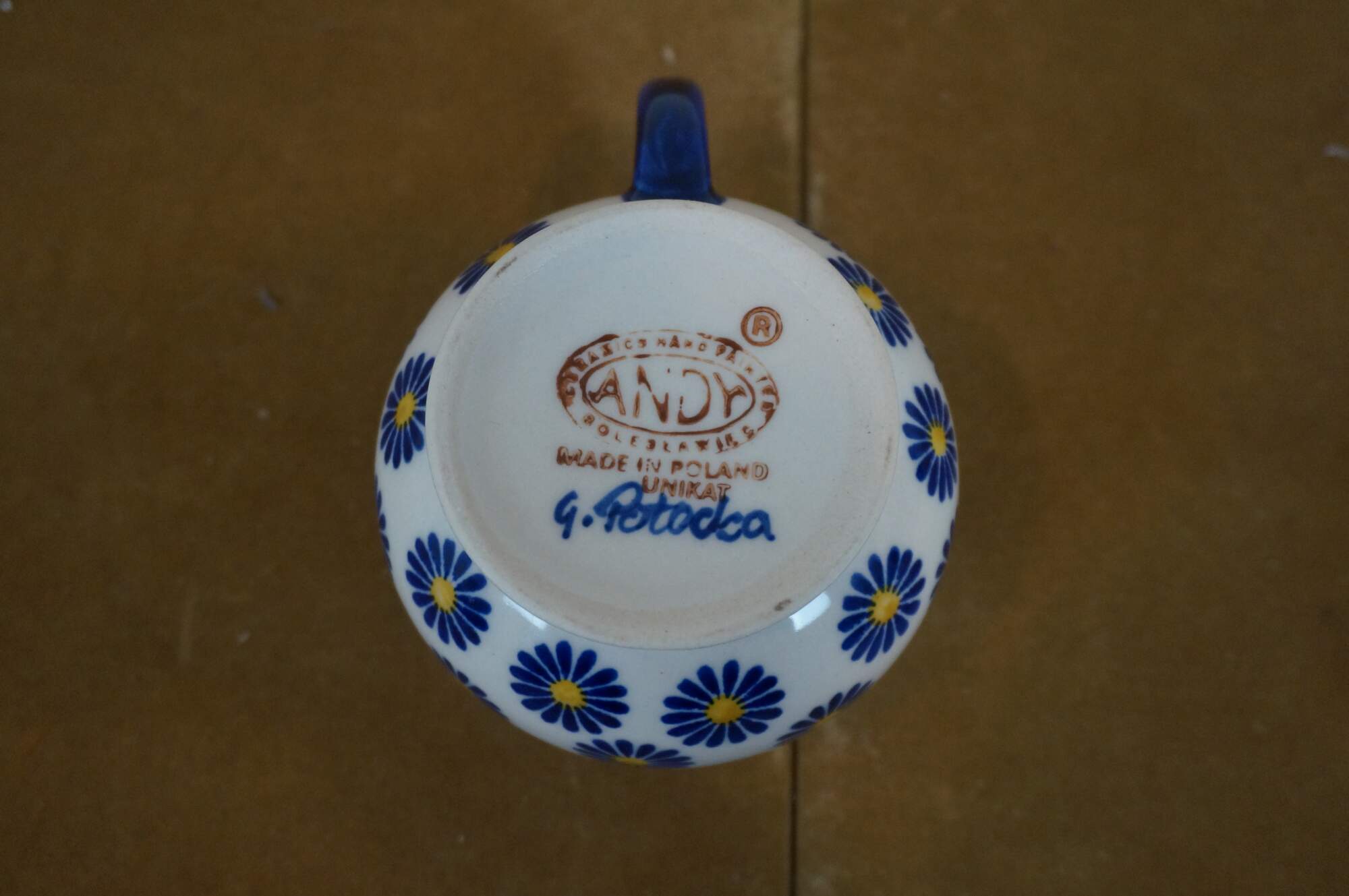Vintage Andy Polish / Poland / Boleslawiec tea or coffee mug / cup featuring a blue daisy pattern Signed on base Patacka. Made in Poland, Unikat.