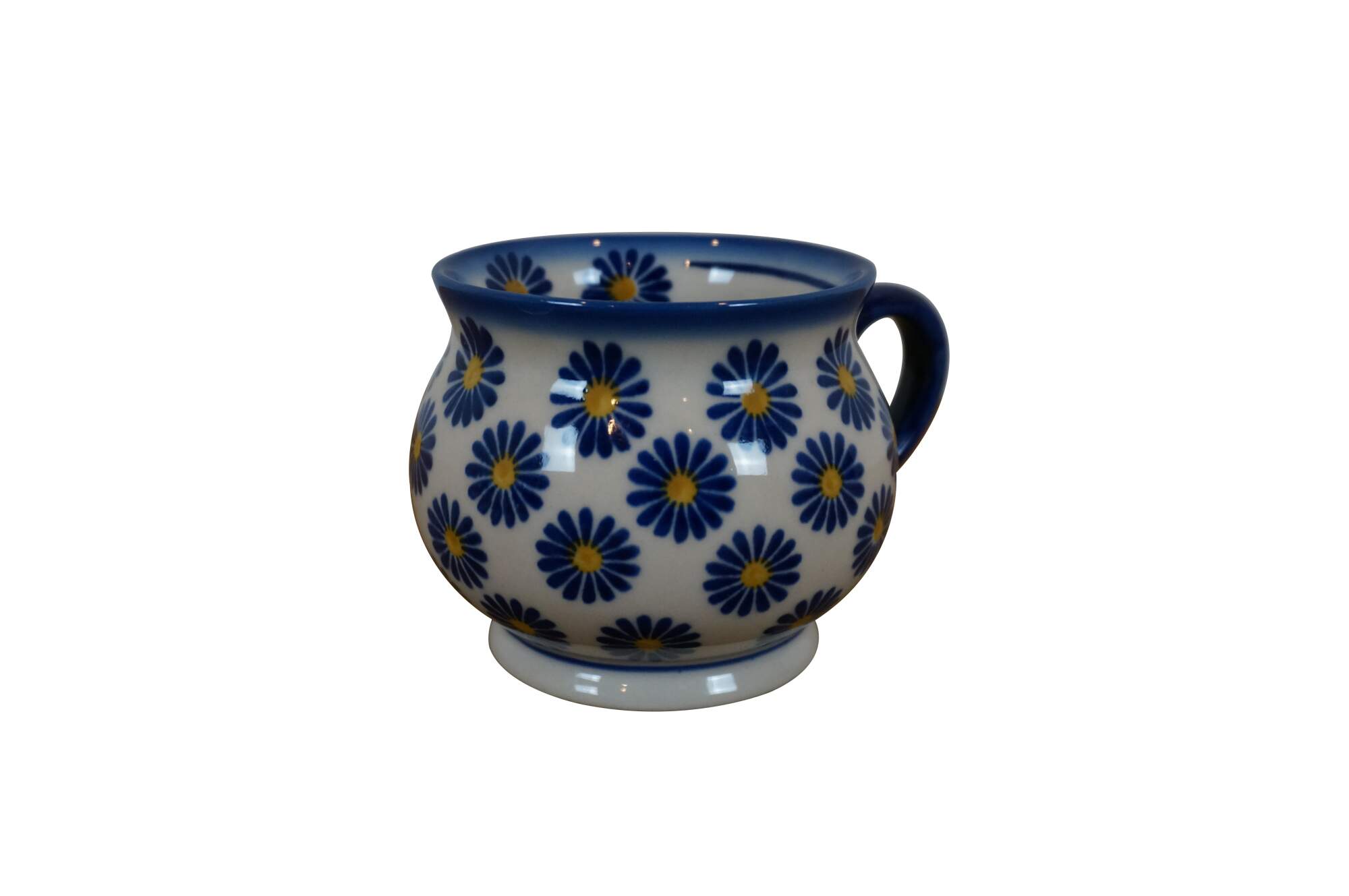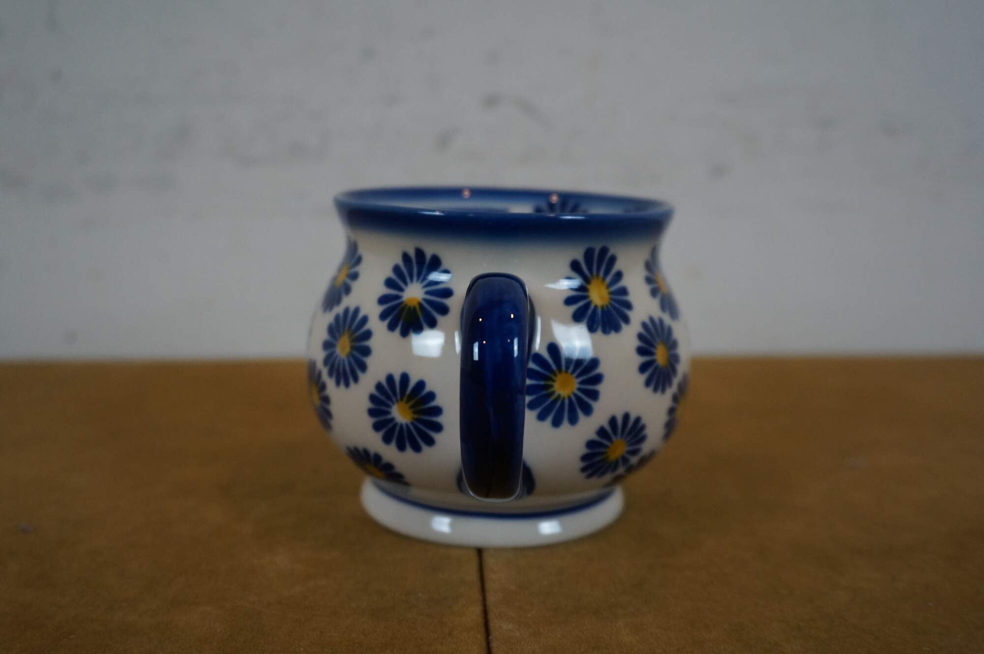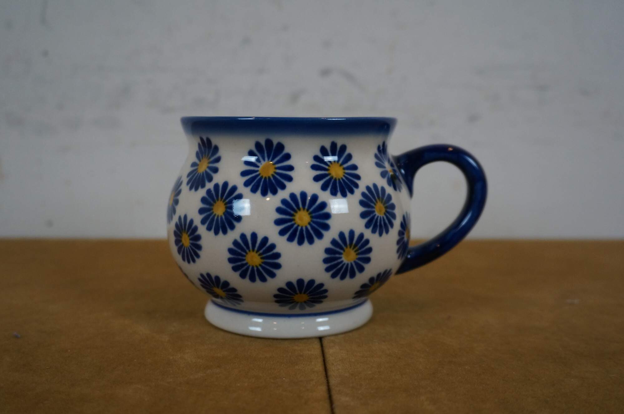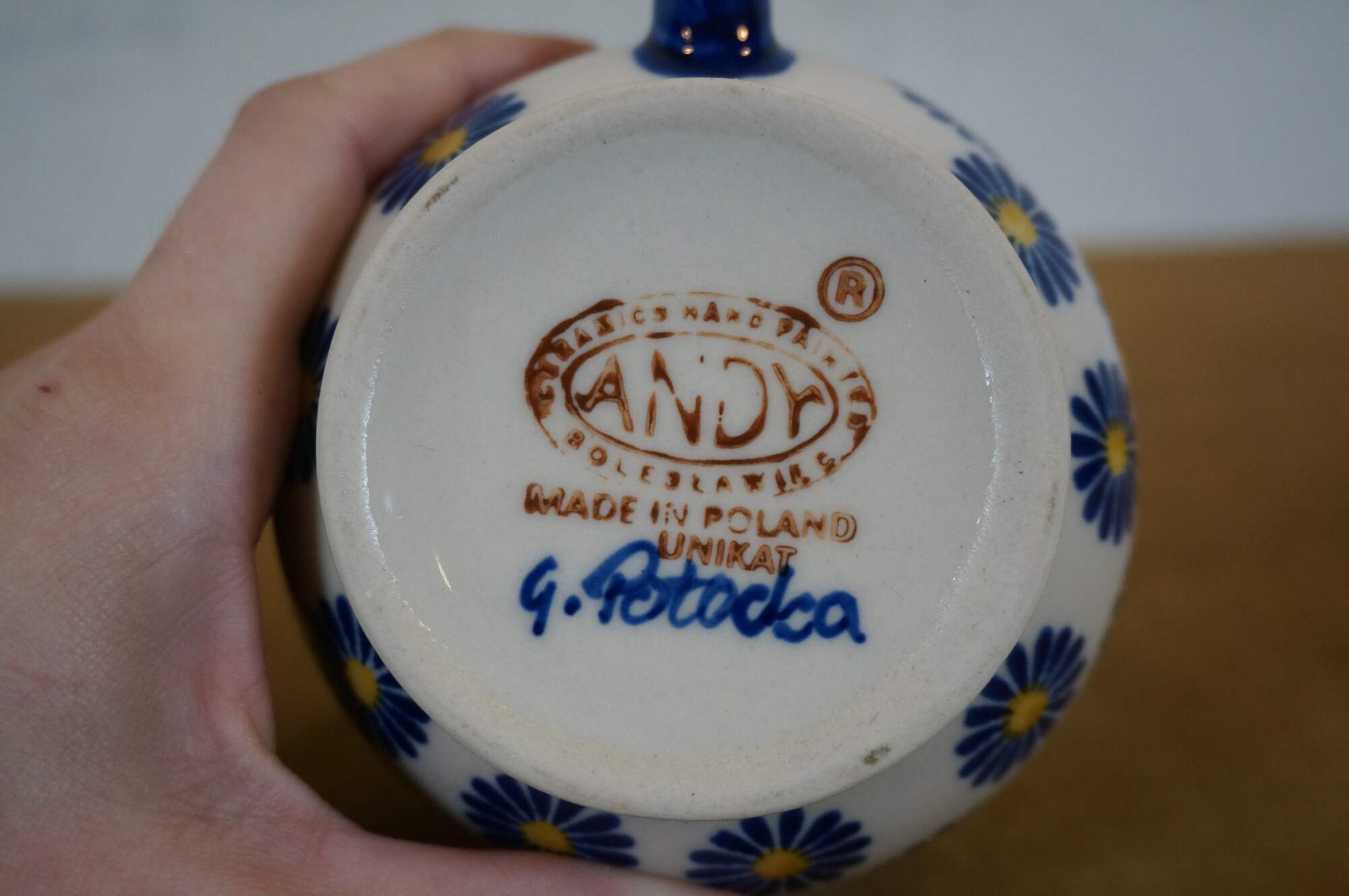 Vintage Andy Polish / Poland / Boleslawiec tea or coffee mug / cup featuring a blue daisy pattern Signed on base Patacka. Made in Poland, Unikat.