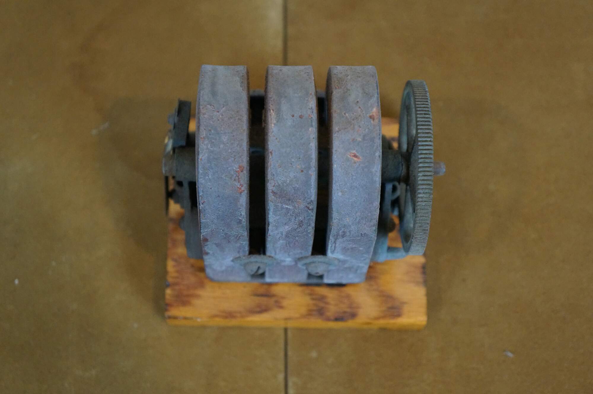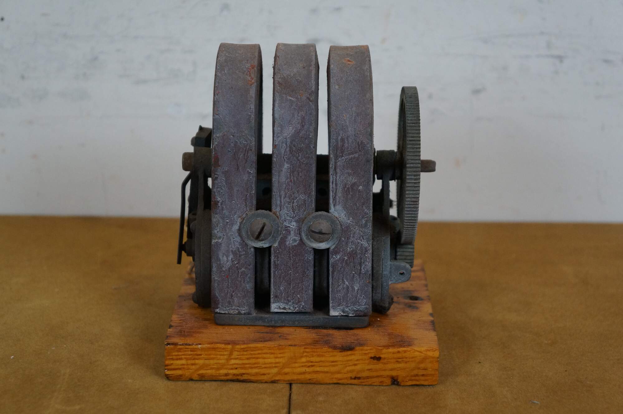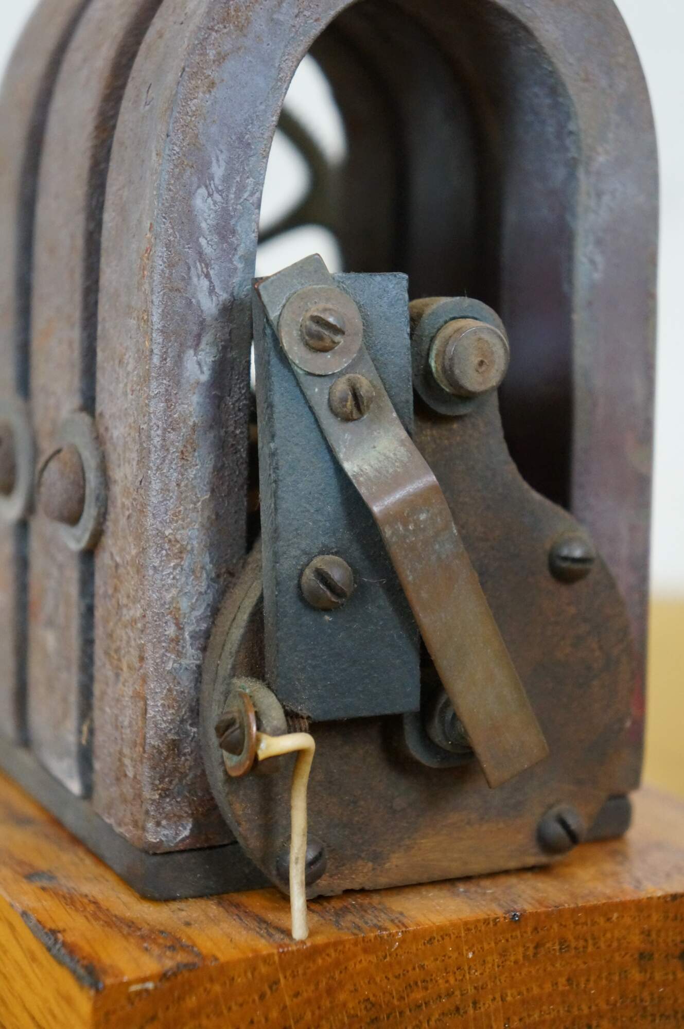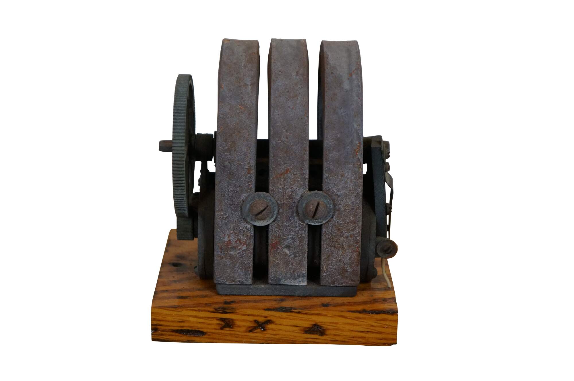 Early 20th century three-bar electric hand-cranked telephone magneto generator. Mounted on a wooden base for display.