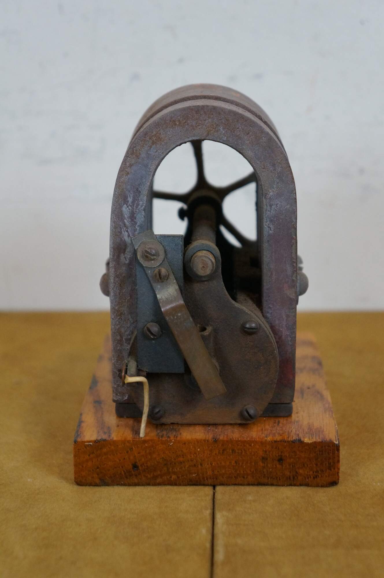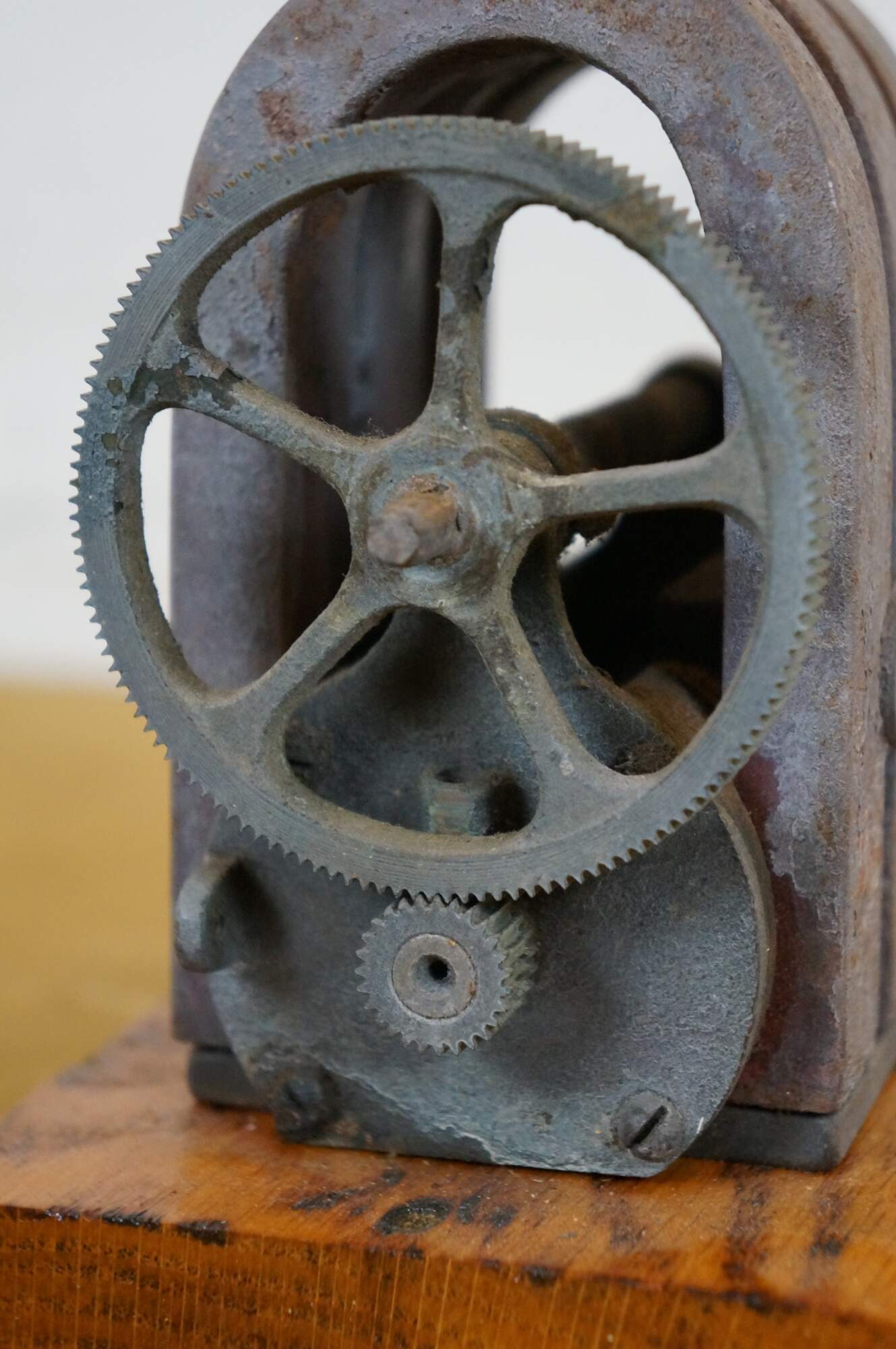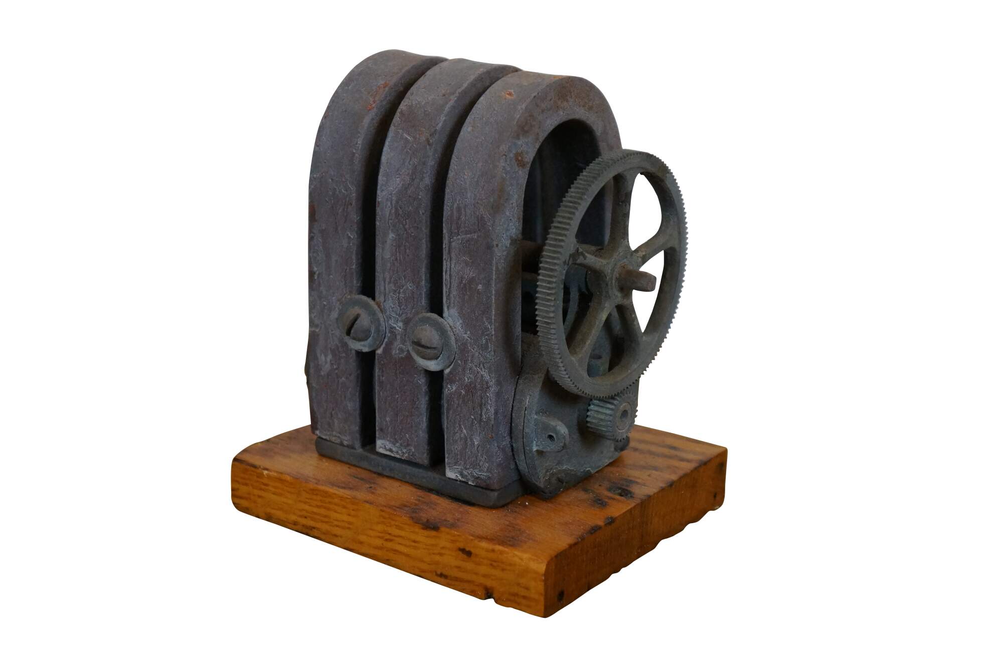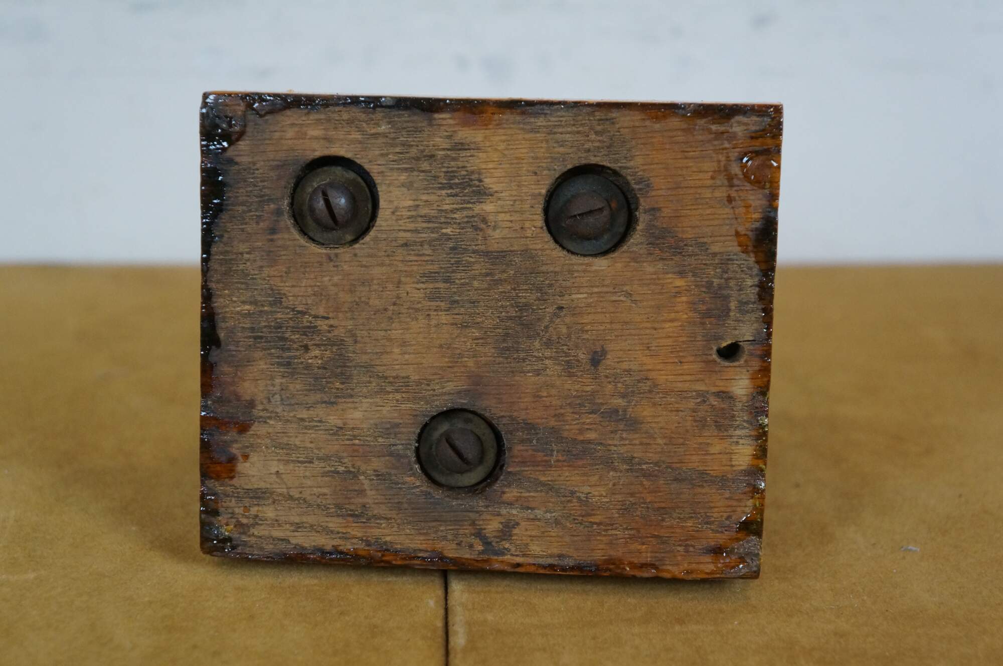 Early 20th century three-bar electric hand-cranked telephone magneto generator. Mounted on a wooden base for display.