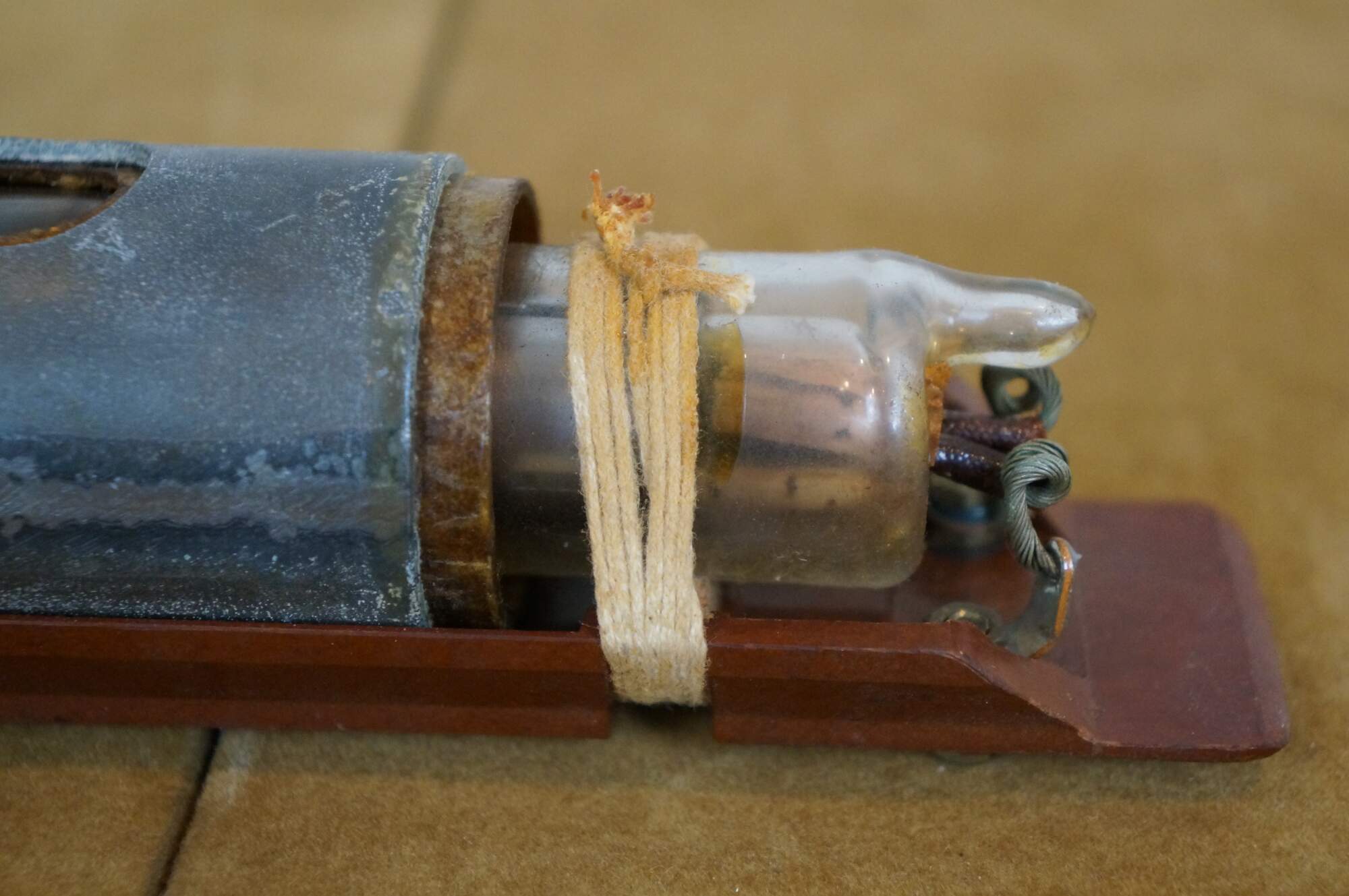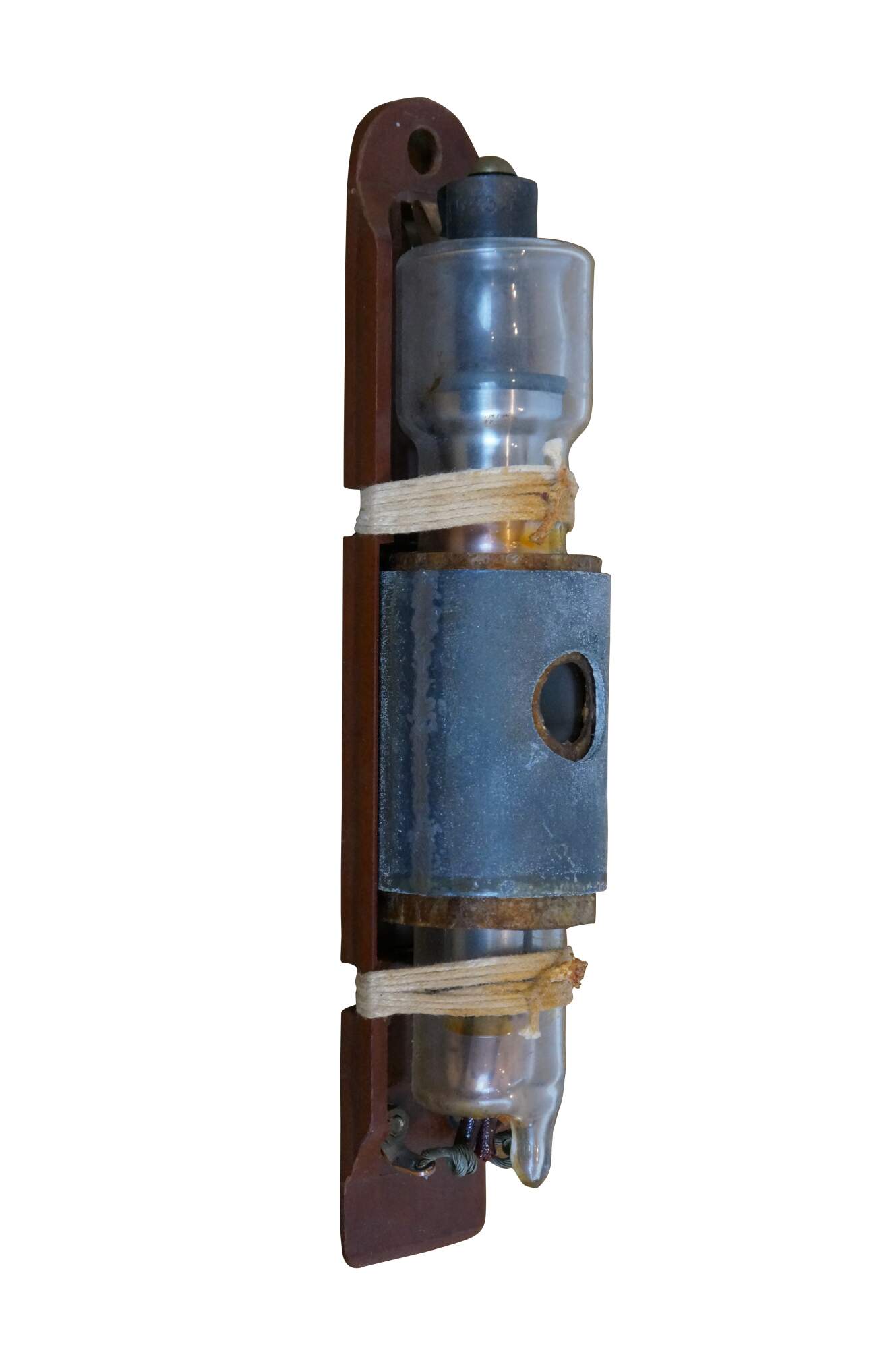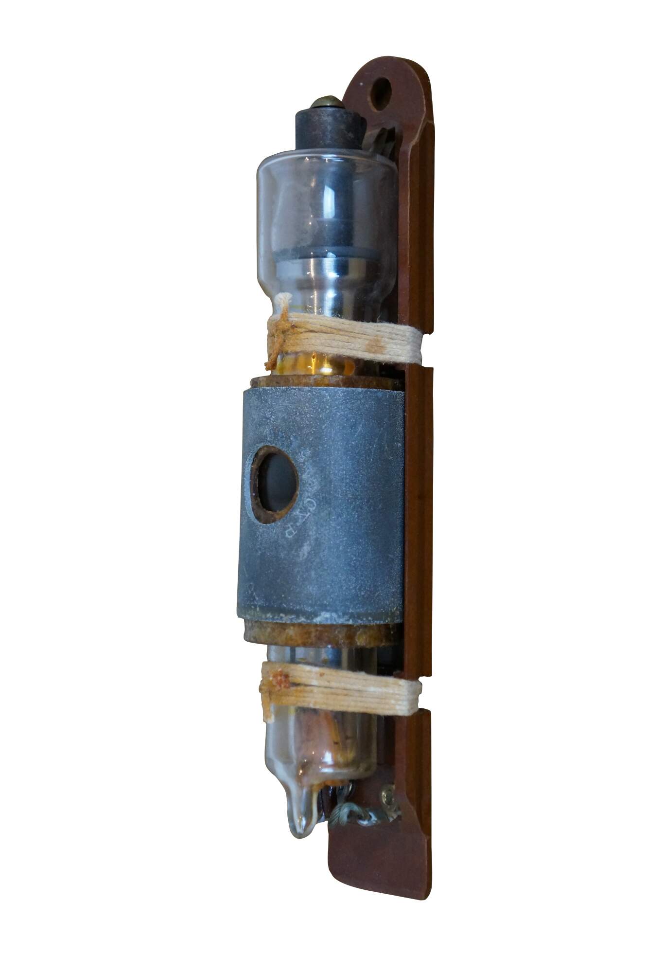 Vintage 20th century glass tube vacuum relay, lashed with cord to a wall hanging wooden base. Marked CYP 115199.