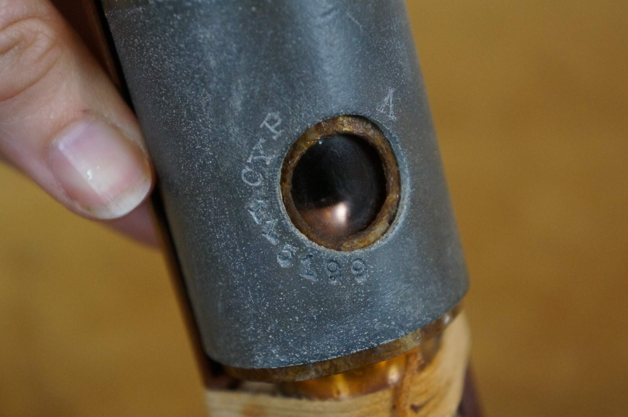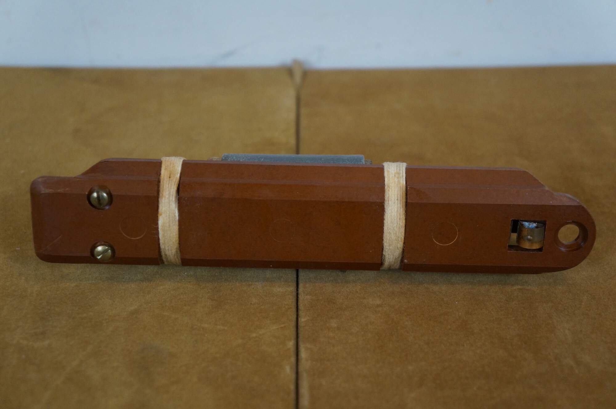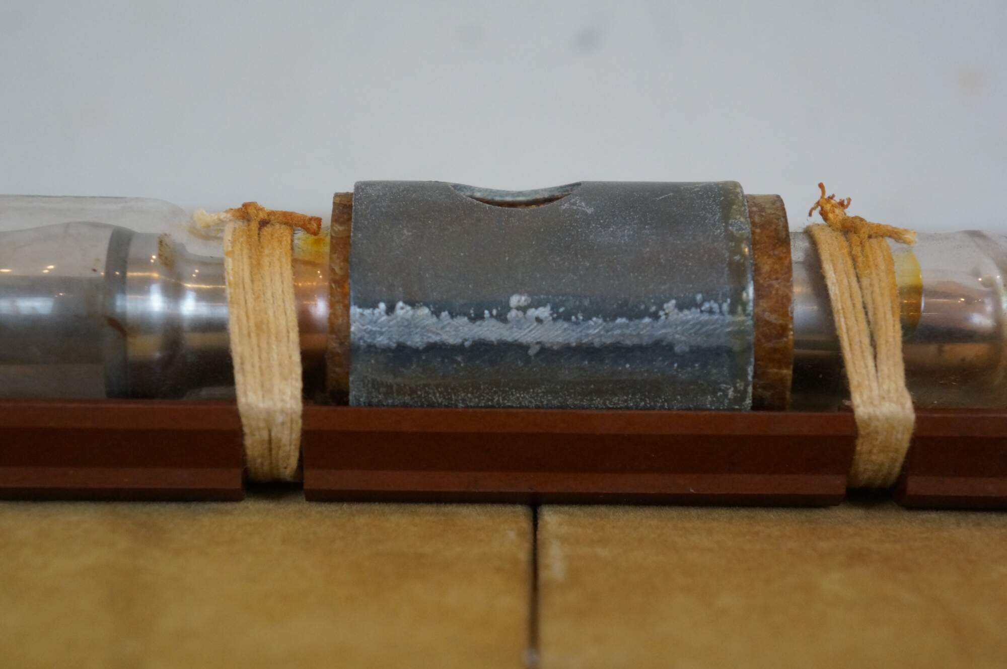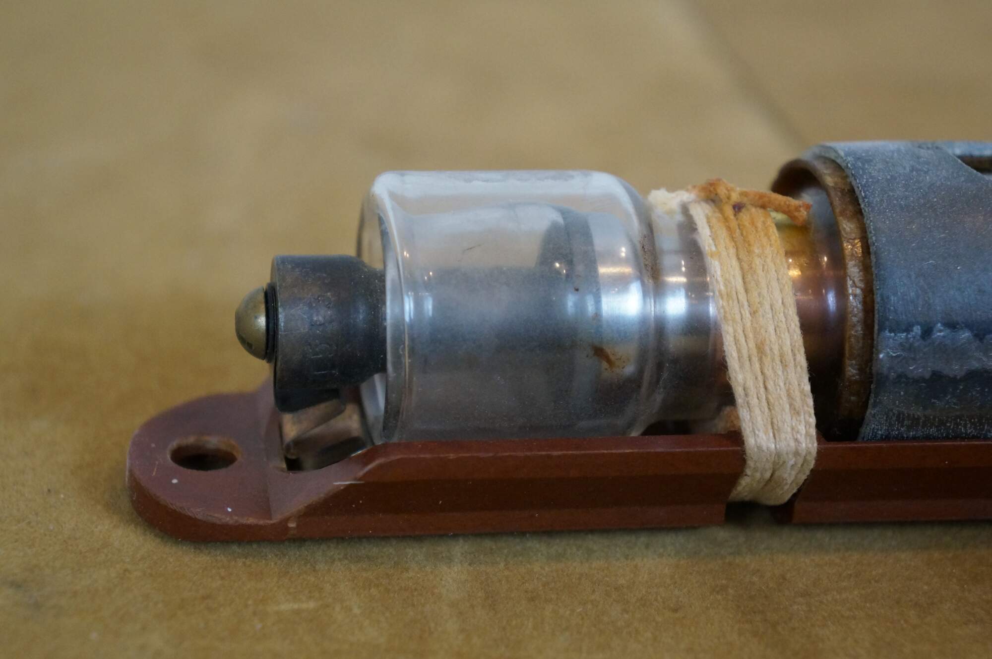 Vintage 20th century glass tube vacuum relay, lashed with cord to a wall hanging wooden base. Marked CYP 115199.