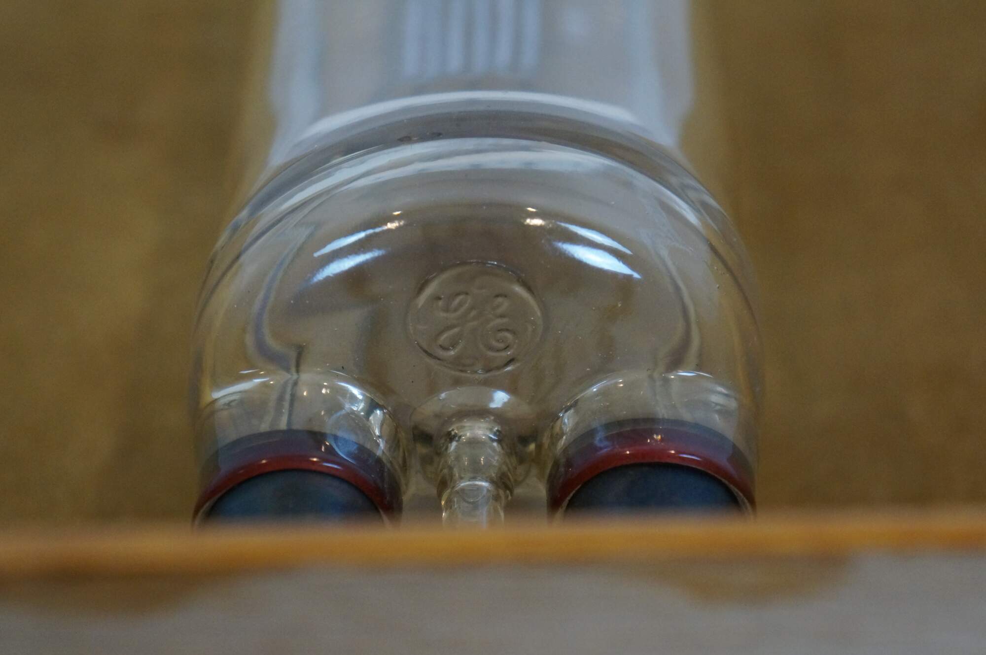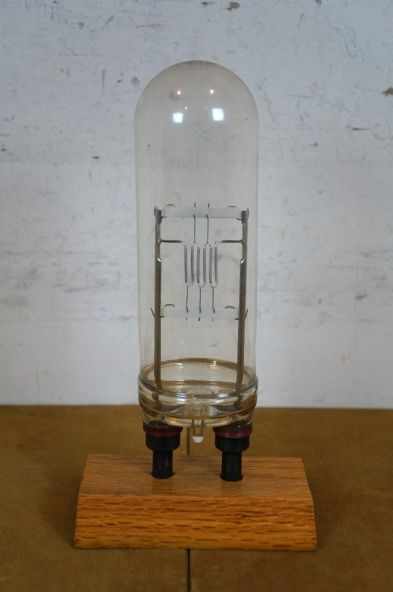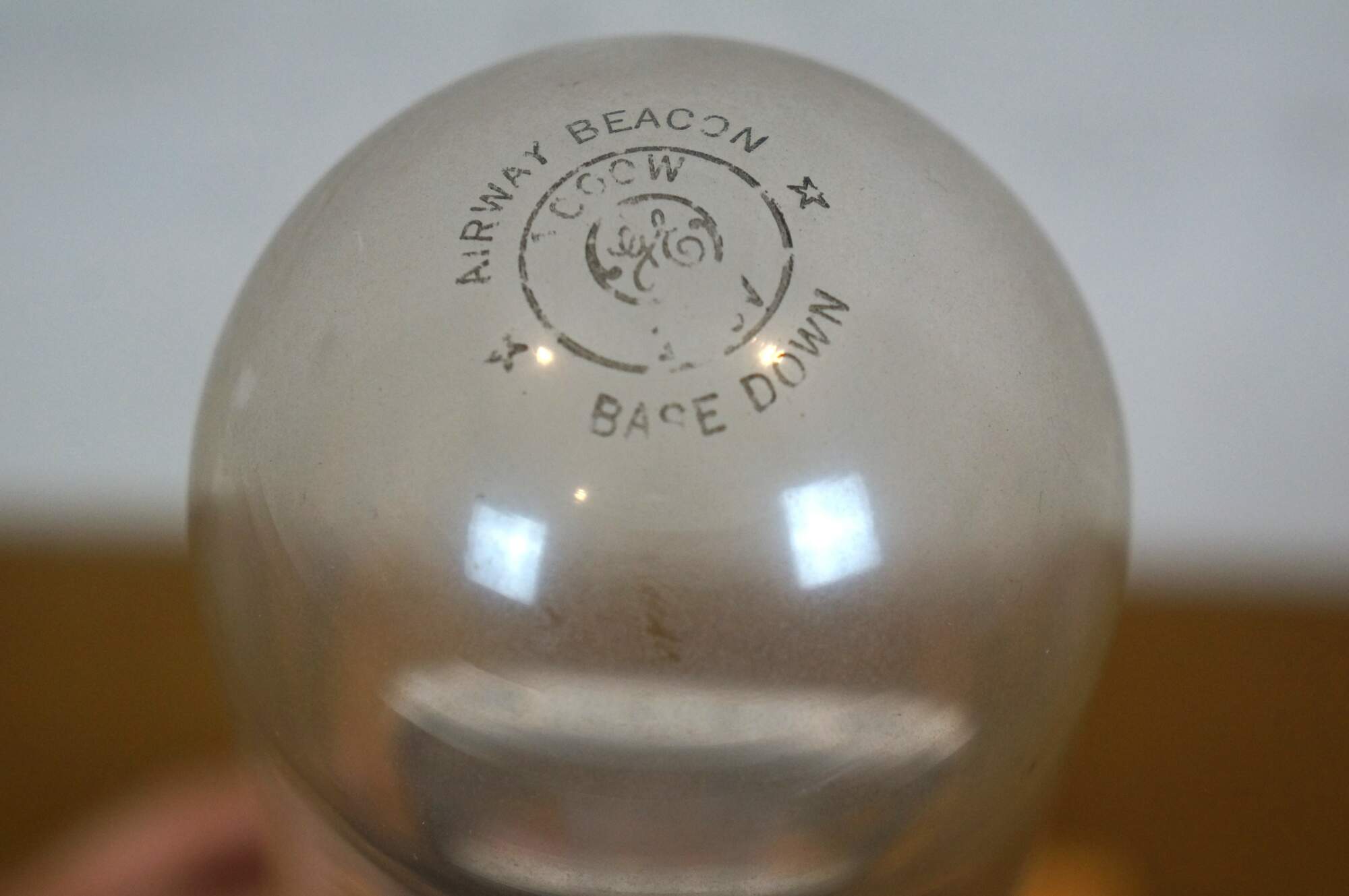 Vintage General Electric Mazda 100 watt Airway Beacon light bulb, mounted for display on a wooden base.