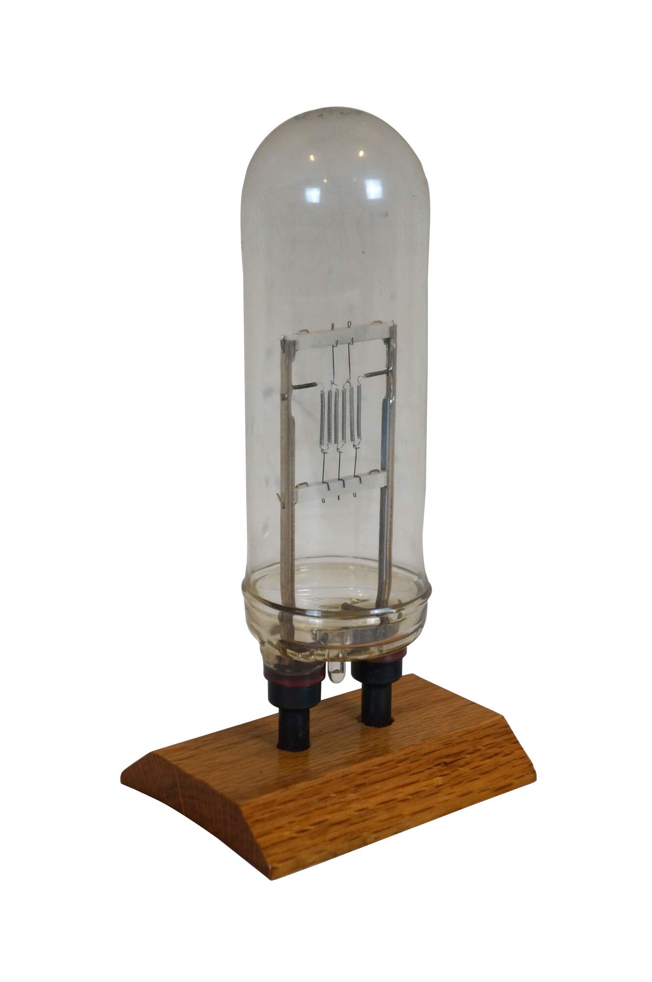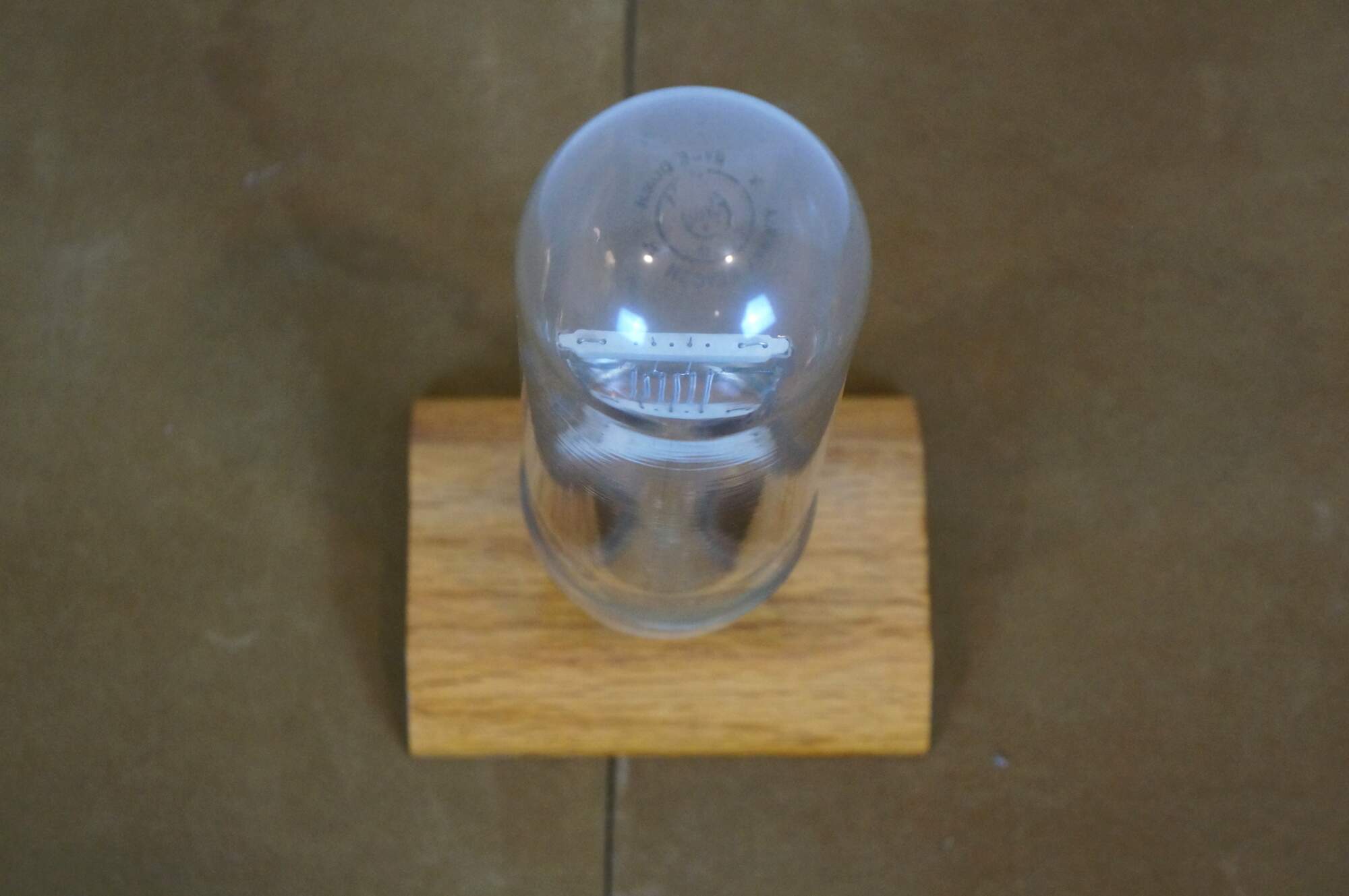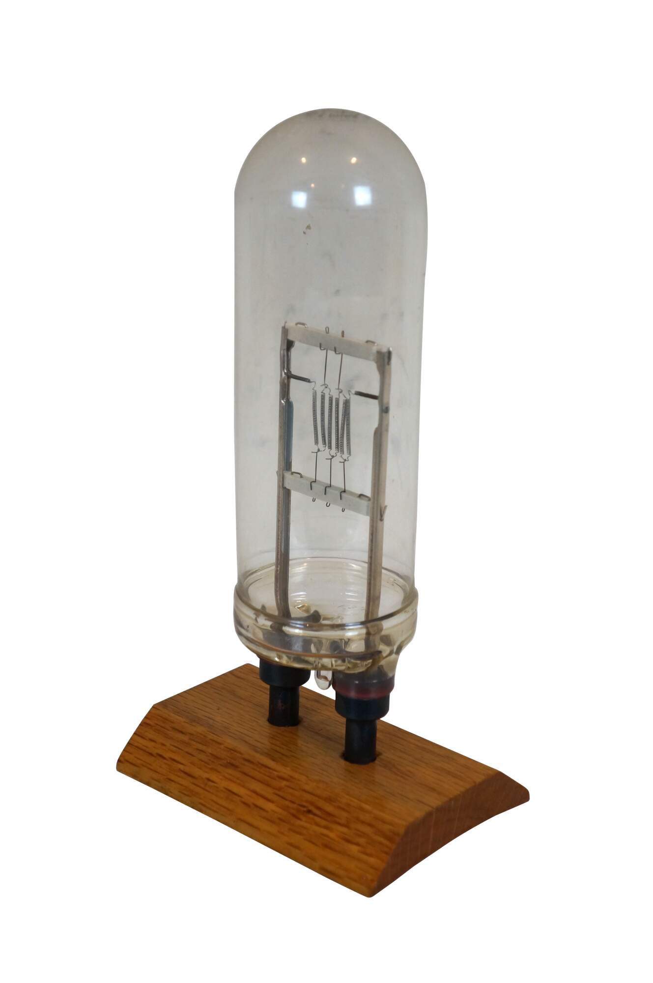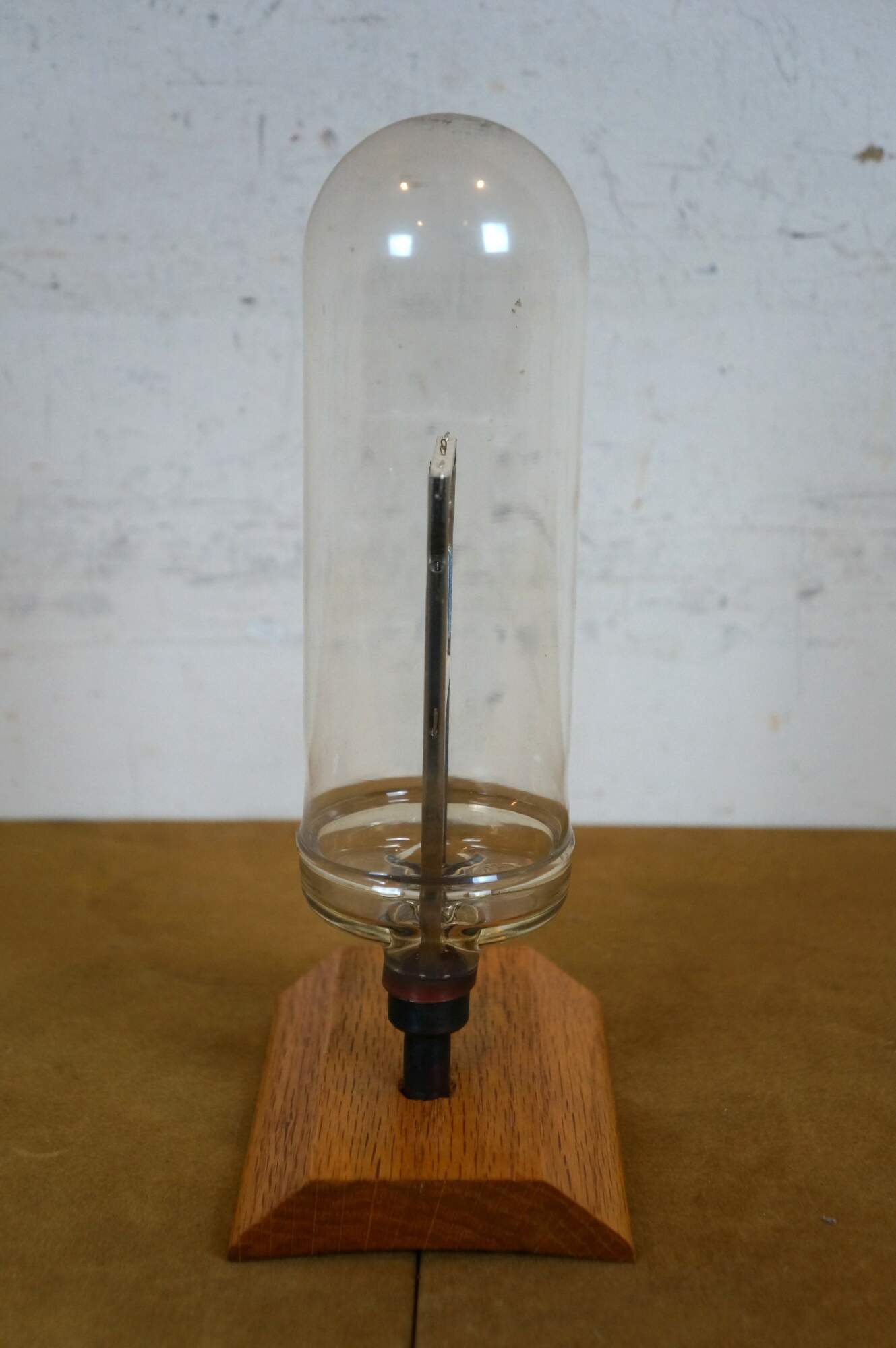 Vintage General Electric Mazda 100 watt Airway Beacon light bulb, mounted for display on a wooden base.