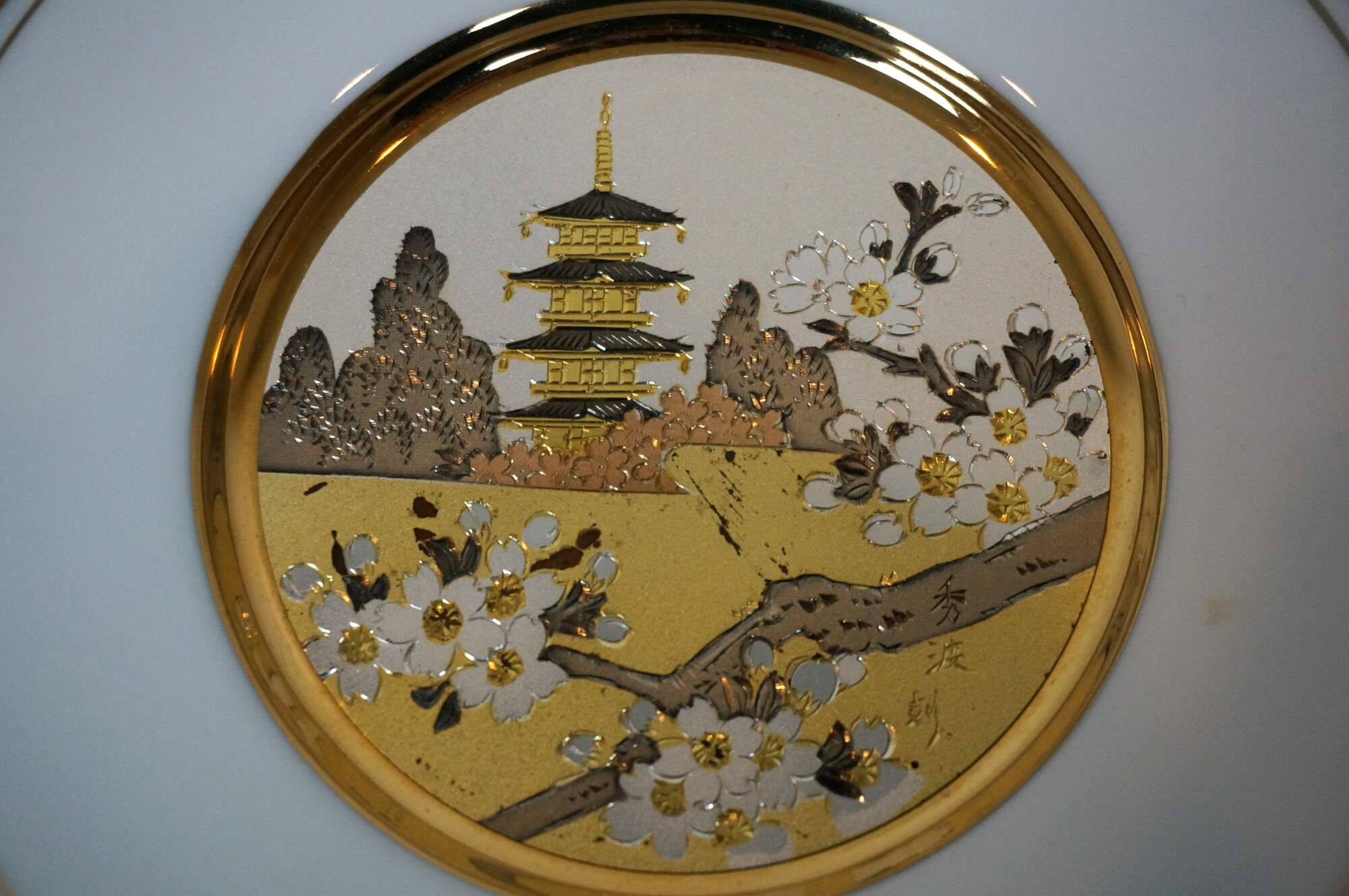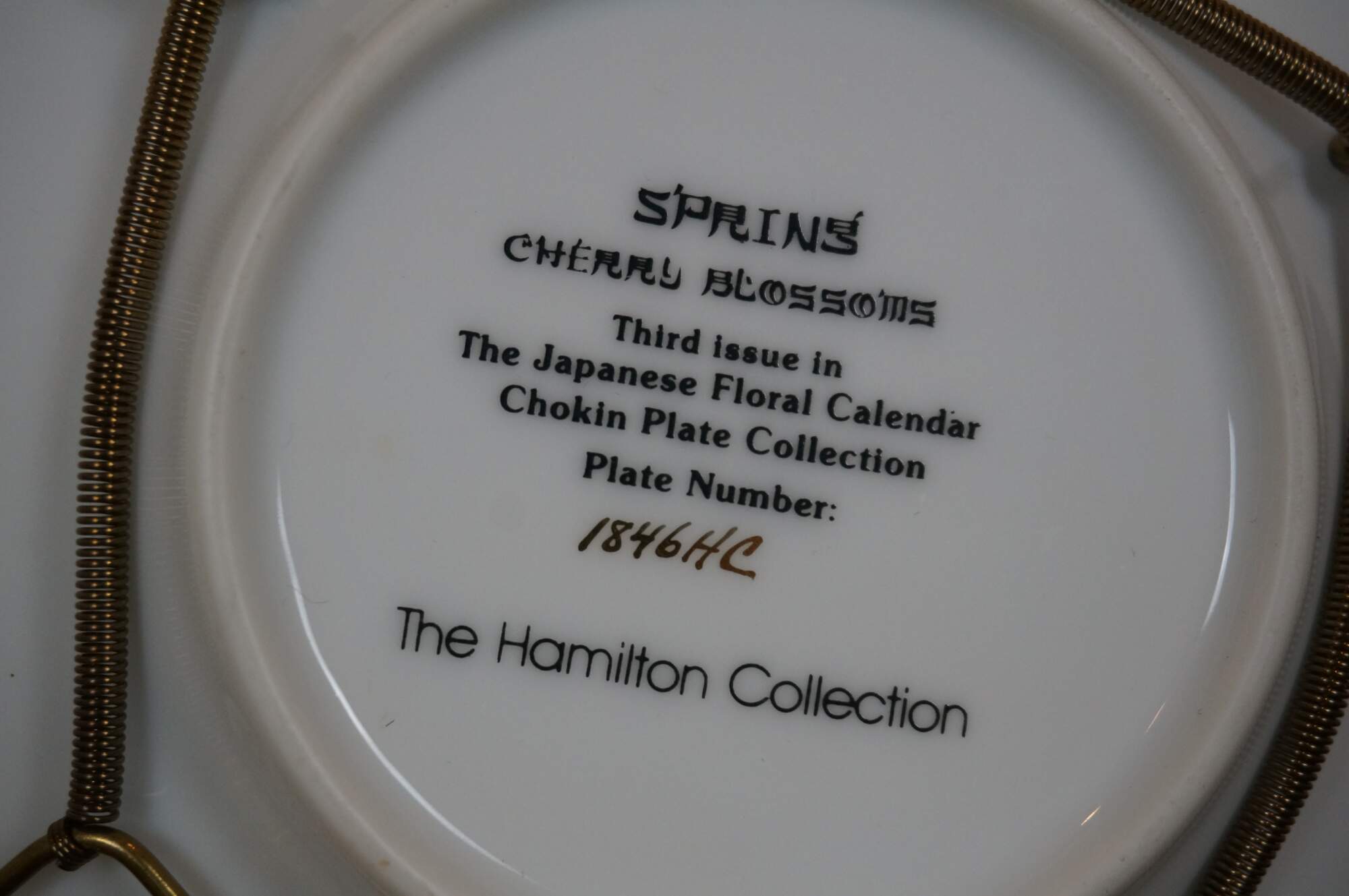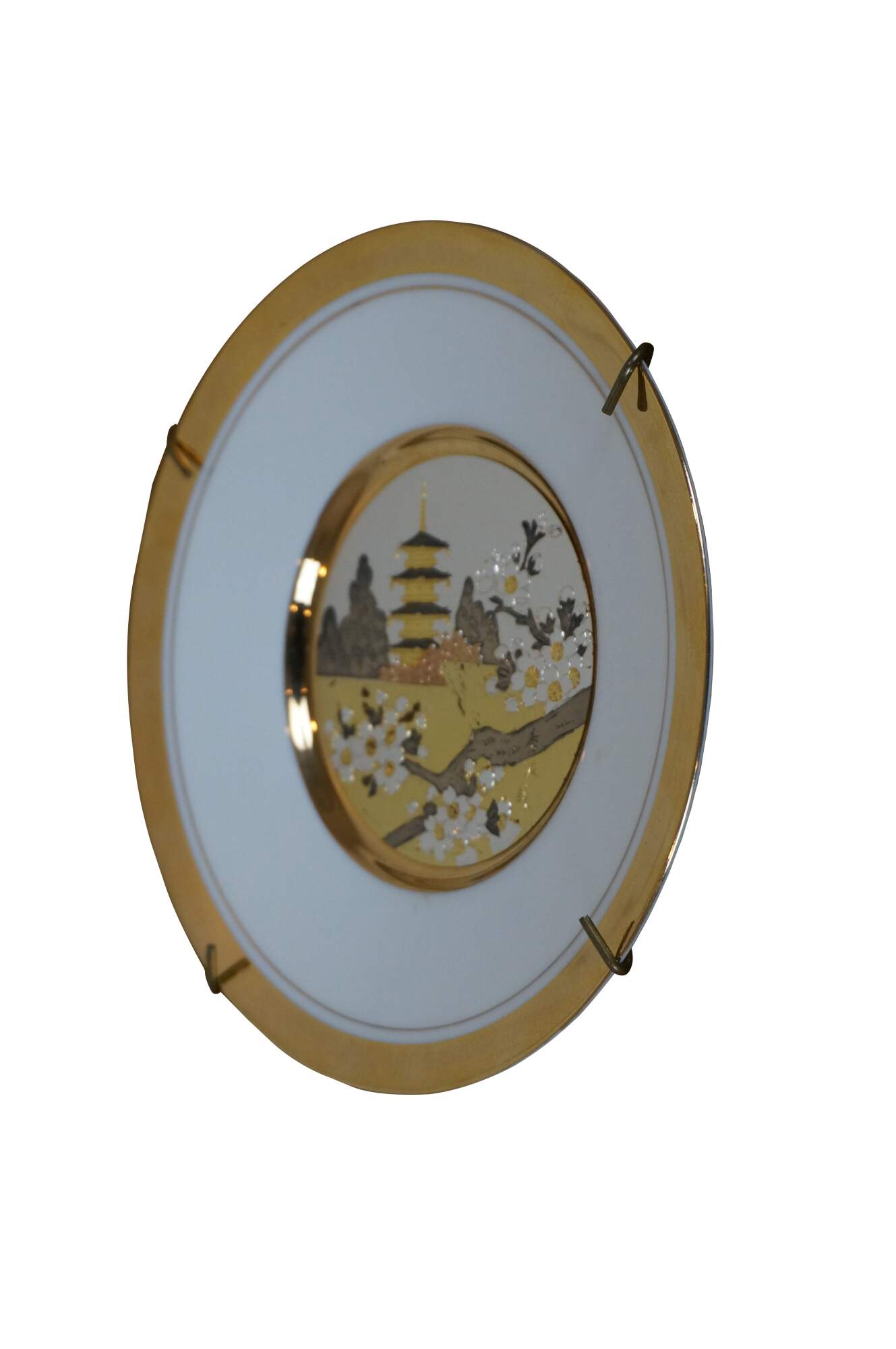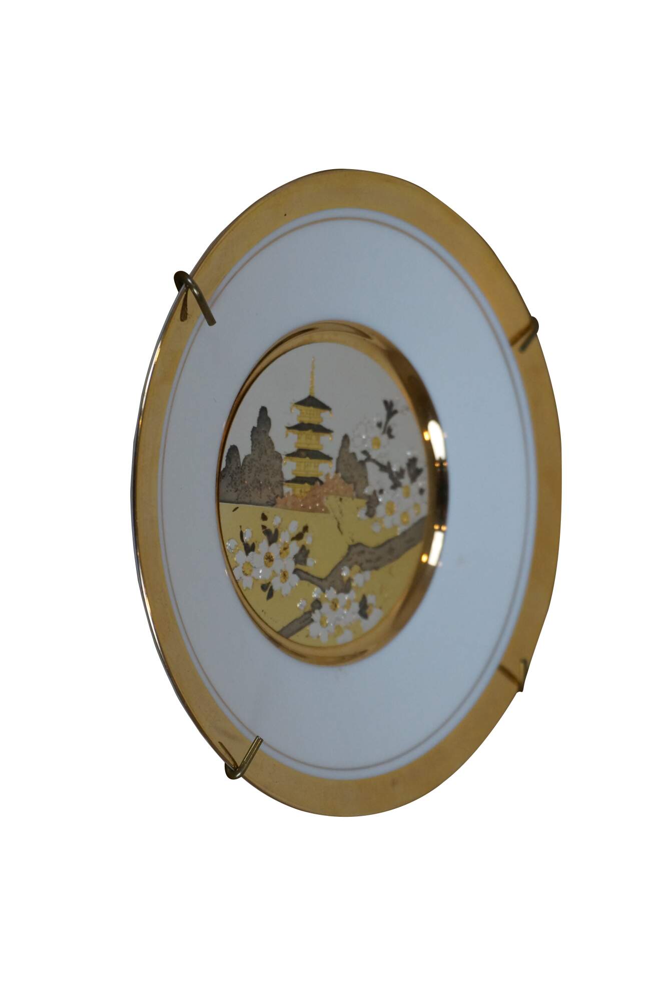 Vintage 20th century Hamilton Collection Spring Cherry Blossoms collector's plate. White porcelain with 24kt gold edge and decoration depicting a Japanese landscape of pgoda surrounded by hills, with a branch of a cherry tree in the foreground. Third Issue in The Japanese Floral Calendar - Chokin Plate Collection - Plate Number: 1846HC. Includes wall hanger.