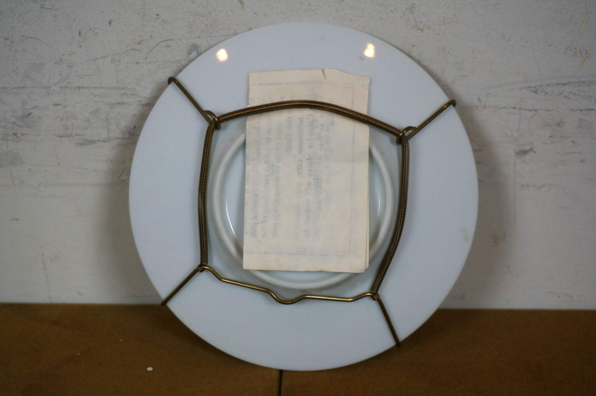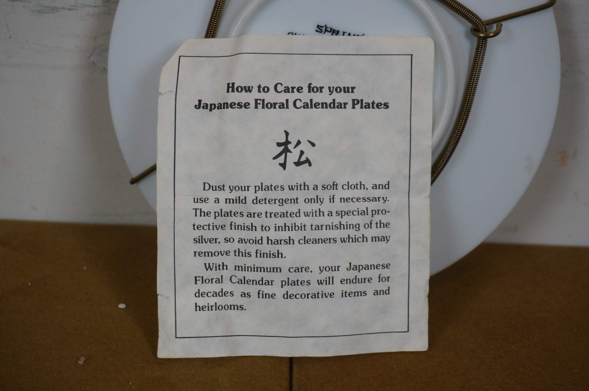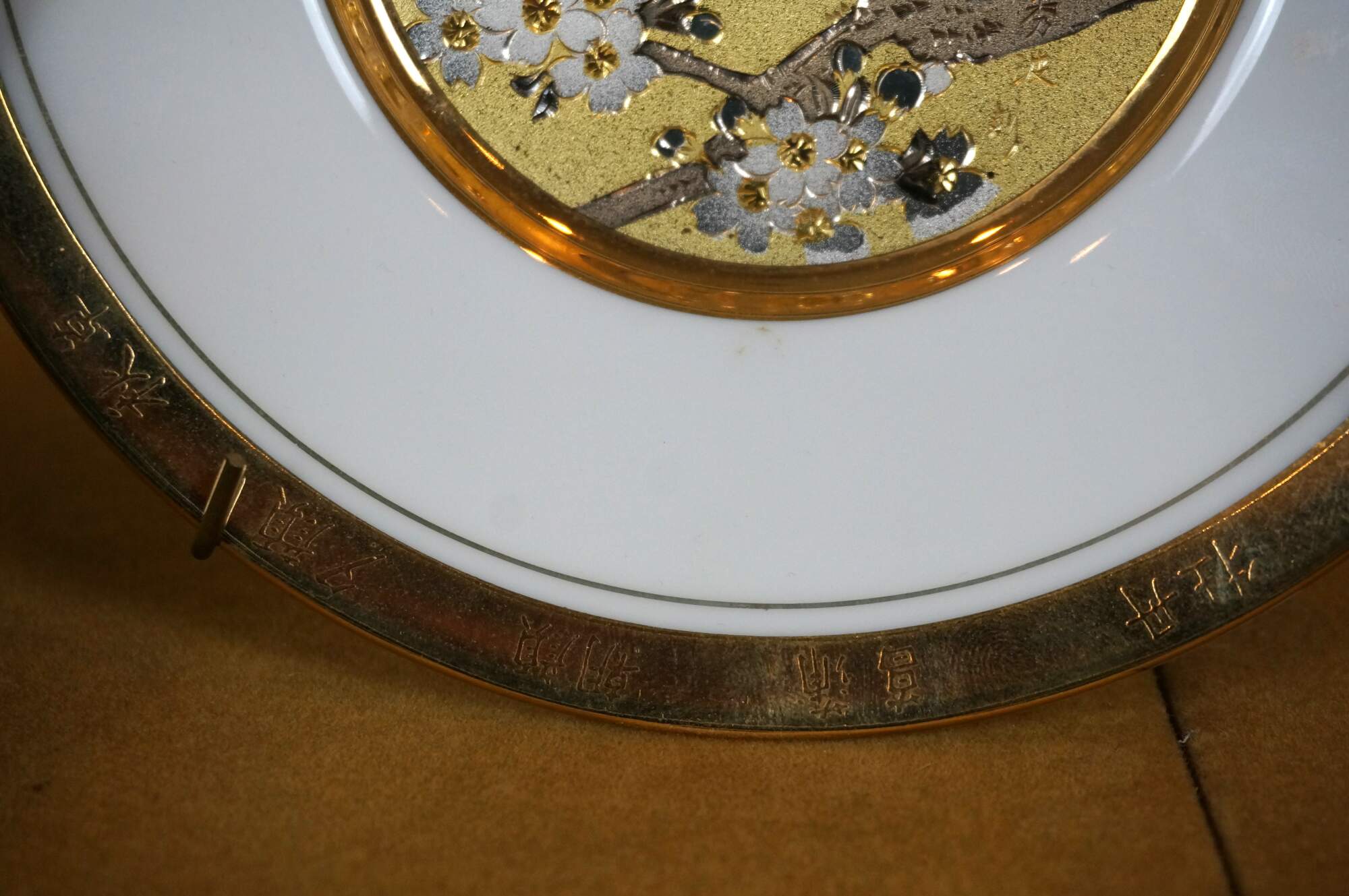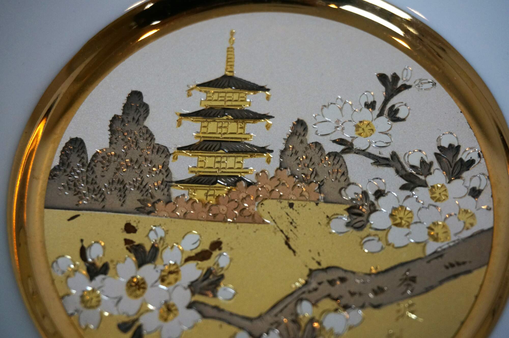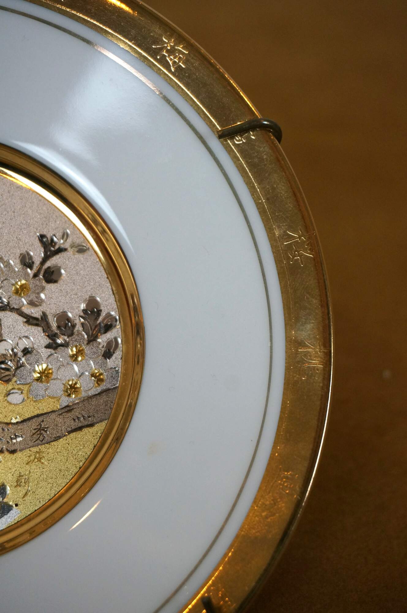 Vintage 20th century Hamilton Collection Spring Cherry Blossoms collector's plate. White porcelain with 24kt gold edge and decoration depicting a Japanese landscape of pgoda surrounded by hills, with a branch of a cherry tree in the foreground. Third Issue in The Japanese Floral Calendar - Chokin Plate Collection - Plate Number: 1846HC. Includes wall hanger.