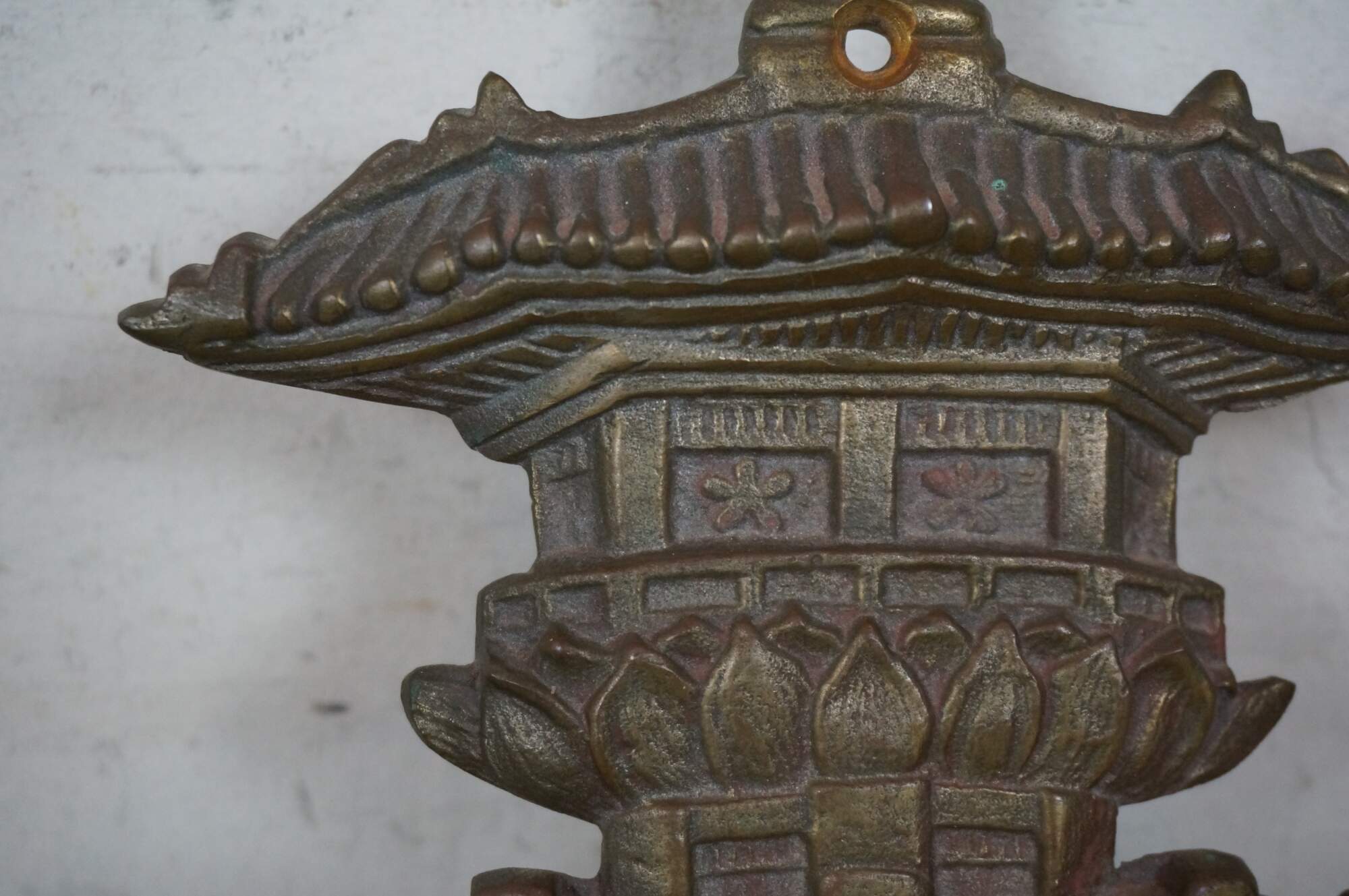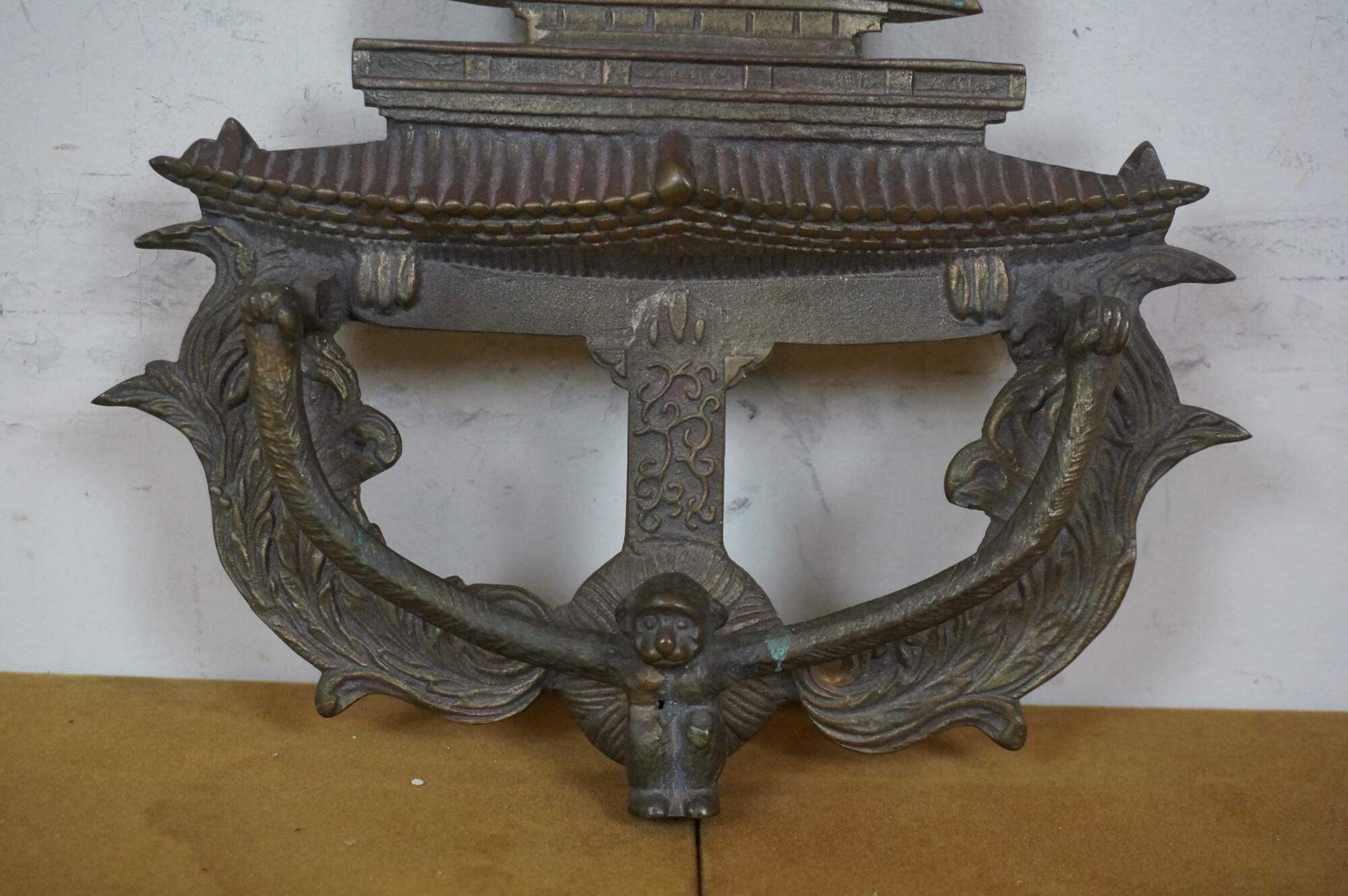 Circa mid 20th century large brass door knocker in the shape of a tall Chinese pgoda and a monkey with long arms.