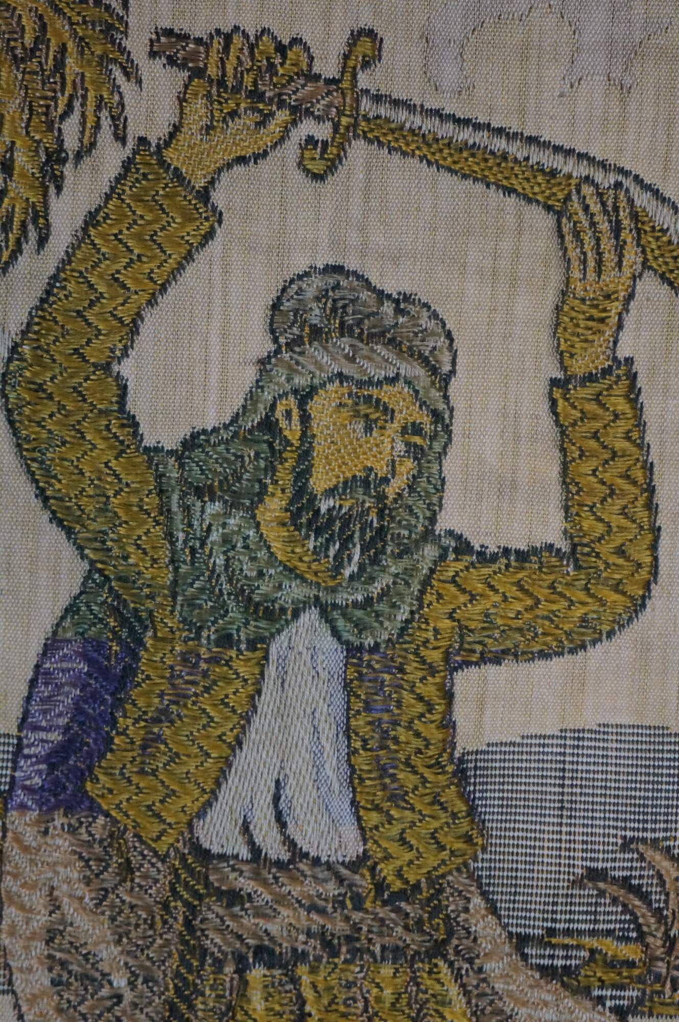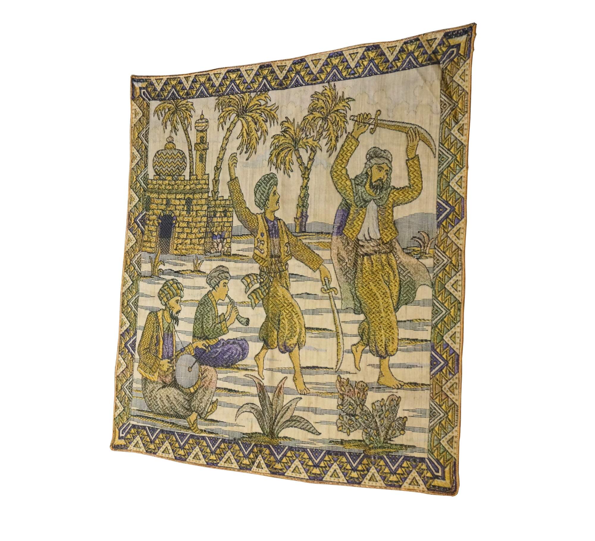 Late 20th century machine embroidered decorative tapestry in purple, green, and gold, depicting a scene of Middle Eastern / Moorish / Moroccan musicians and men dancing with swords against a desert landscape with castle.