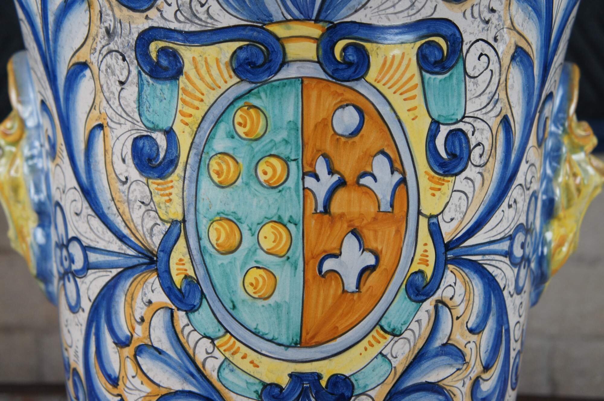 A beautiful 20th-century jardiniere by Deruta pottery. Features a hand-painted polychrome finish with elegant scrolling foliate motifs, figural northwind faces, and a shield or crest along the front.