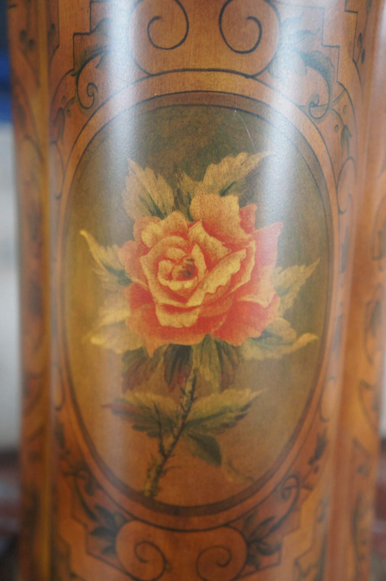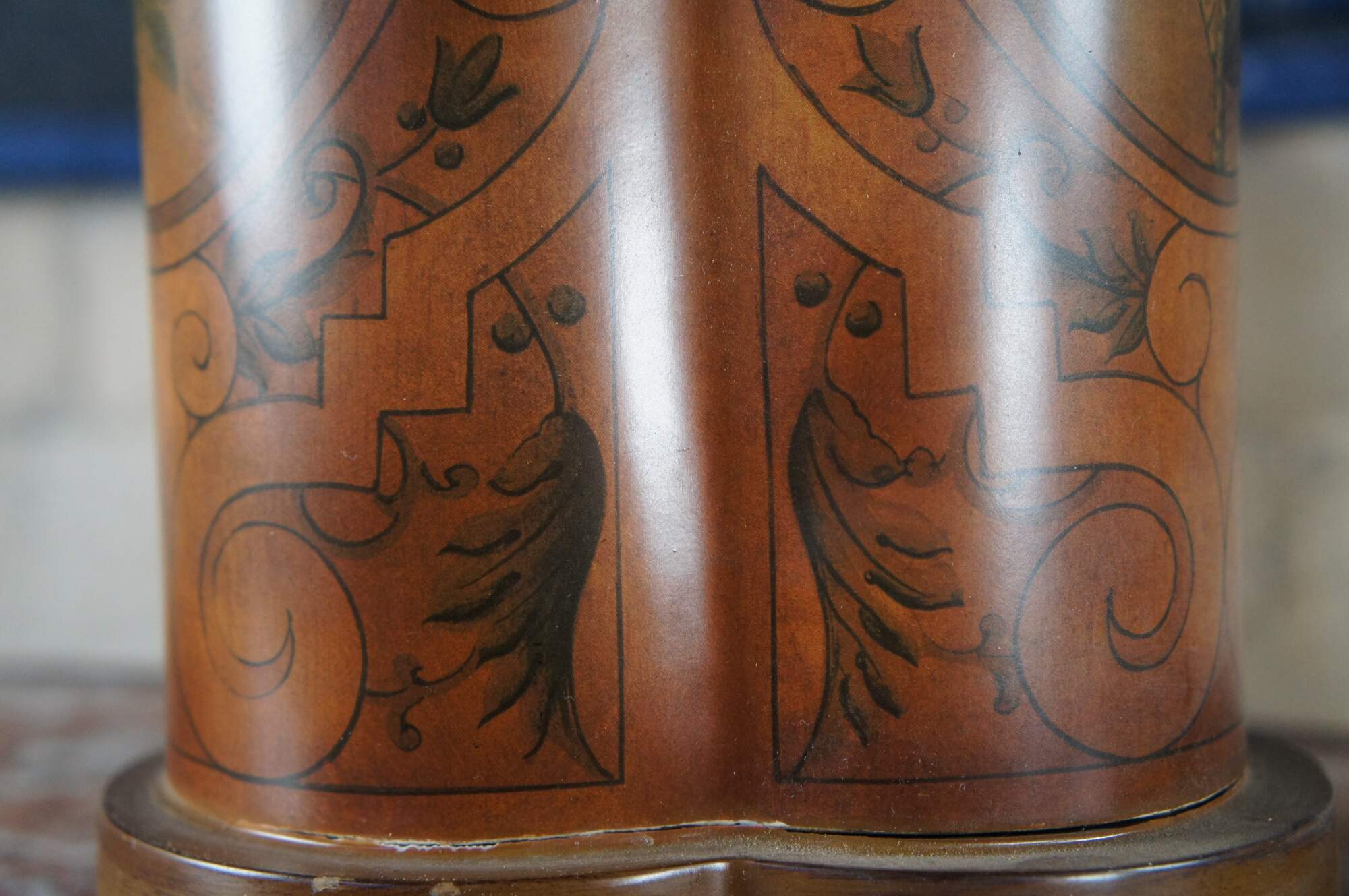 Pair of two vintage Chinese trefoil-shaped mantel urns / planters / jardinieres featuring a tole-style Neoclassical and Grecian theme with acanthus leaves and columns with a central rose medallion.