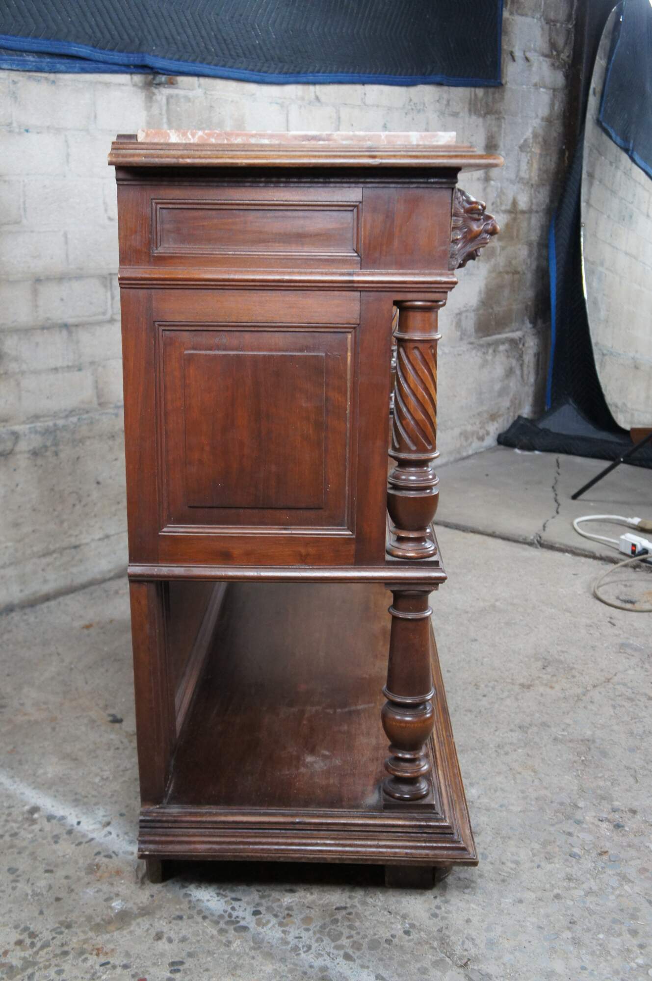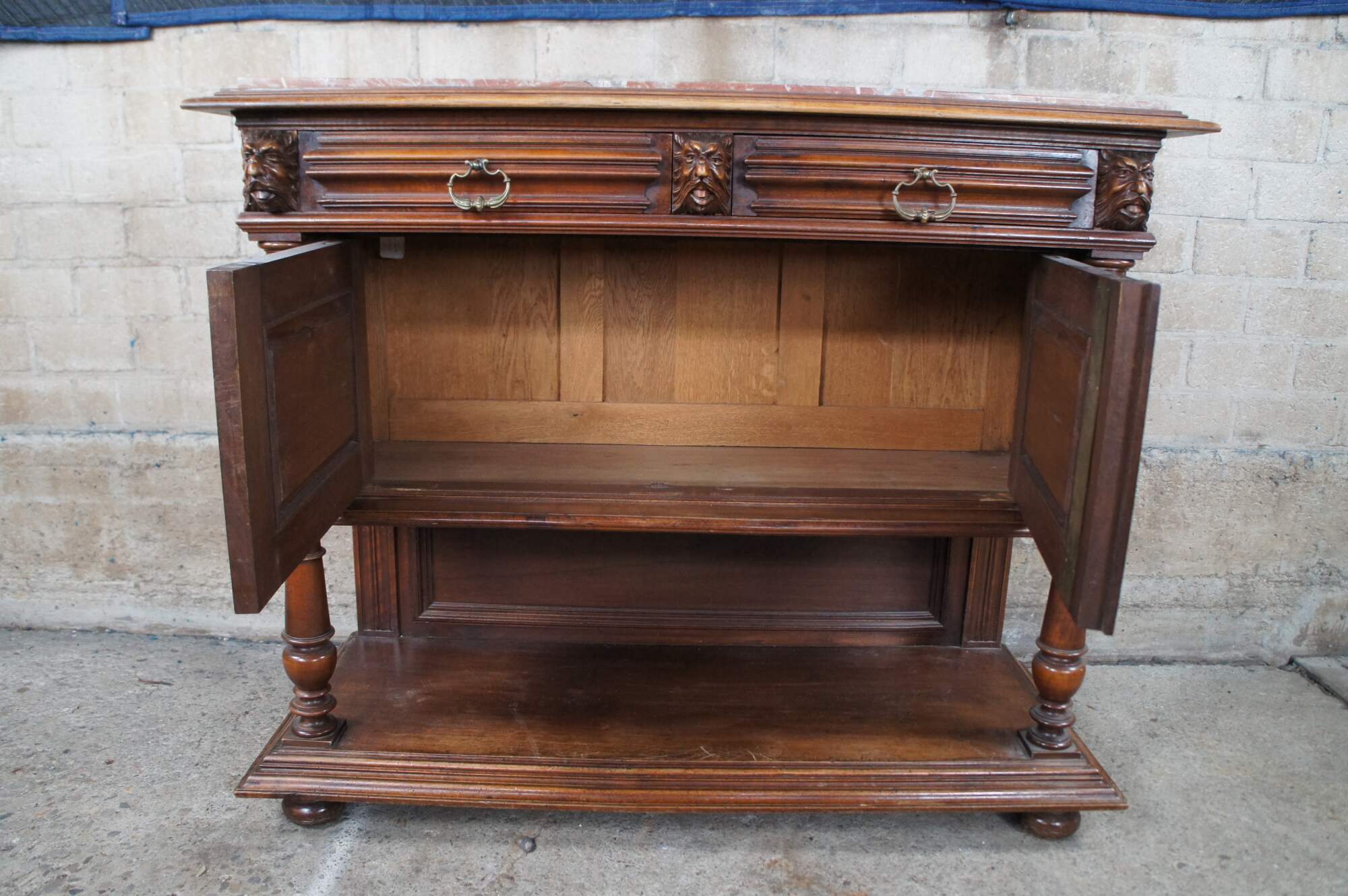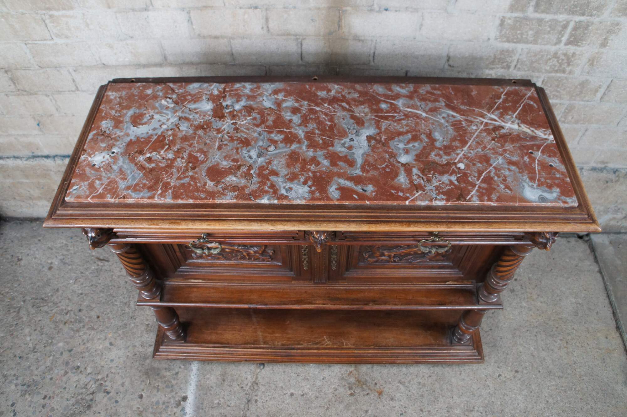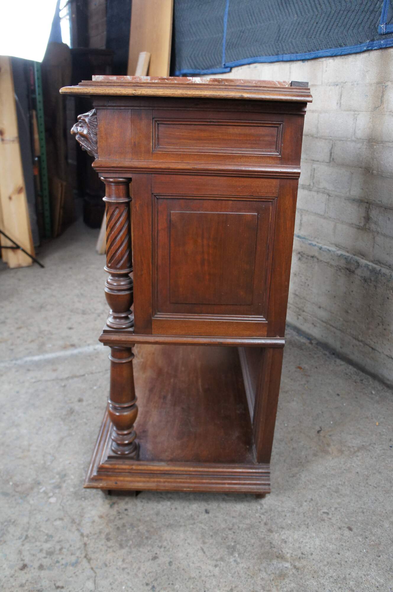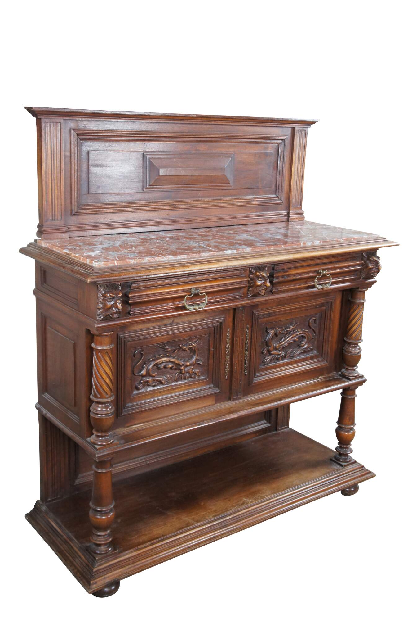 Antique French Renaissance / Gothic Revival cabinet / sideboard / buffet / bar / server. Made of walnut featuring Rouge marble top with paneled backsplash over two drawers and lower cabinet supported by turned columns, and accented by carved Northwind faces and dragons/ serpents.