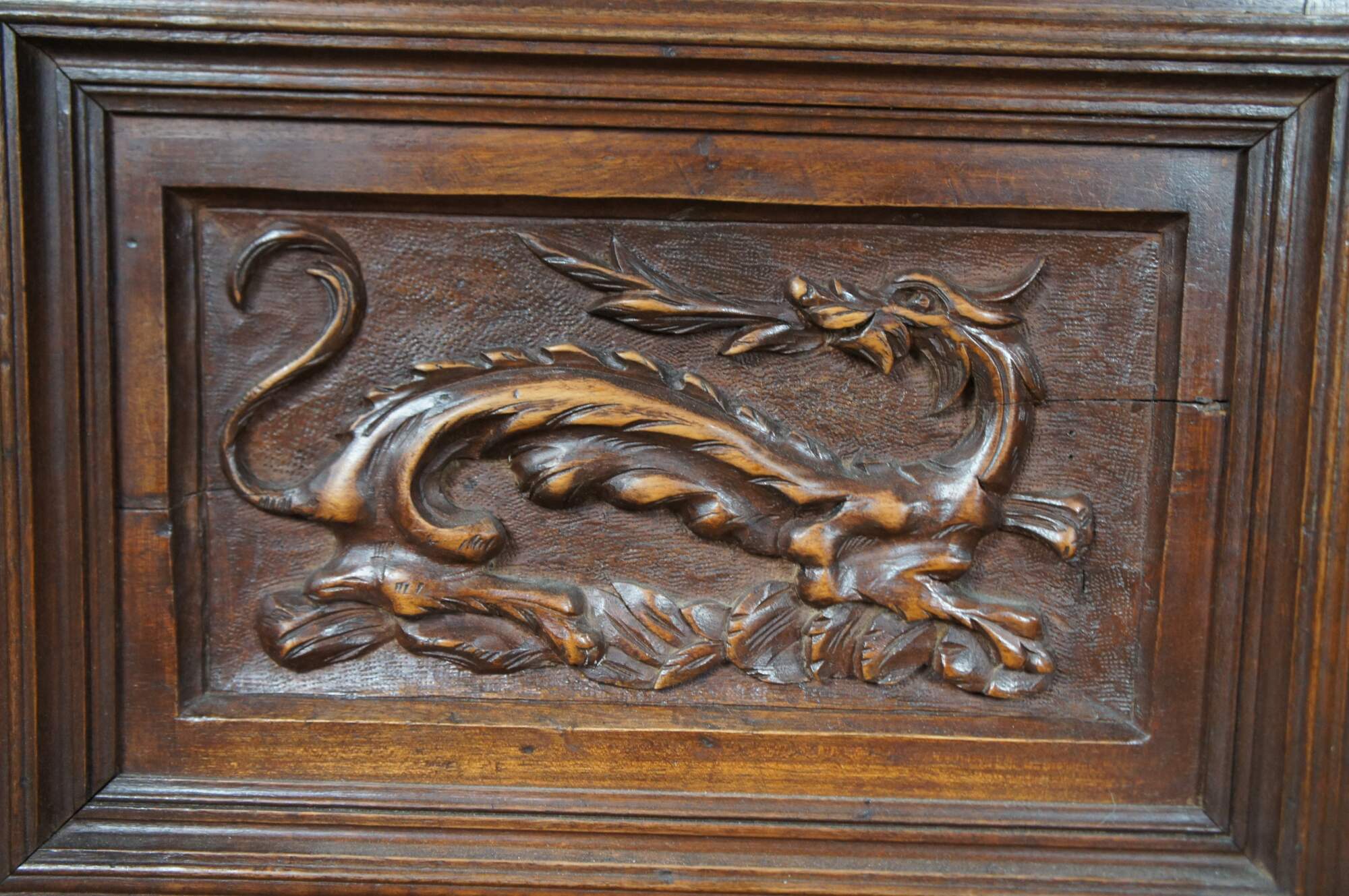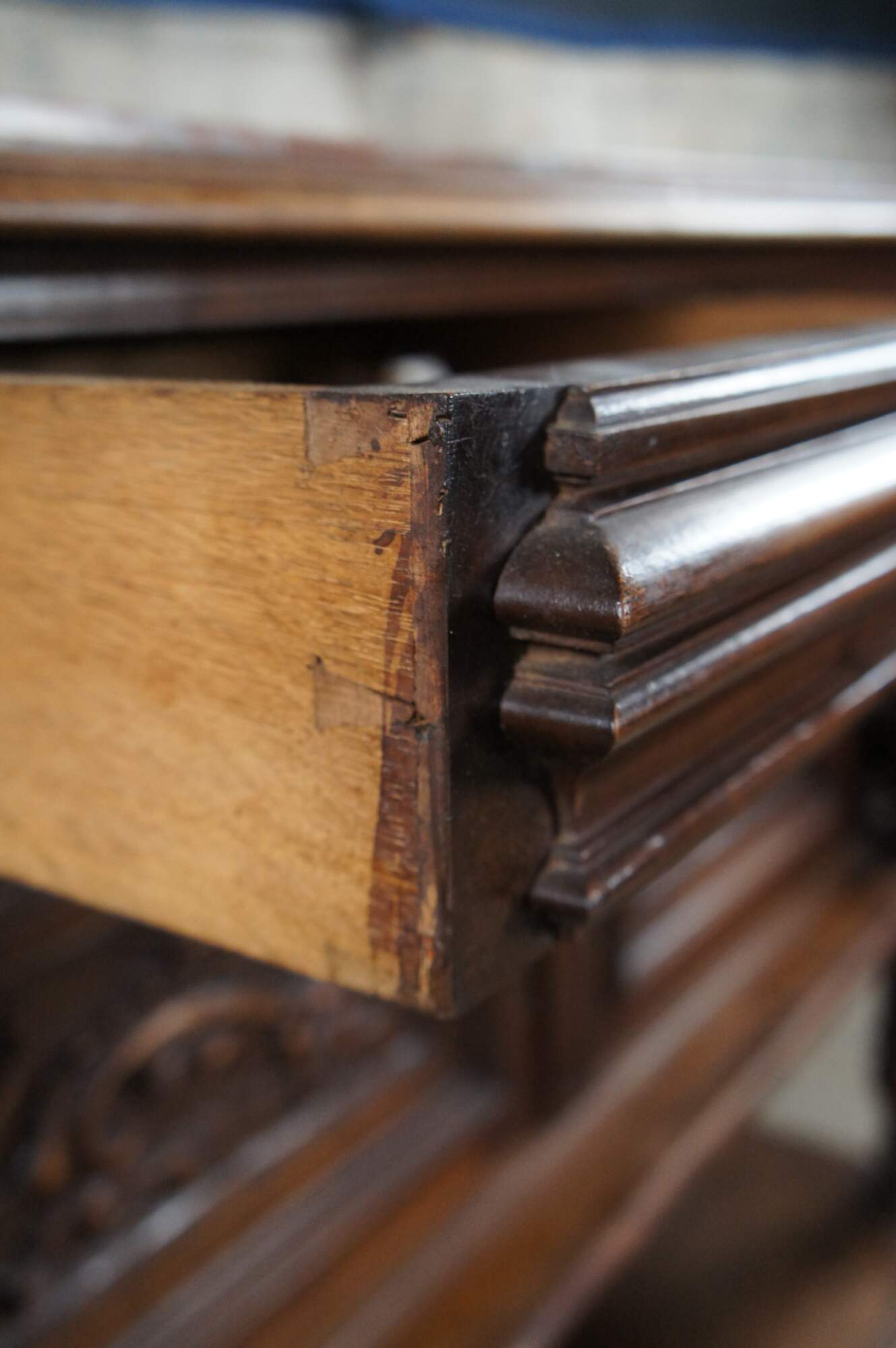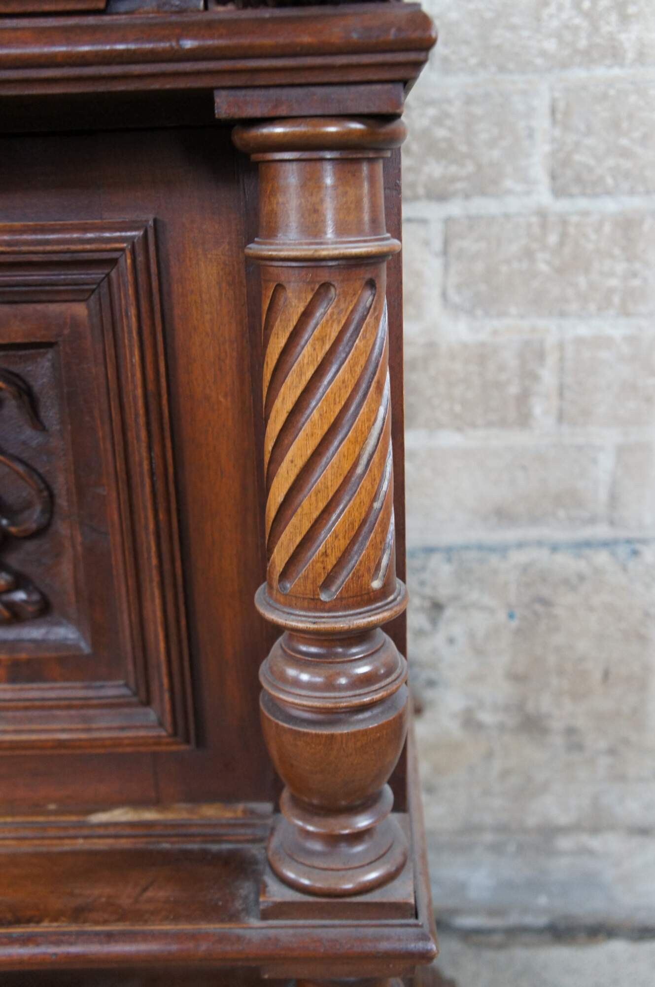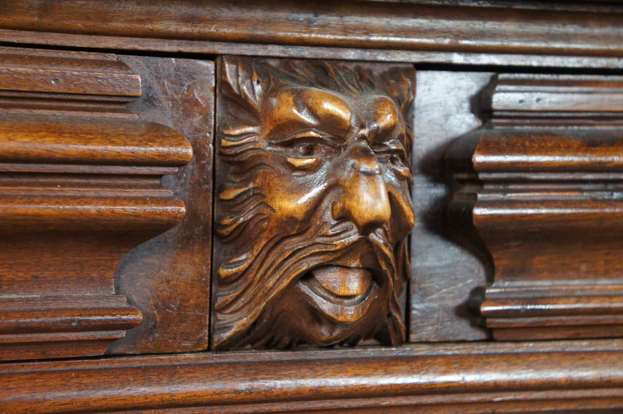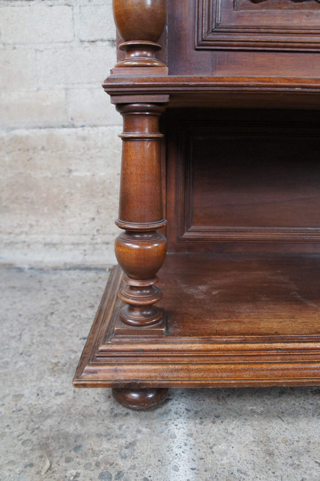 Antique French Renaissance / Gothic Revival cabinet / sideboard / buffet / bar / server. Made of walnut featuring Rouge marble top with paneled backsplash over two drawers and lower cabinet supported by turned columns, and accented by carved Northwind faces and dragons/ serpents.
