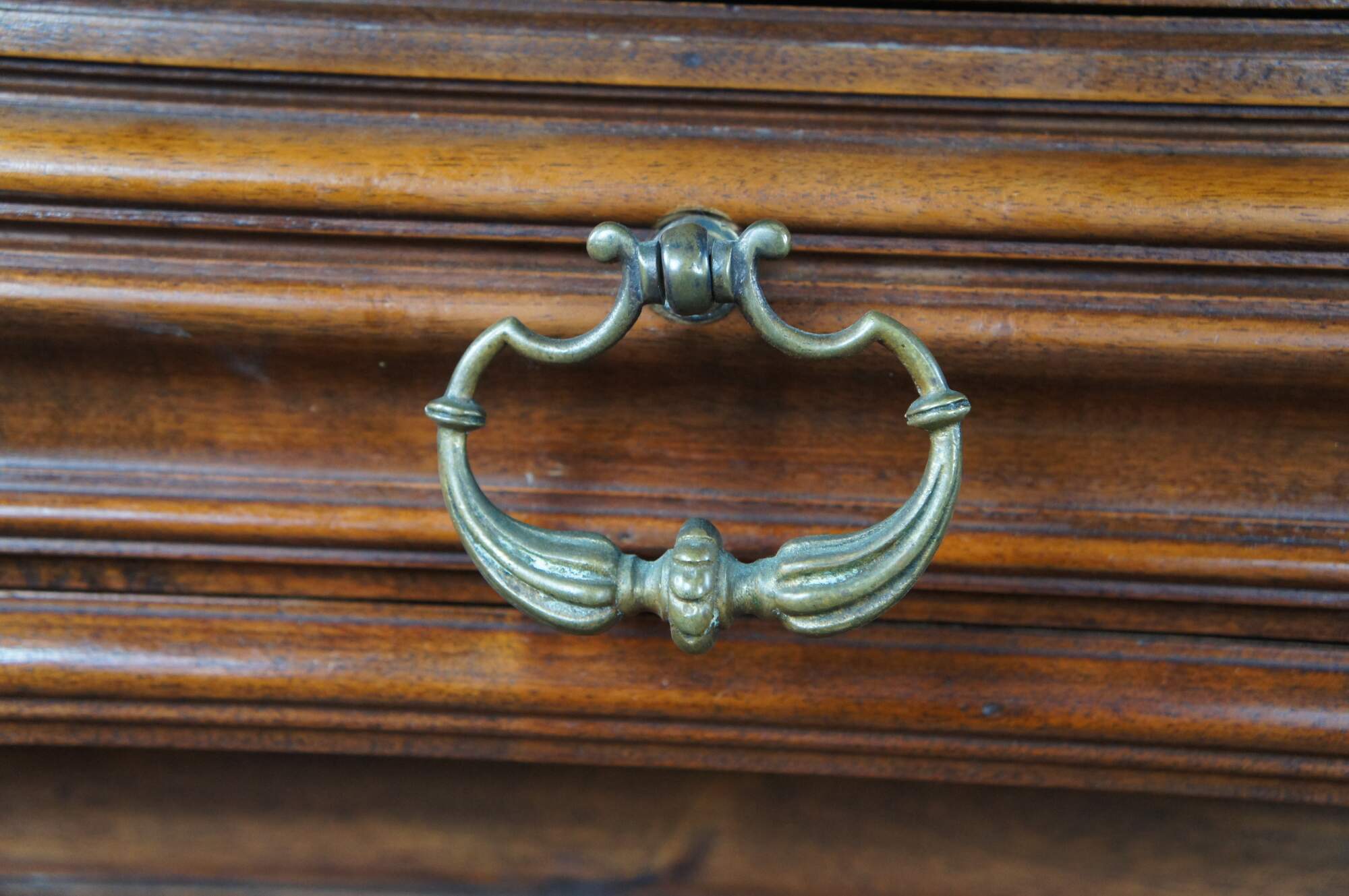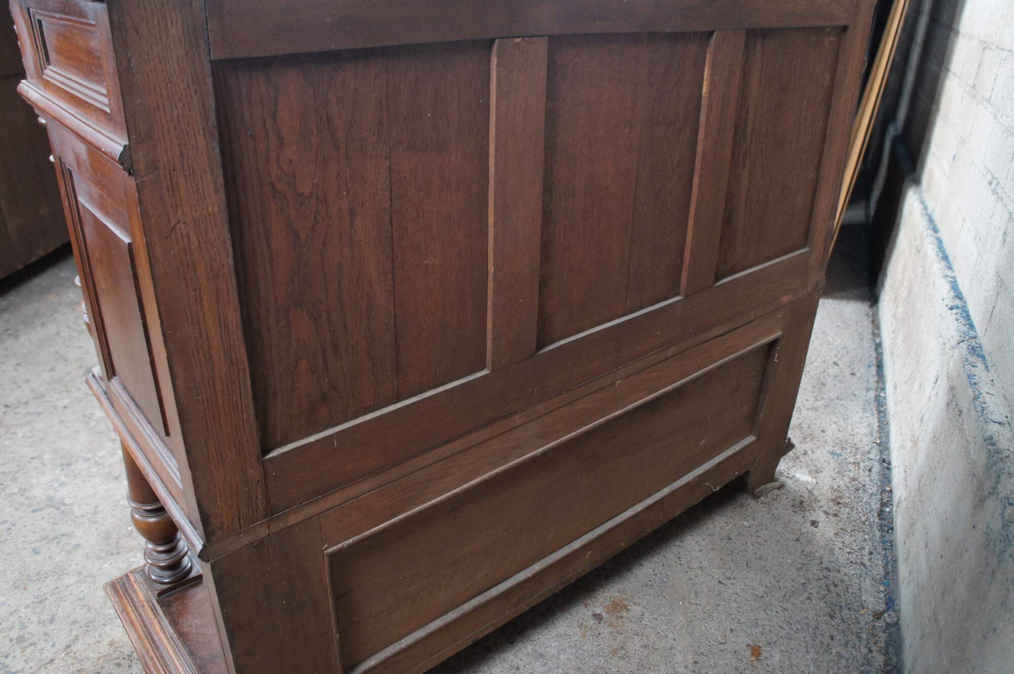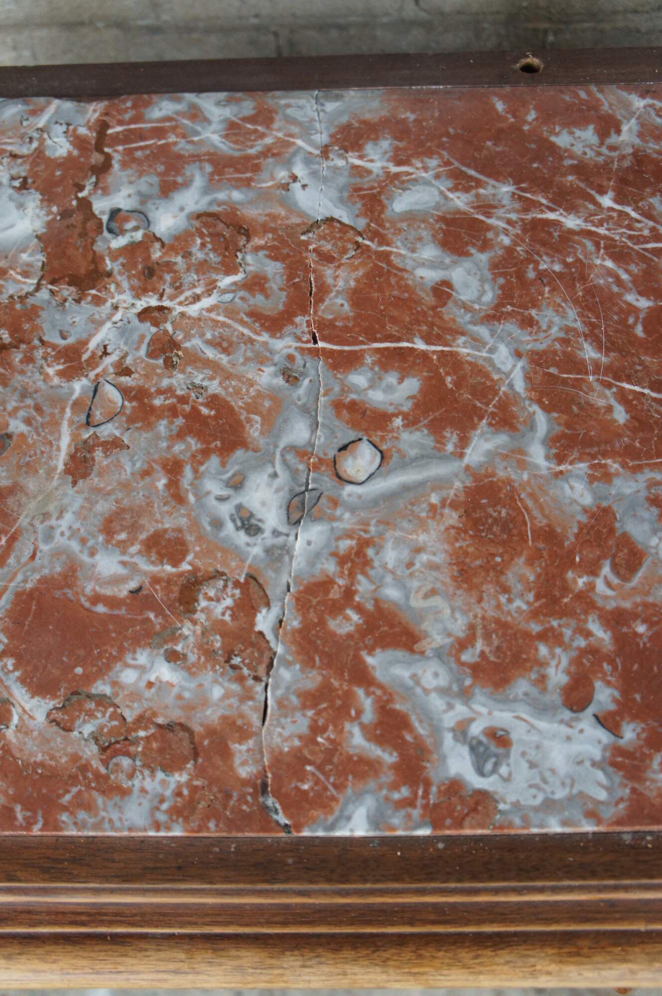 Fair condition, wear and distressing from age and use, very good structurally. This cabinet used to be a hutch, but is missing the top cabinet and supports. Marble is cracked, and has holes where supports used to be. A piece of mold is missing on the right side of the backsplash, and there is no key.