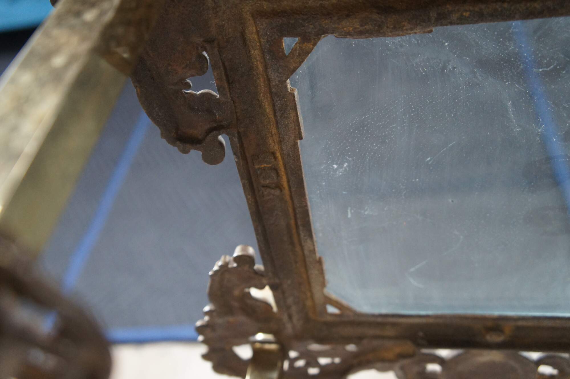 Fair condition, wear and distressing from age and use, slight leaning to shelves, pitting / oxidation to brass. Assembly required for safe shipping.