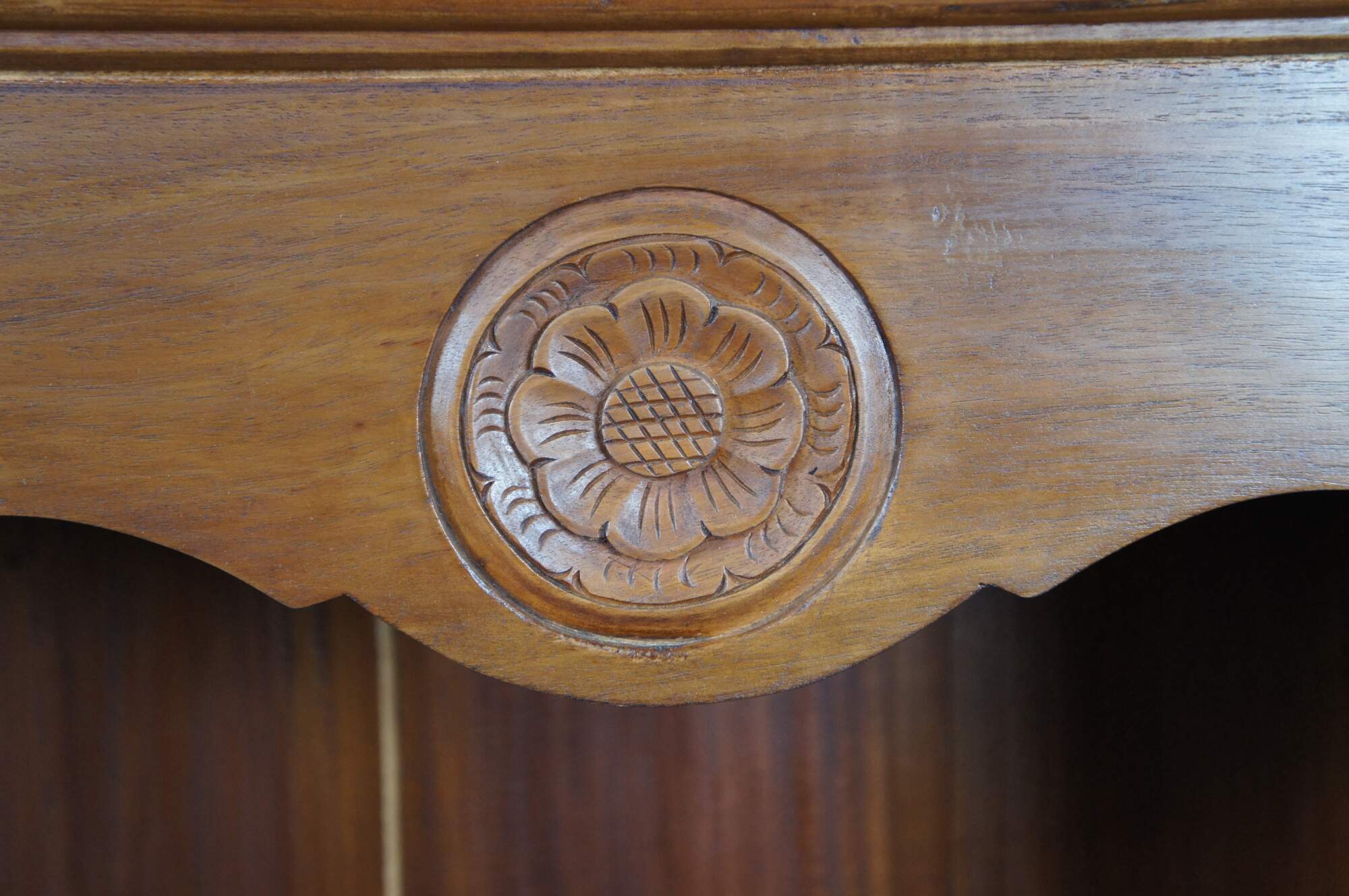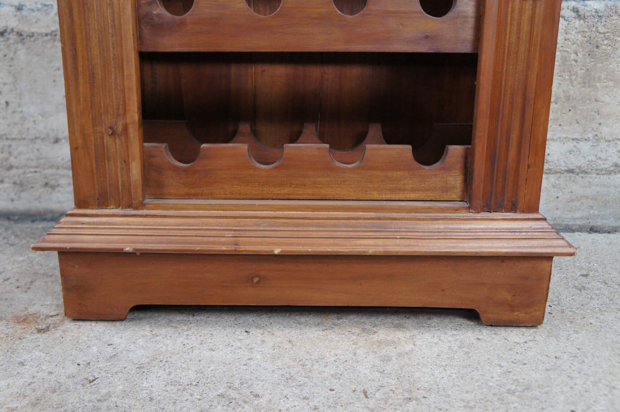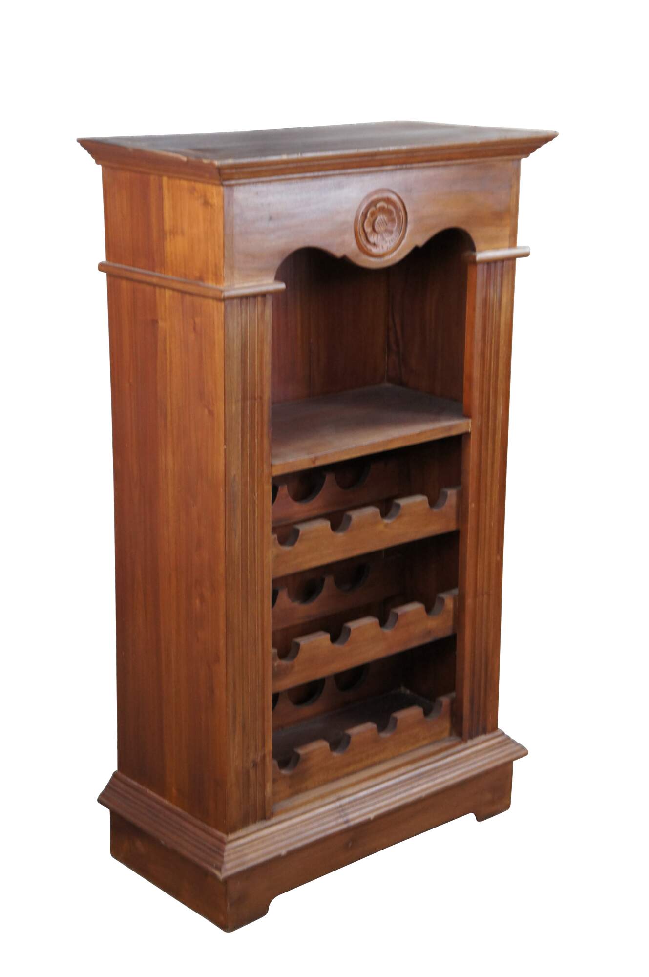Vintage wine storage rack / stand / pedestal / bar cabinet featuring rectangular form with carved floral medallion, twelve bottle rack, storage shelf / cubby and fluted accents.