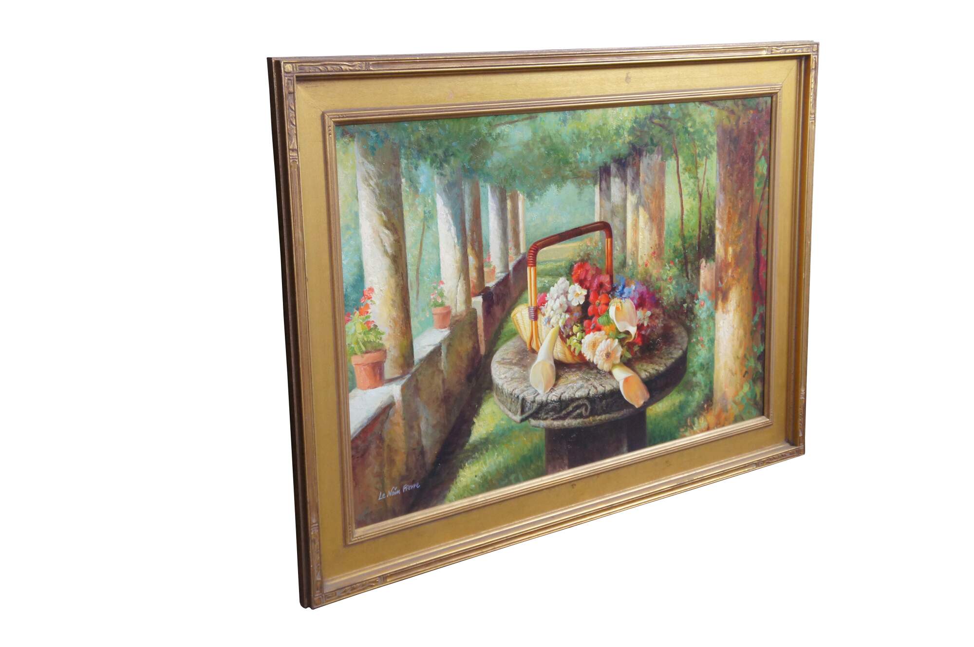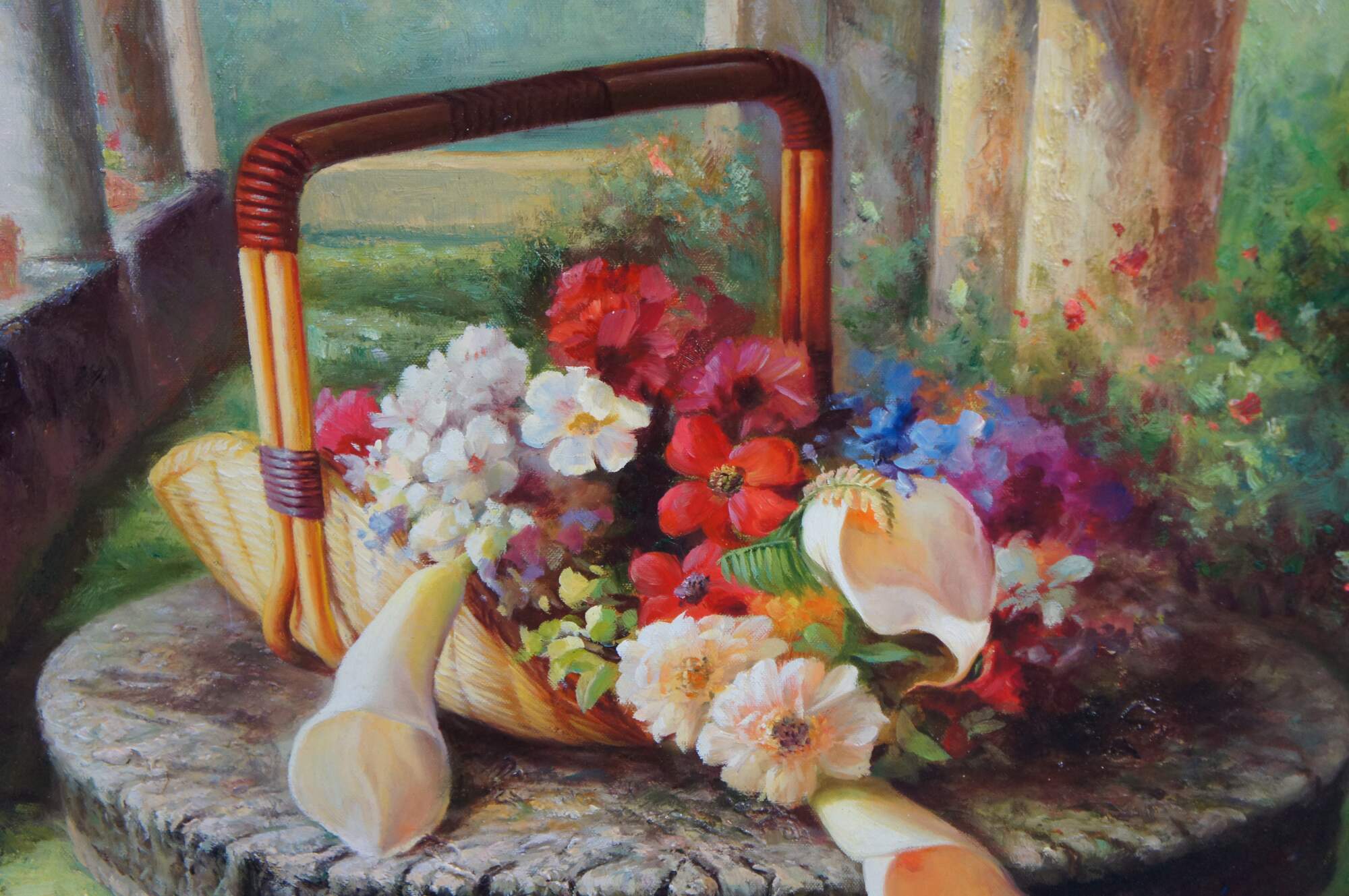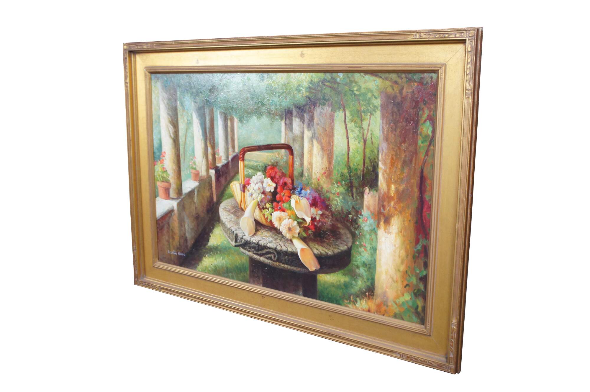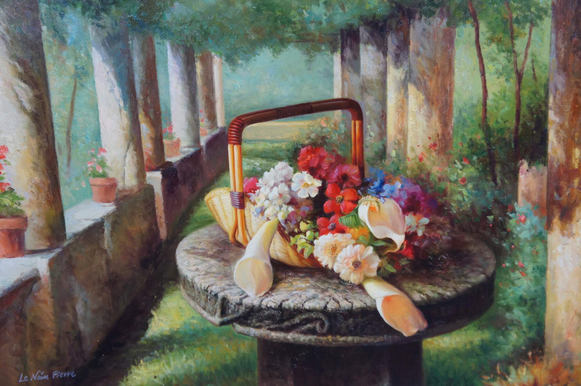 Vintage Le Nain Pierre still life oil painting on canvas featuring an impressive French garden scene with columns, trellis, and a basket of flowers.